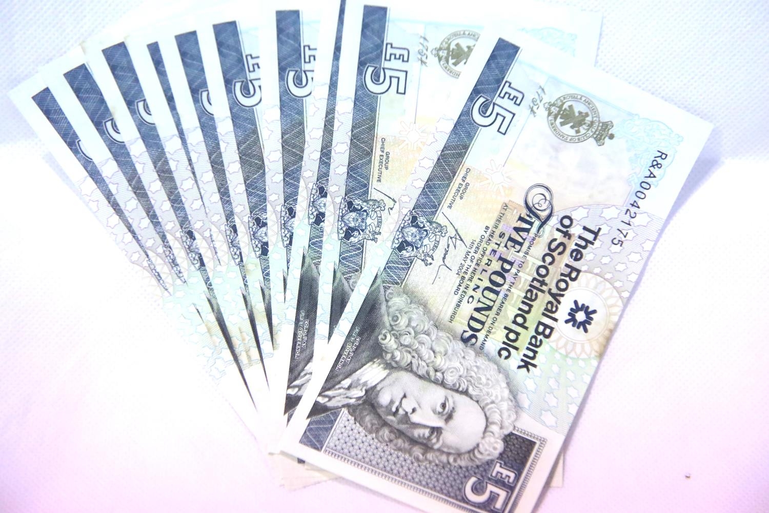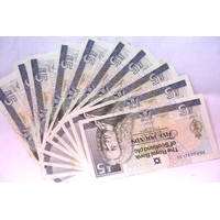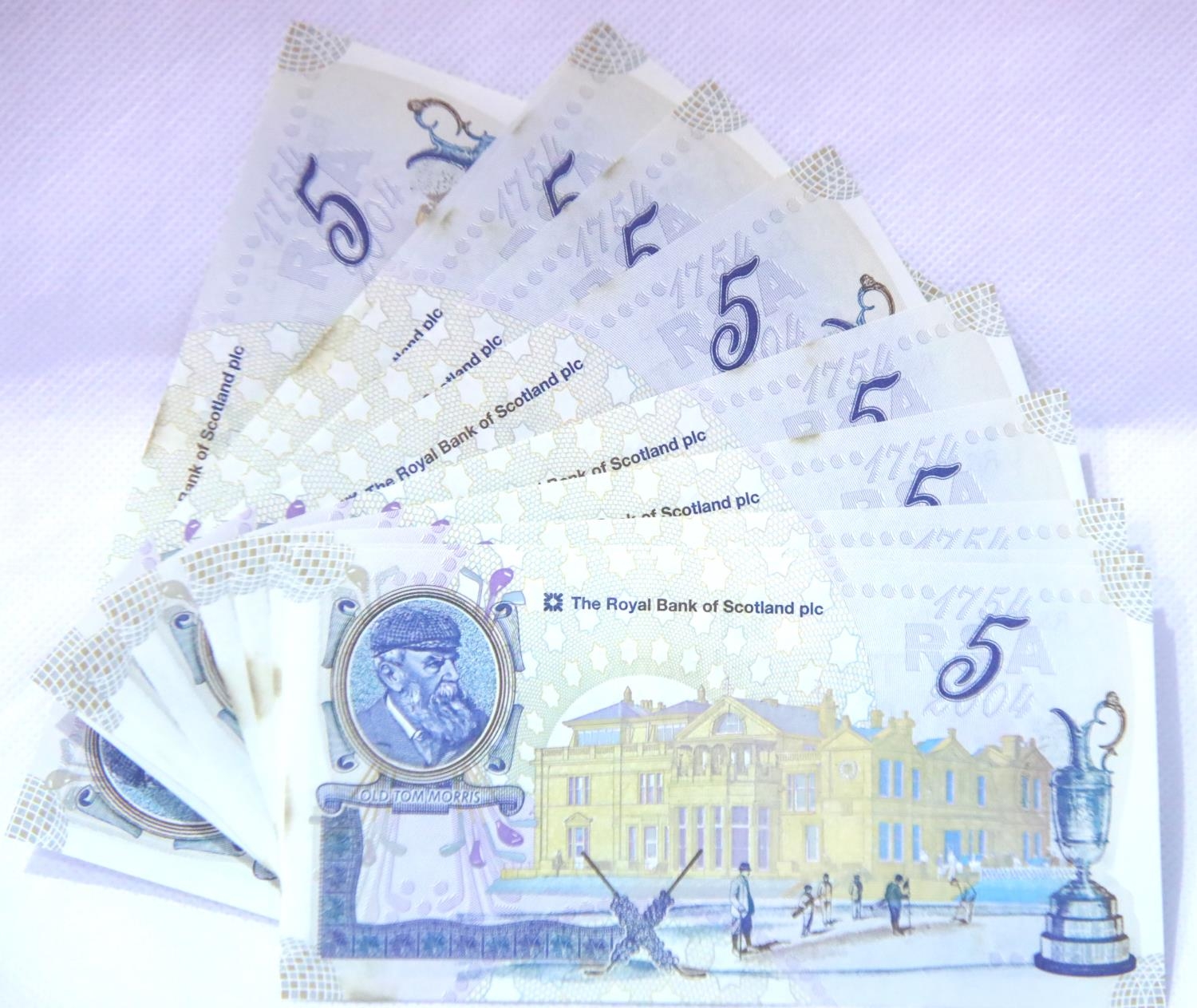 Ten Royal and ancient RBS £5 notes. P&P Group 1 (£14+VAT for the first lot and £1+VAT for subsequent lots)