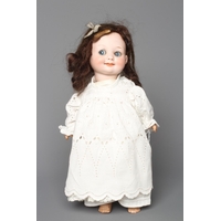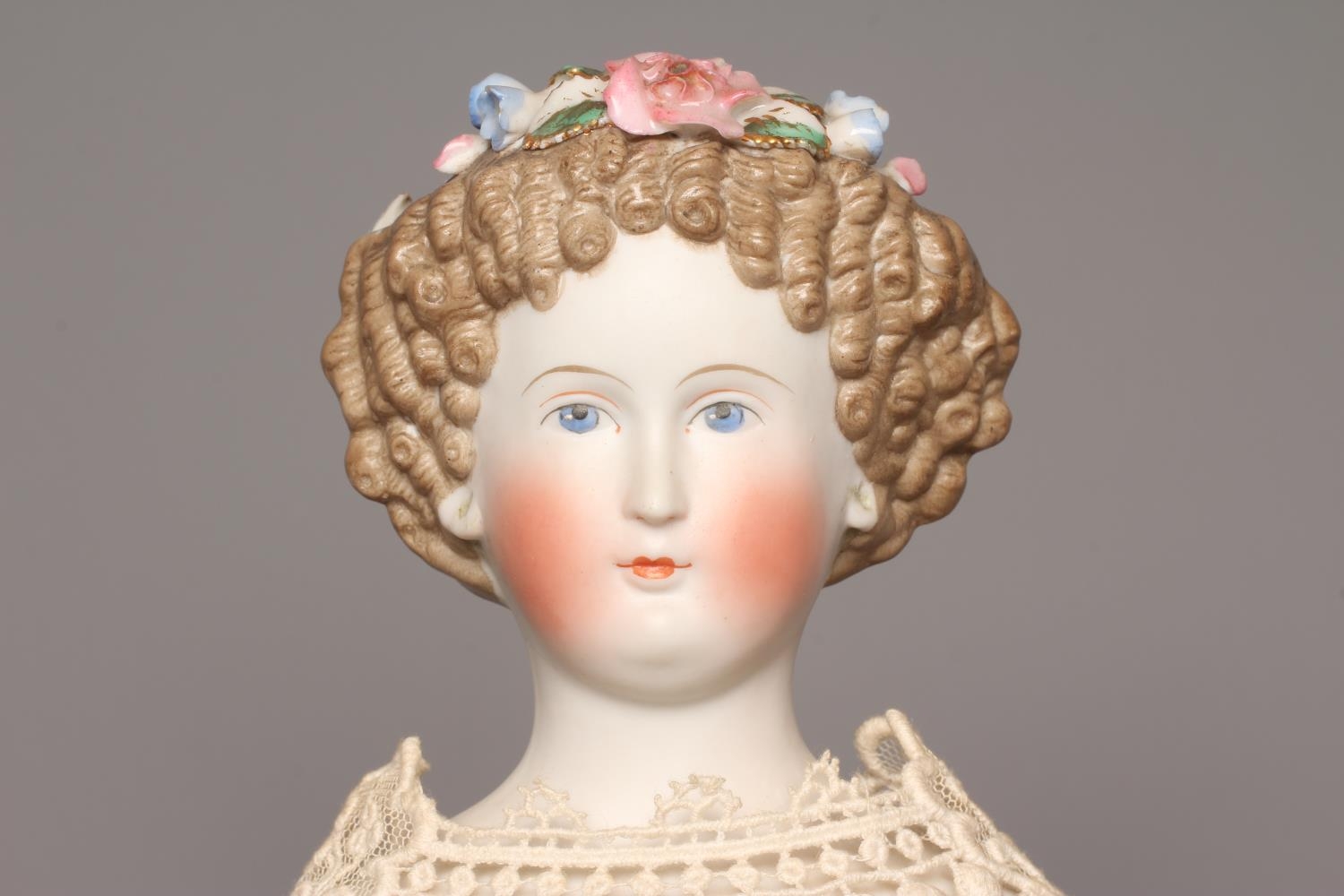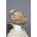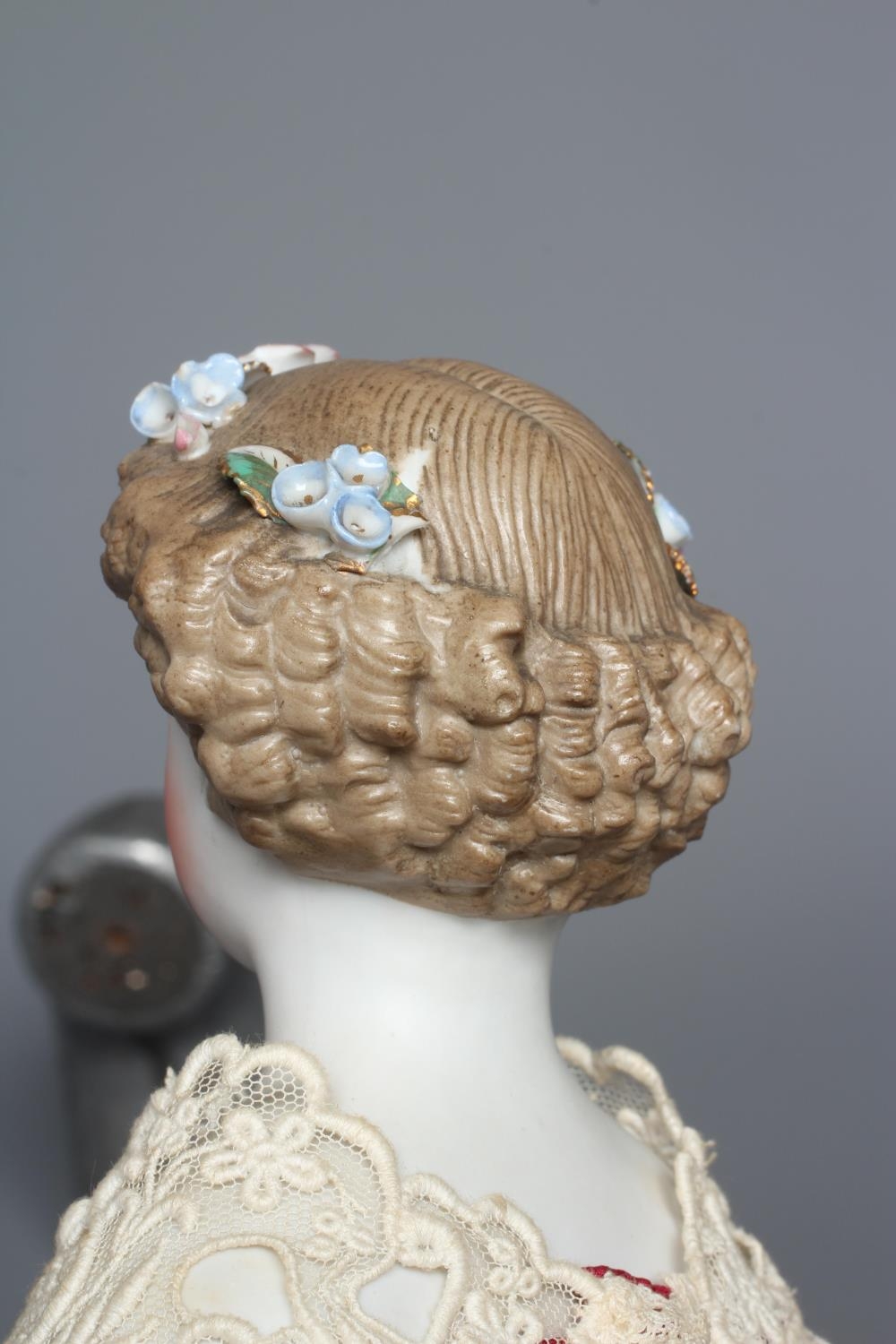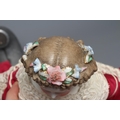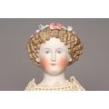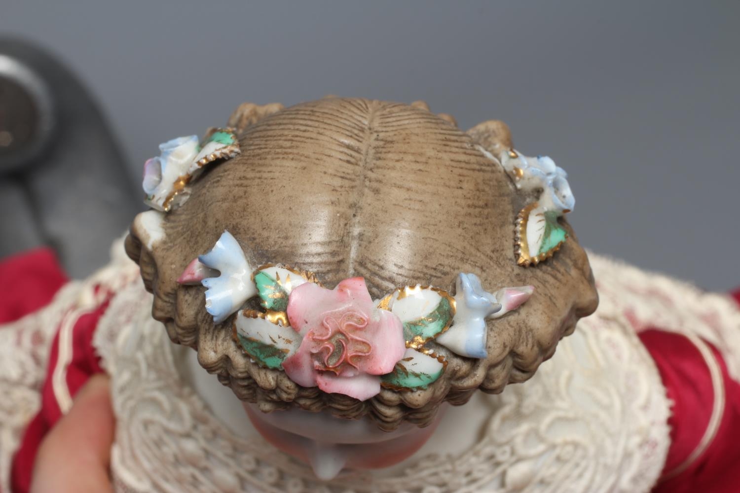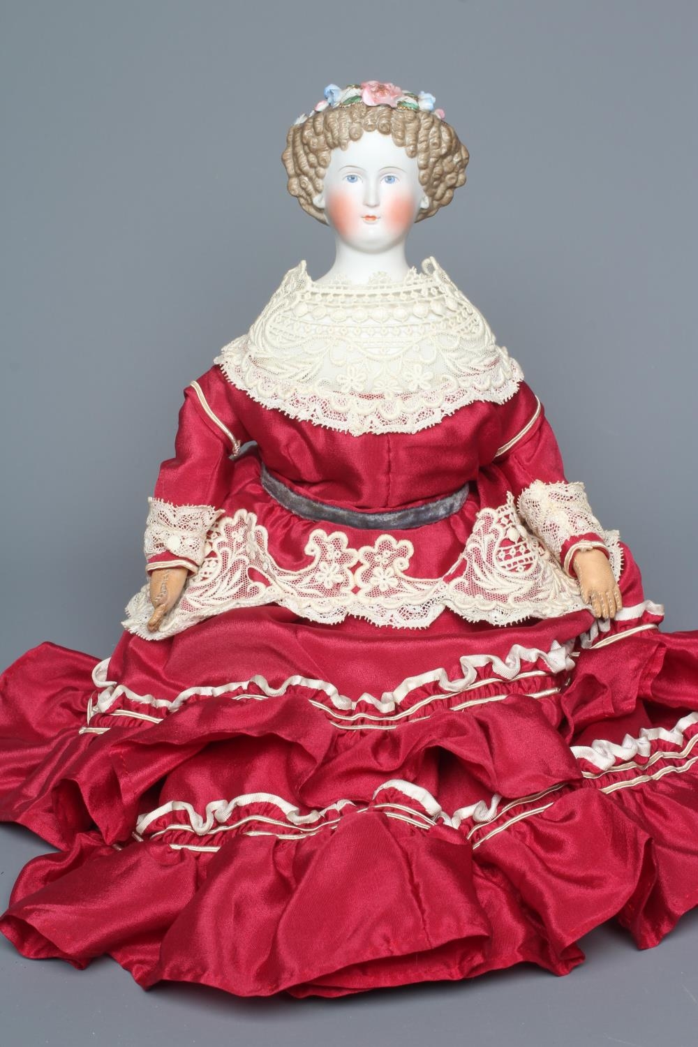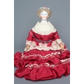 A bisque shoulder head doll, possibly Dornheim, with moulded hair encrusted with flowers, painted features, fabric body, kid lower limbs and lace trimmed red dress, 17" long