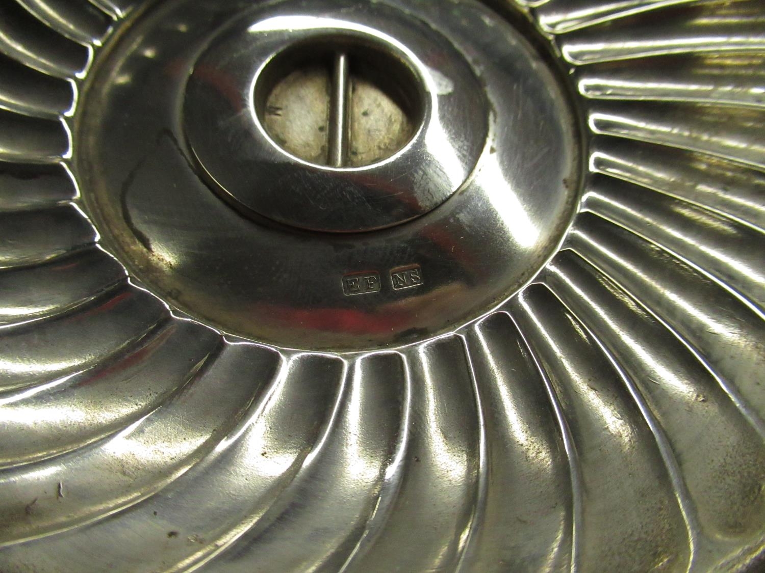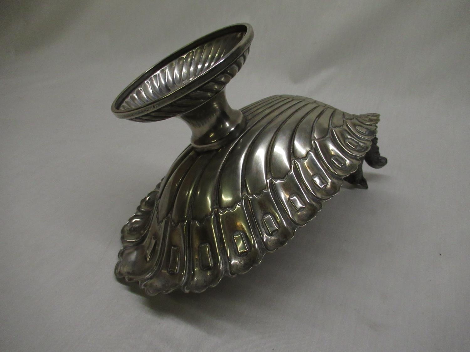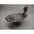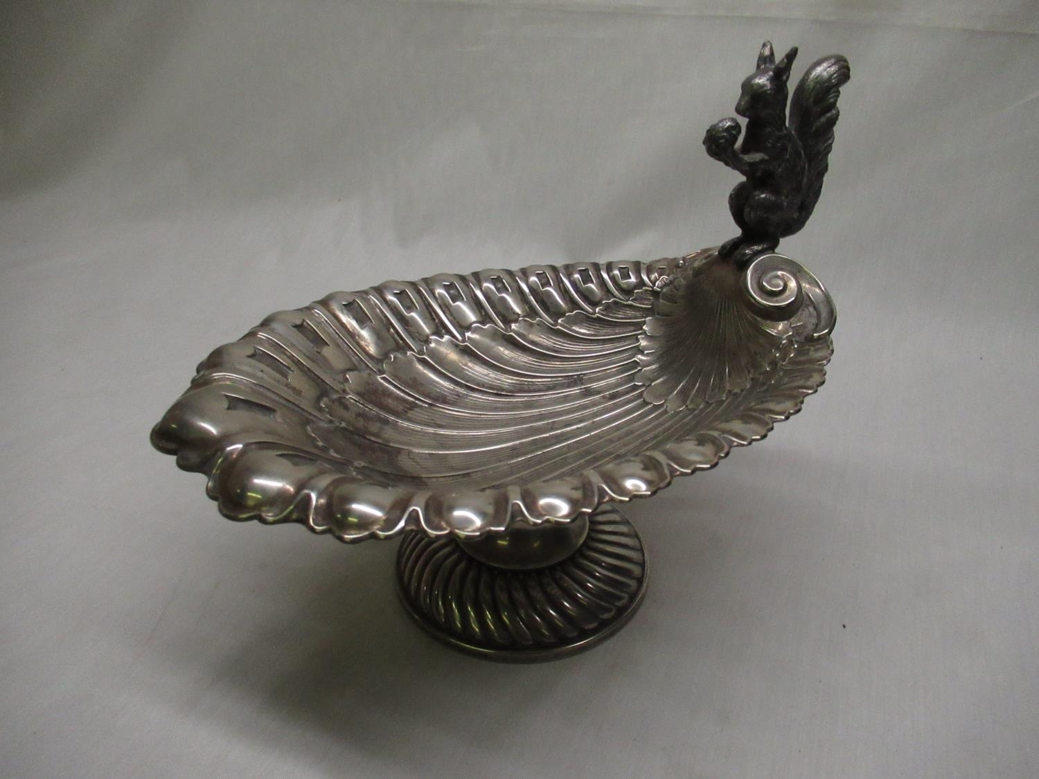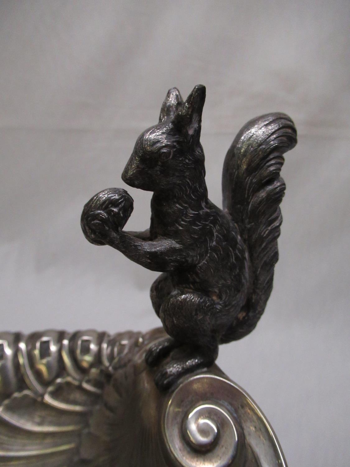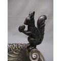 Silver plated shell shaped nut bowl, with decorative scroll shaped squirrel handle. H22cm L26cm