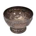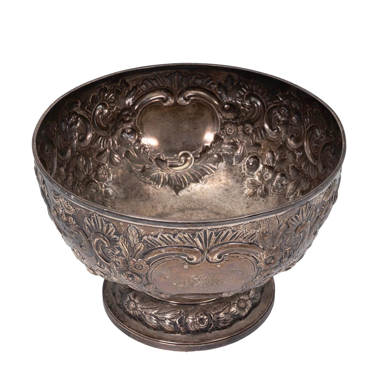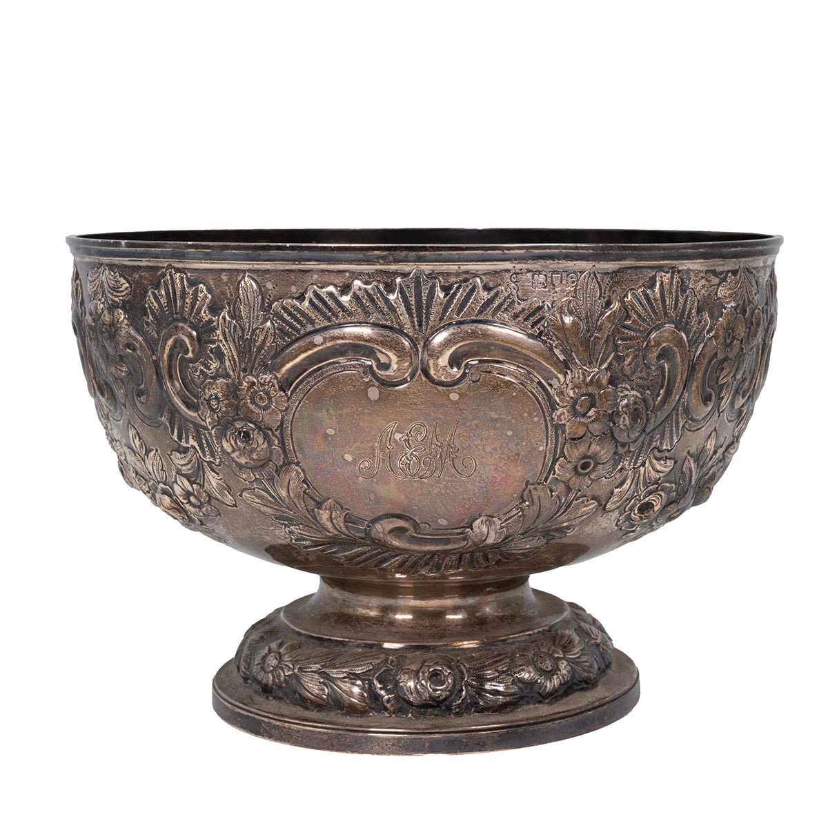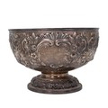 A silver bowl with embossed rose and foliate decorations, engraved cartouche to Arthur E Mills, on stepped and domed foliate decorated base, hallmarked London 1900, maker's mark rubbed. H15.5cm x W23cm gross weight 747 grams.
