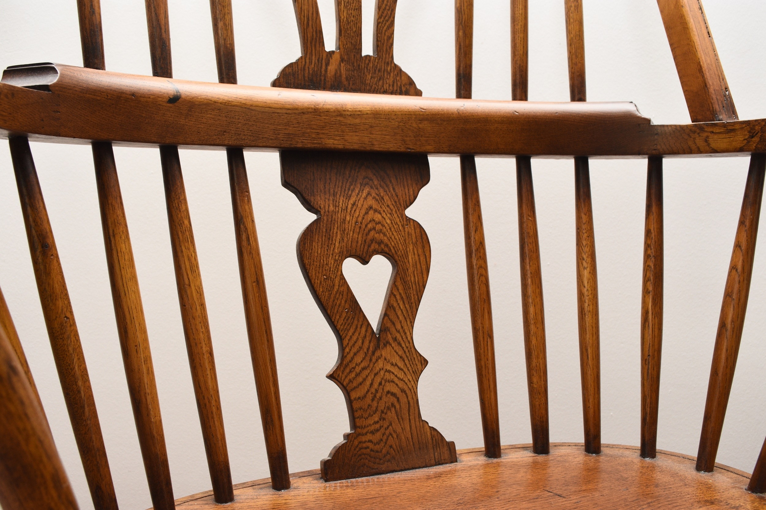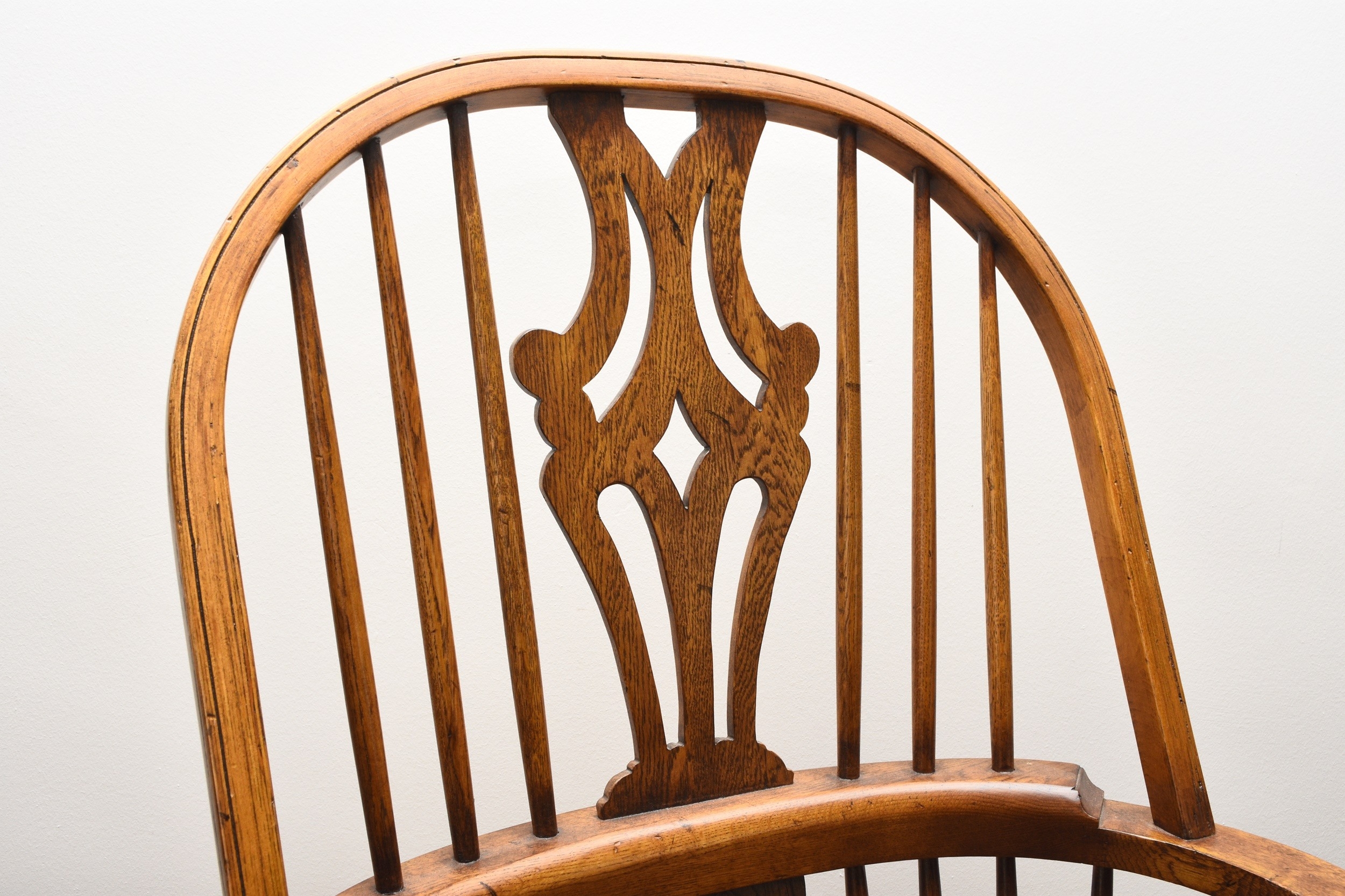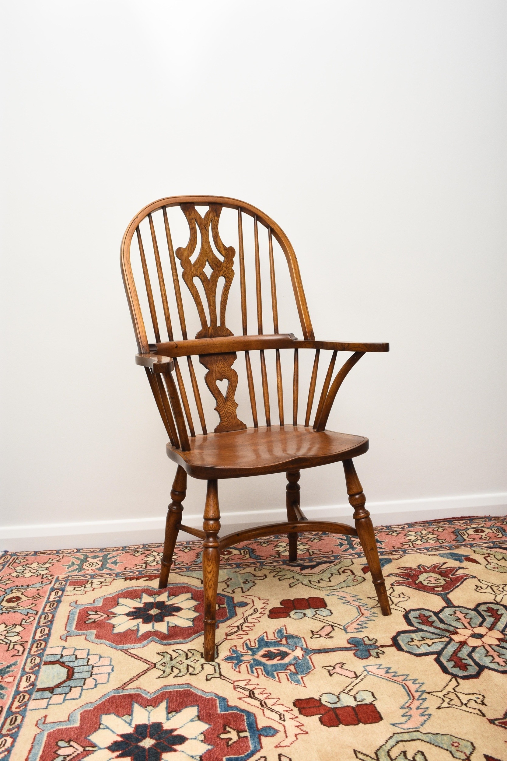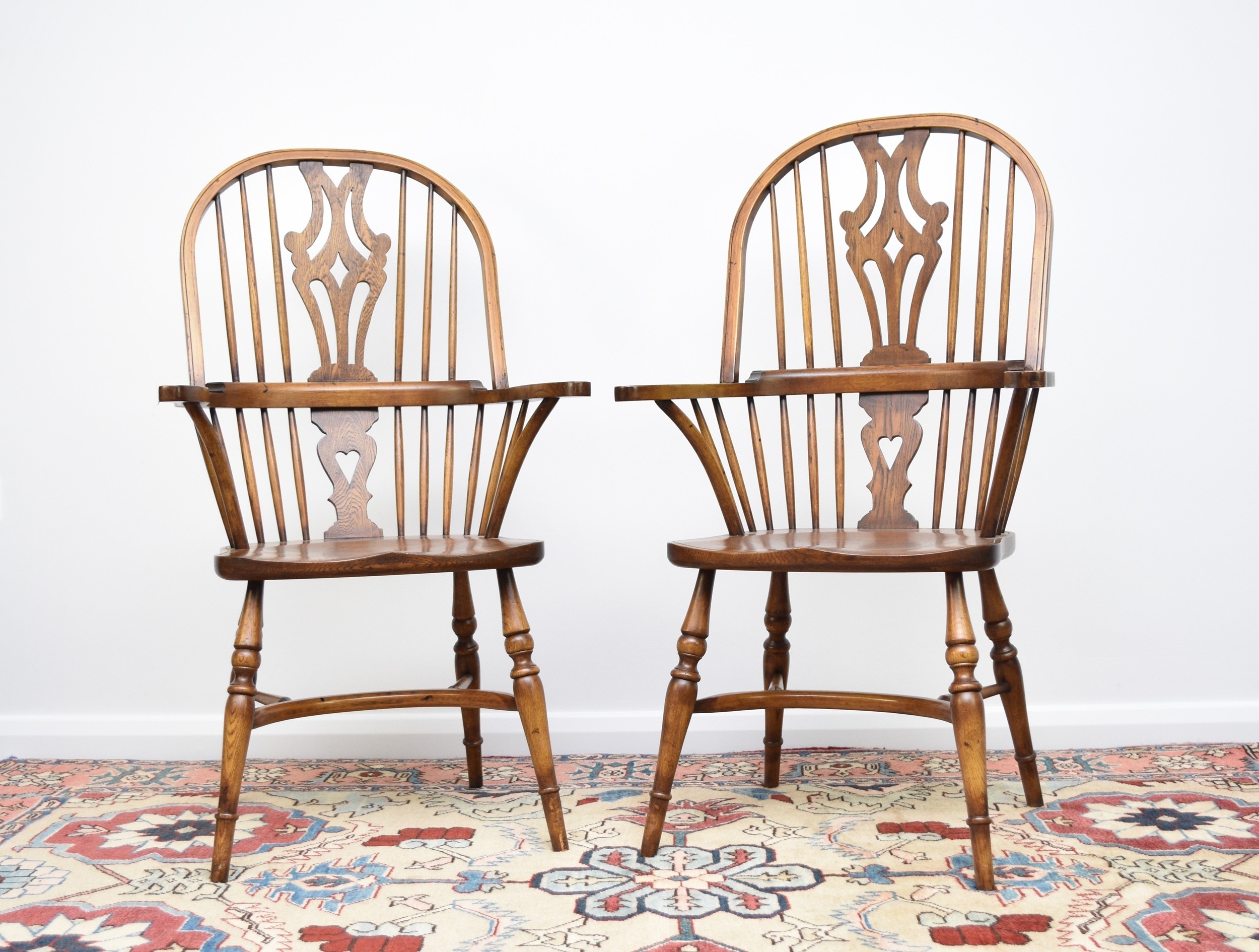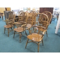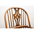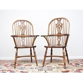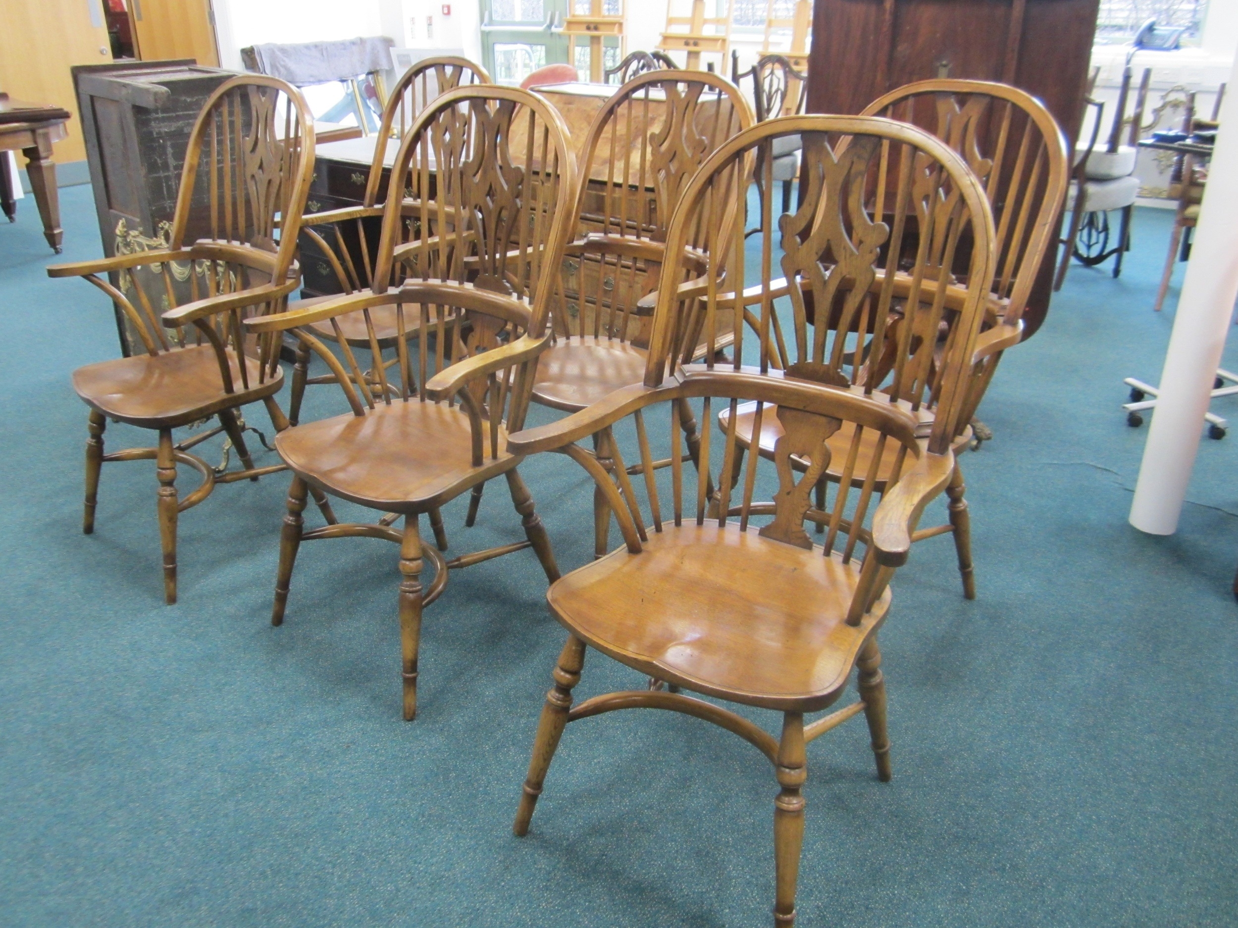 A set of six reproduction ash Windsor armchairs With shaped and pierced splats, the seats raised on turned supports united by crinoline stretchers. 66cm wide x 56cm deep x 116cm high, seat height 46cm (6) Condition:All in good sound condition. Negligible signs of age and use.