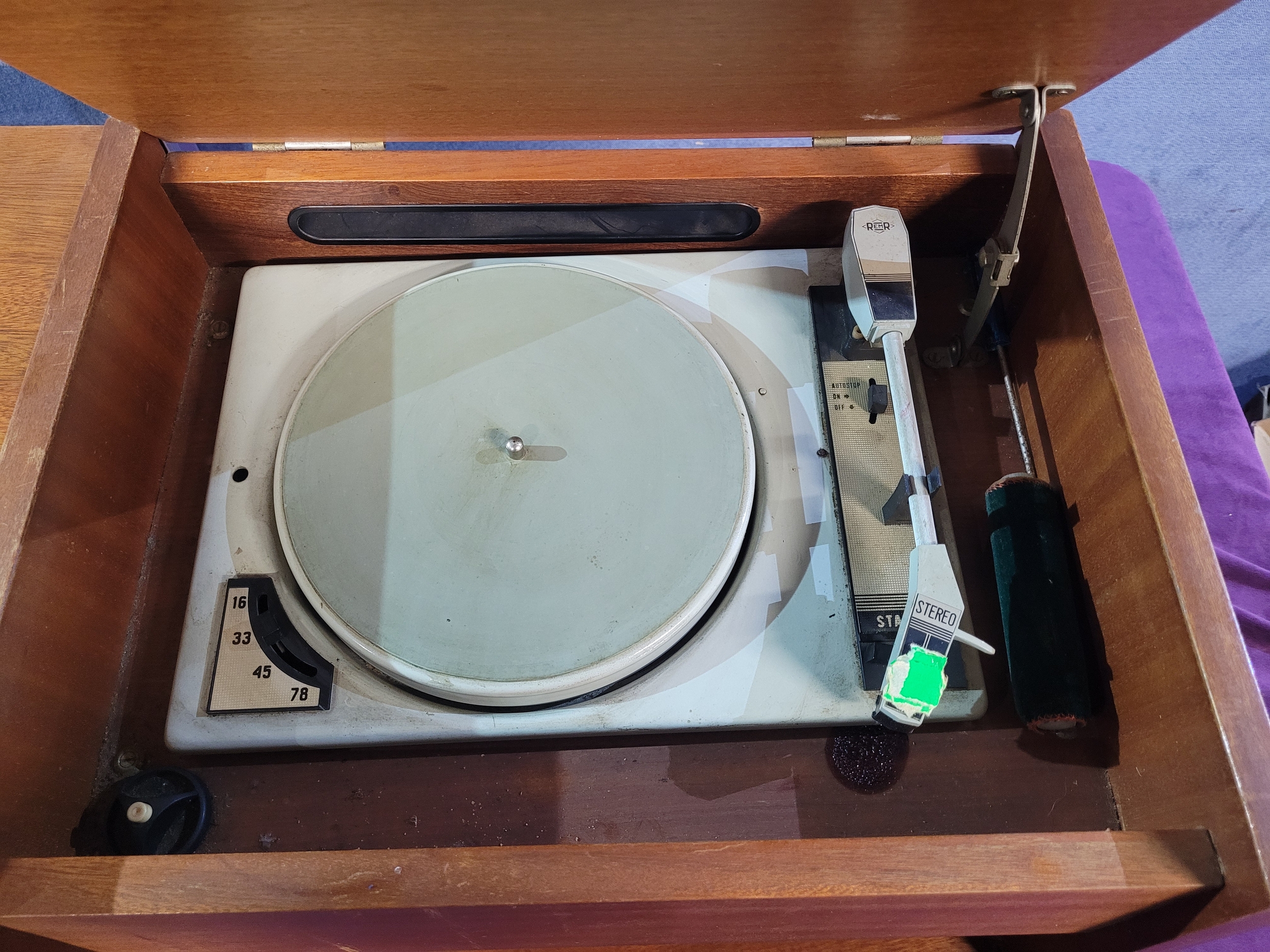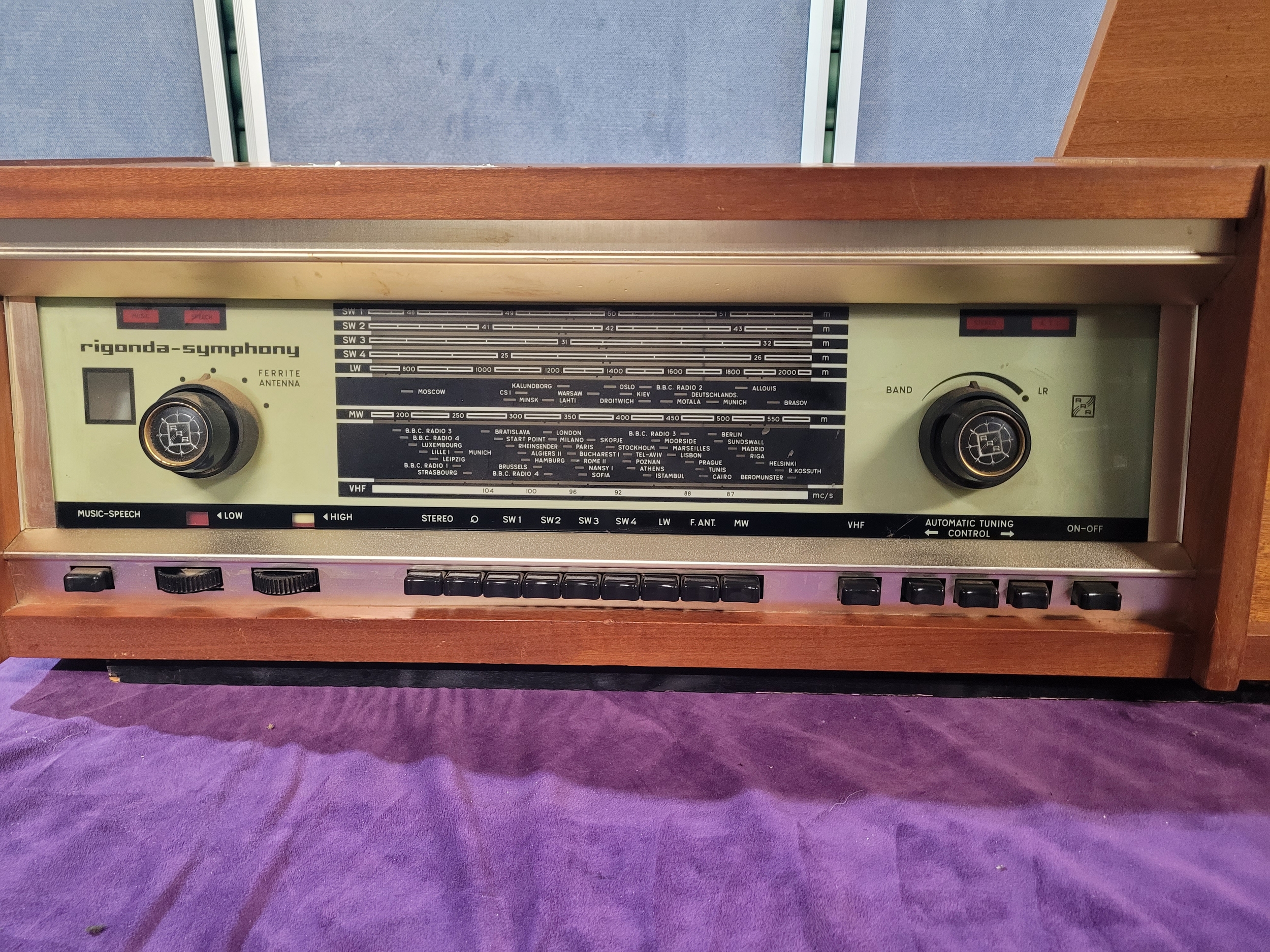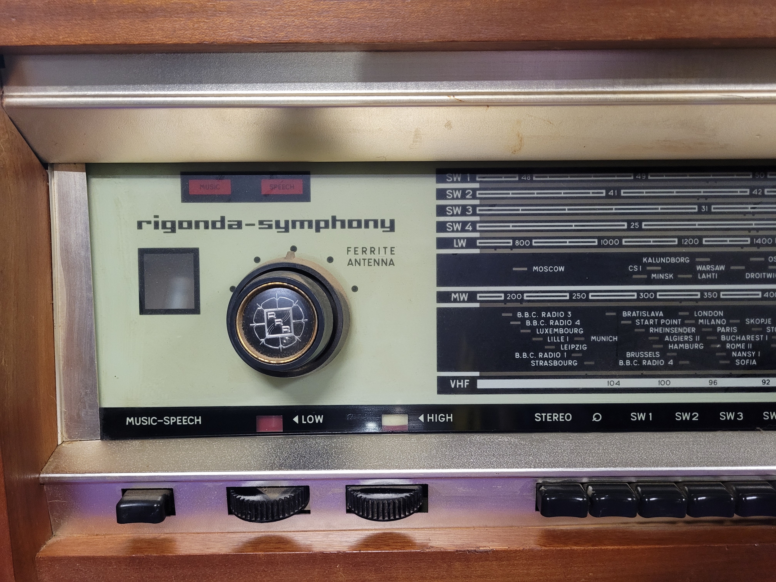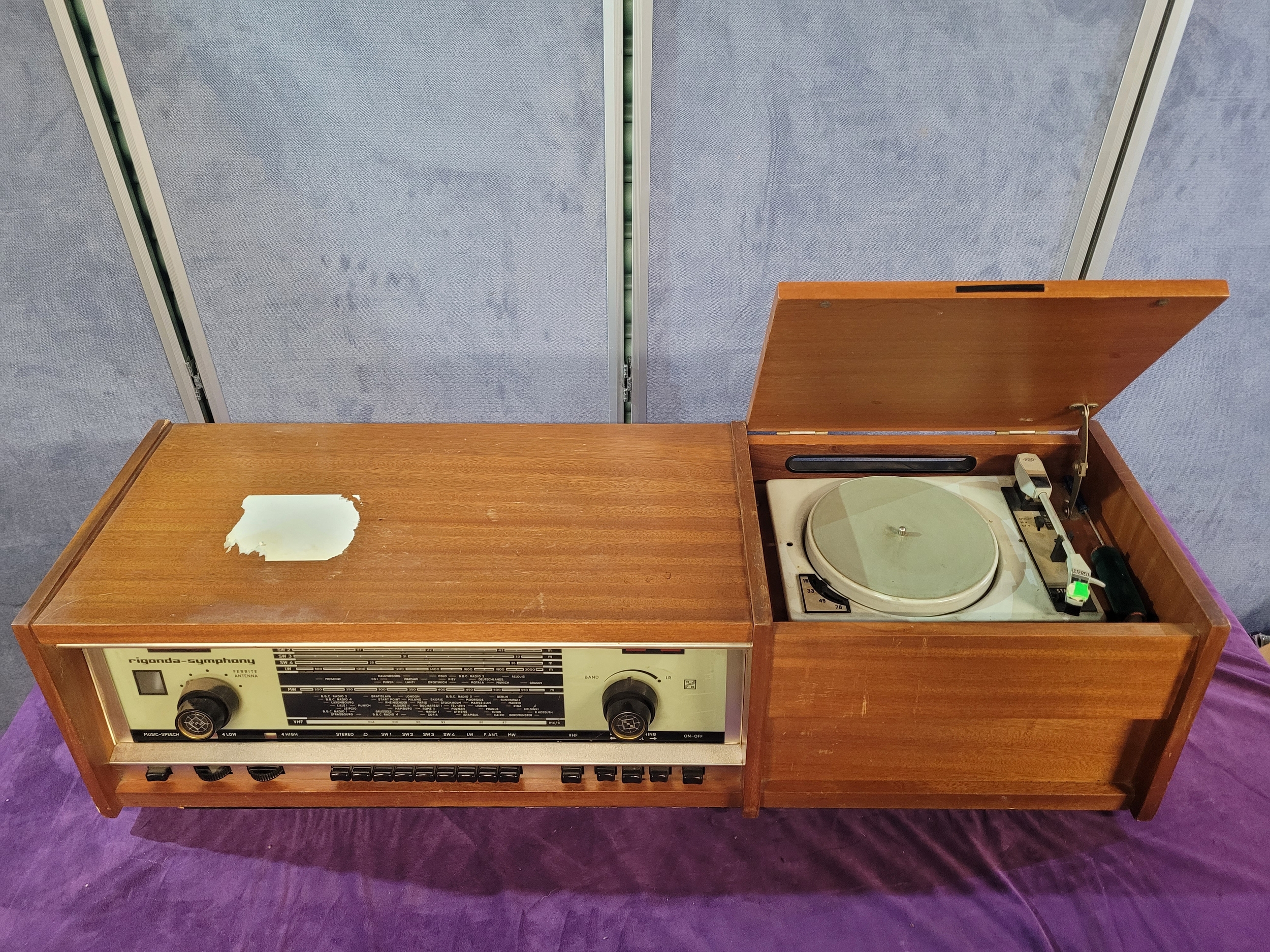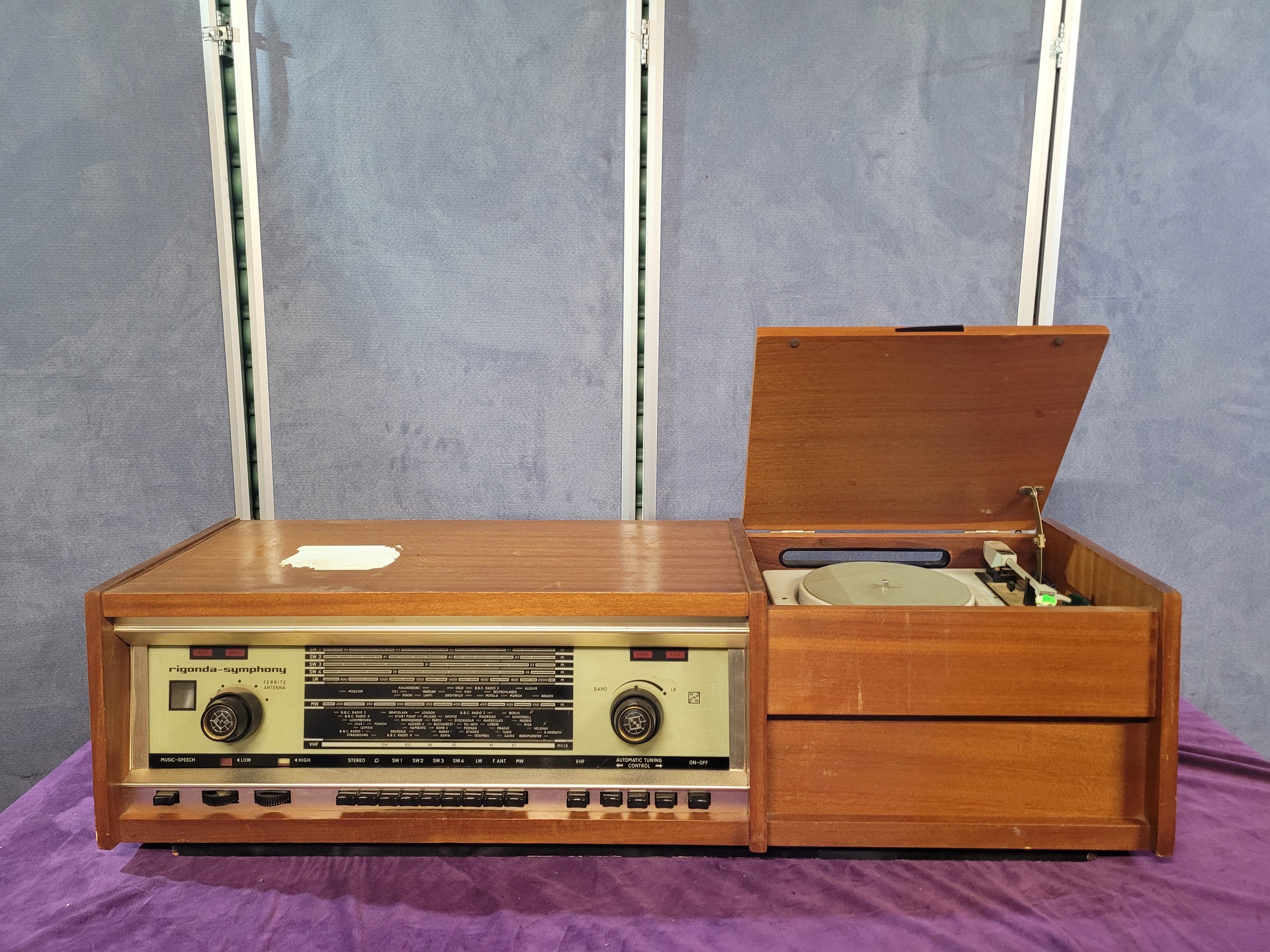 Vintage Rigonda Symphony radiogram in a wooden cabinet, featuring: