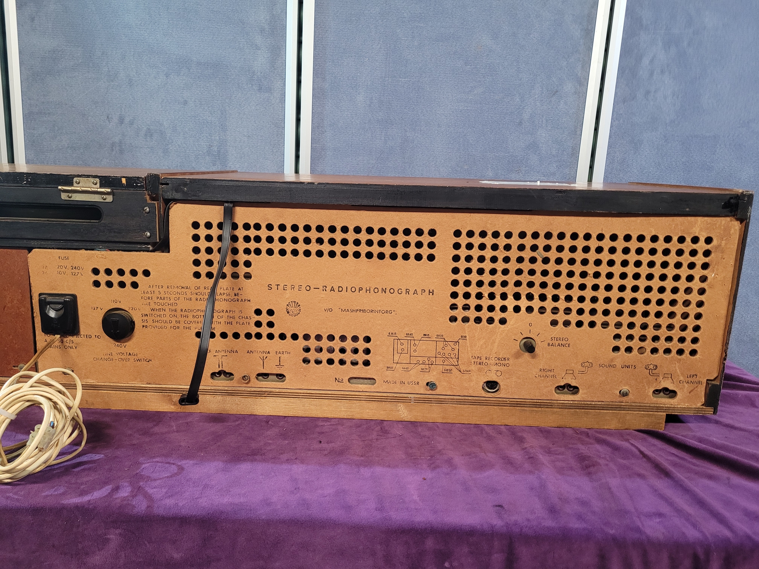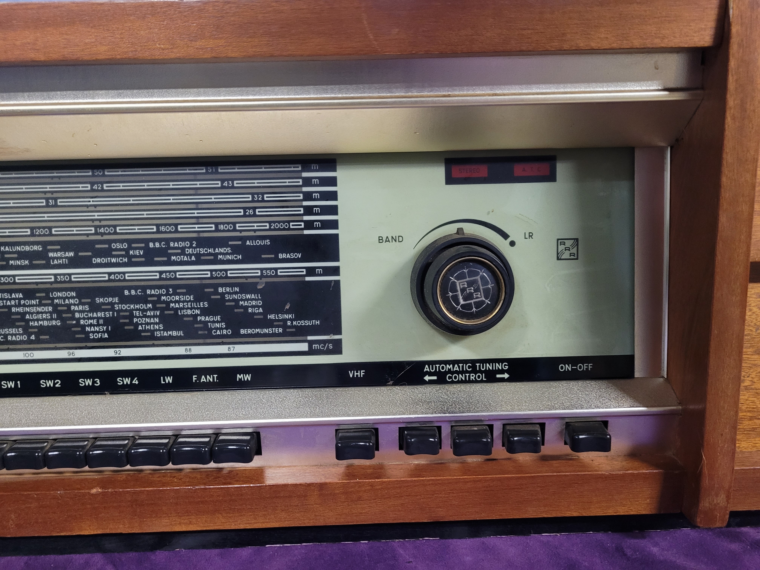 Front control panel with tuning scale, volume/balance knobs, and function switches Classic mid-century Eastern European design