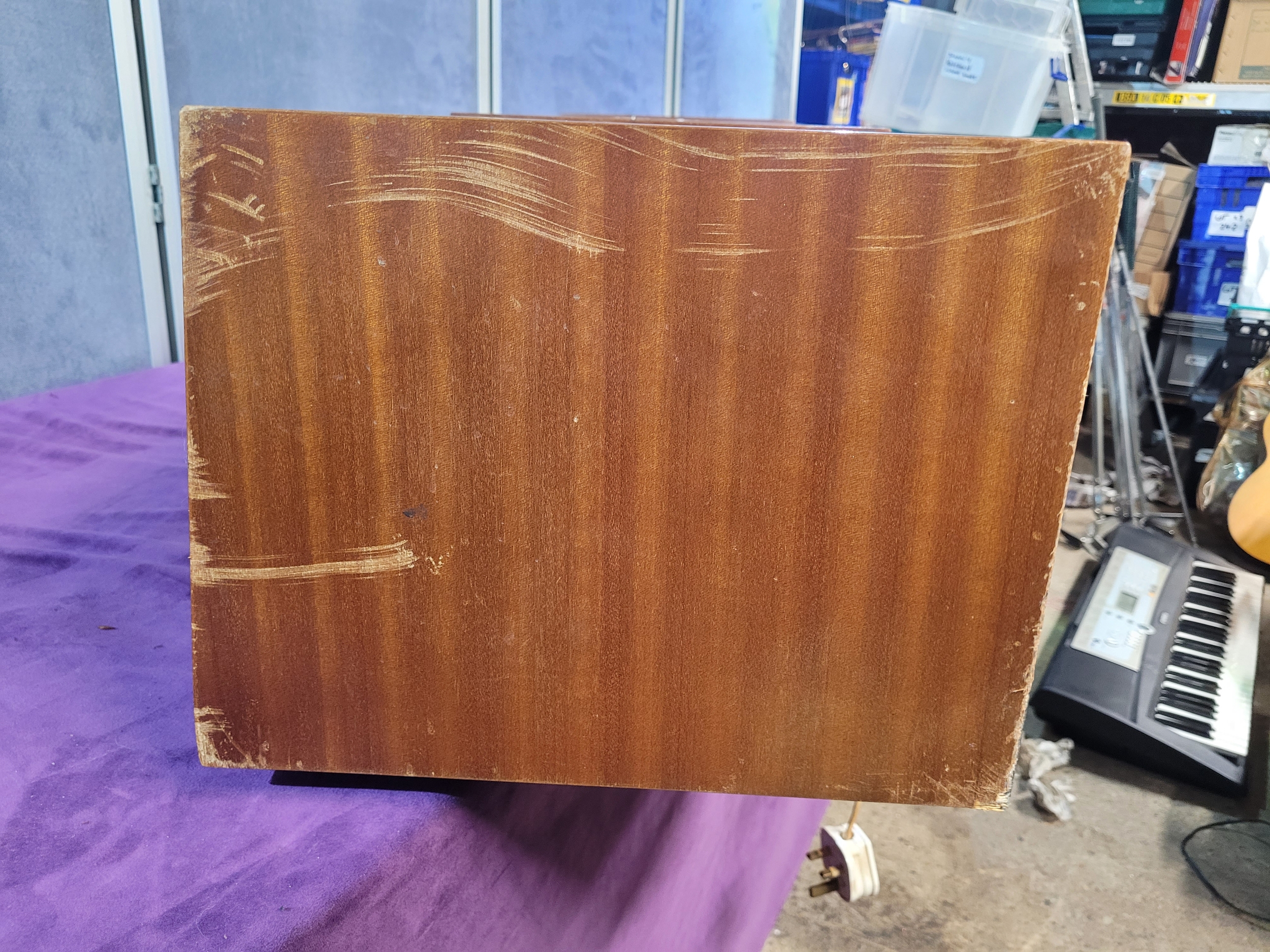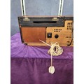 Built-in AM/FM radio with multi-band tuning Integrated record turntable under a lift-up lid