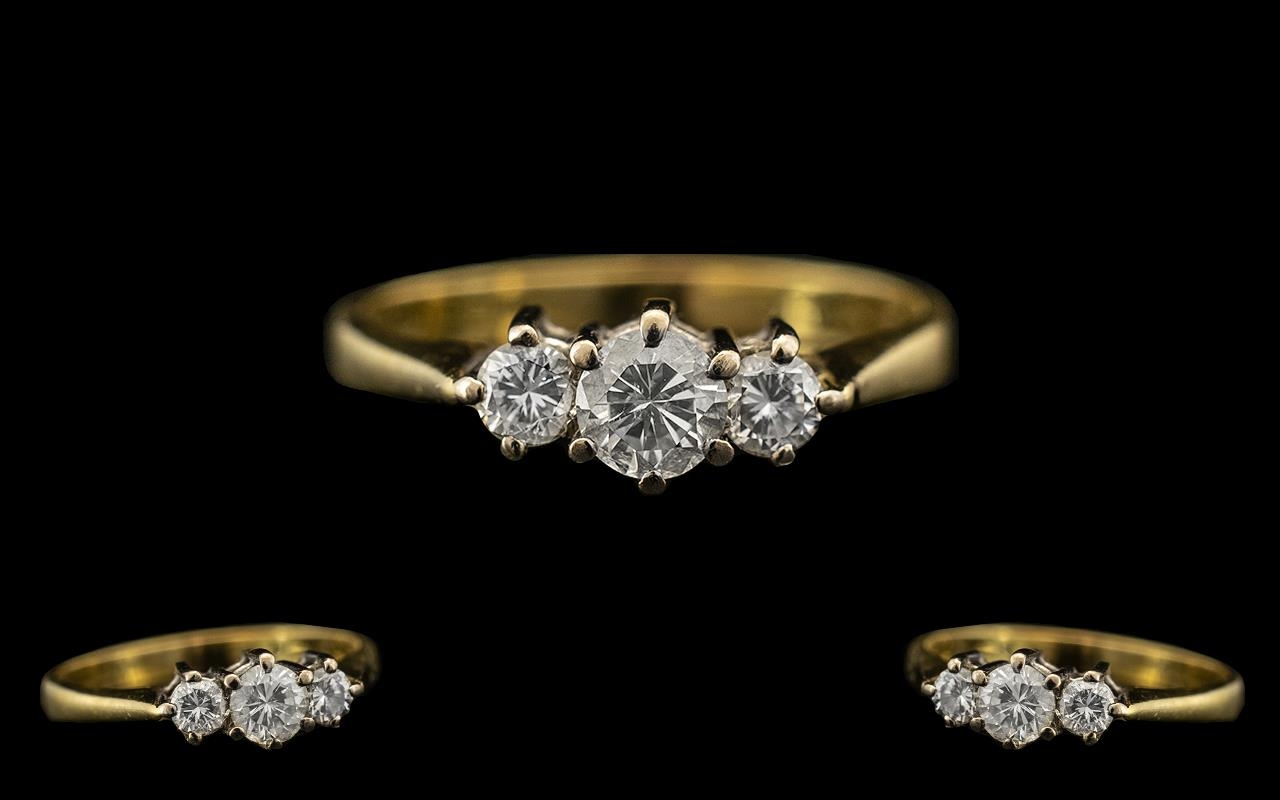 18ct Gold and Platinum - Attractive 3 Stone Diamond Set Dress Ring. Full Hallmark for 18ct - 750 to Interior of Shank. Cal Diamond Weight 0.40 pts - Marked to Interior of Shank. Both Colour and Clarity Are Excellent. Ring Size - K. All Aspects of Condition Are Excellent, Including Shank and Setting.