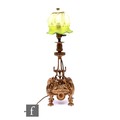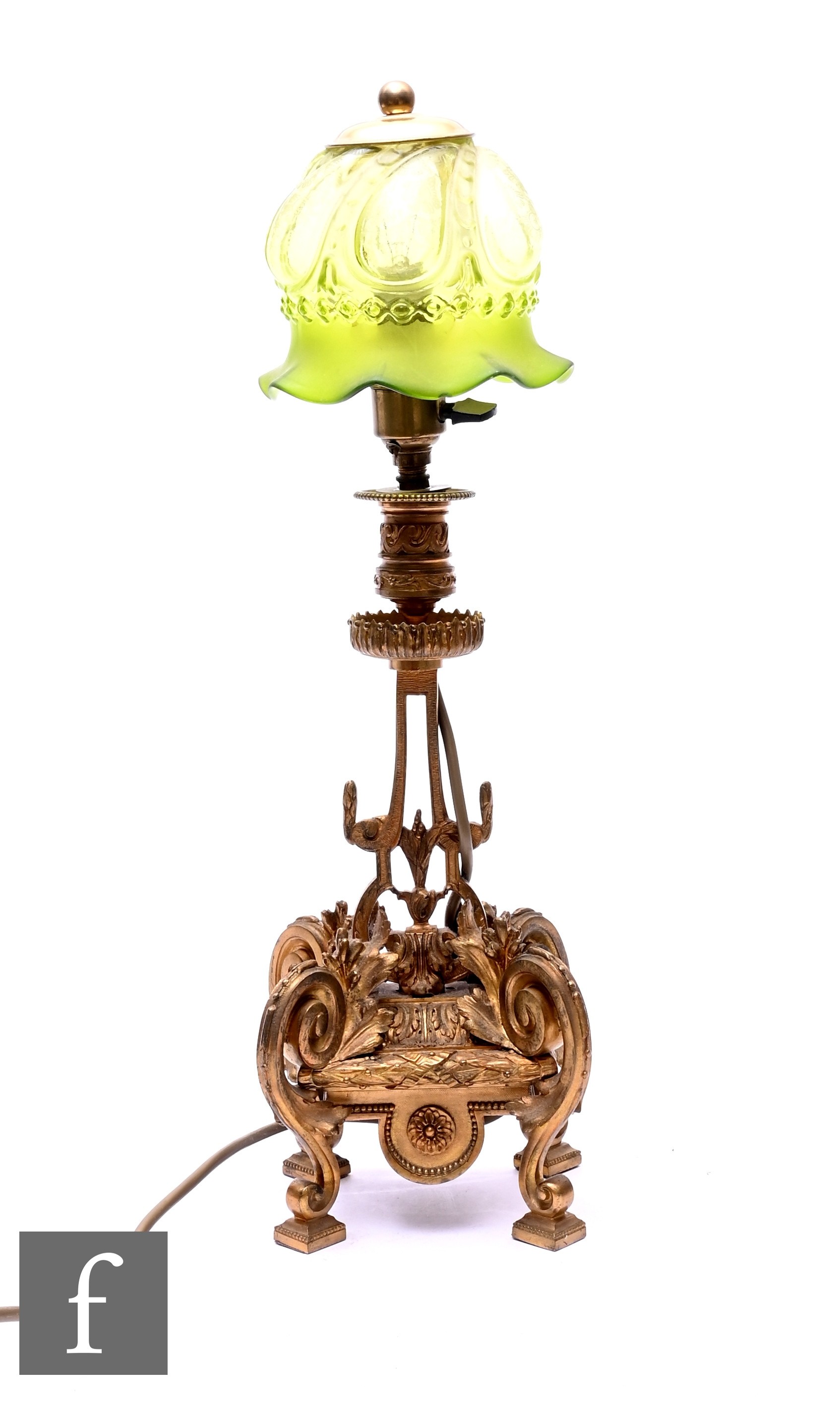An early 20th Century French brass table lamp converted from a candlestick, with pale green acid etched shade, on scroll feet, height 48cm.