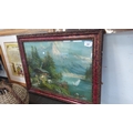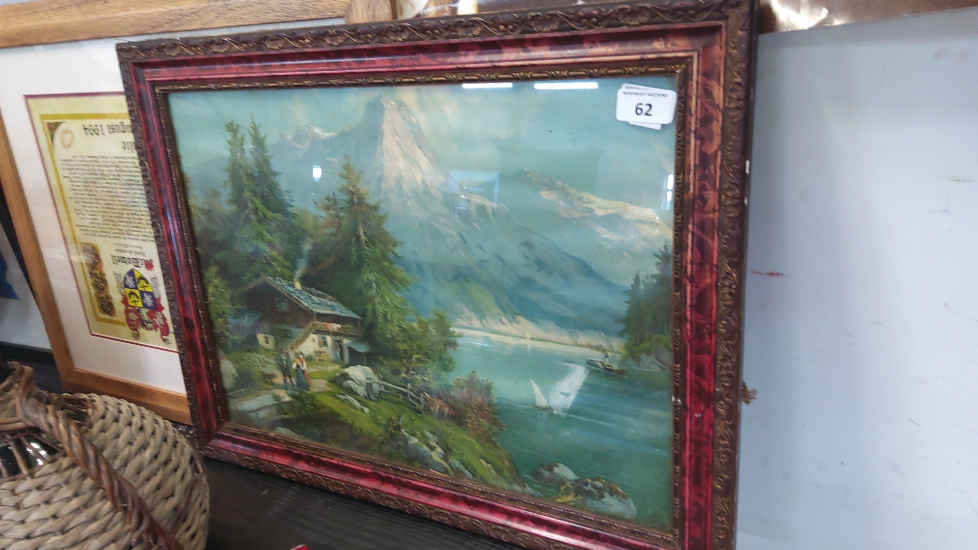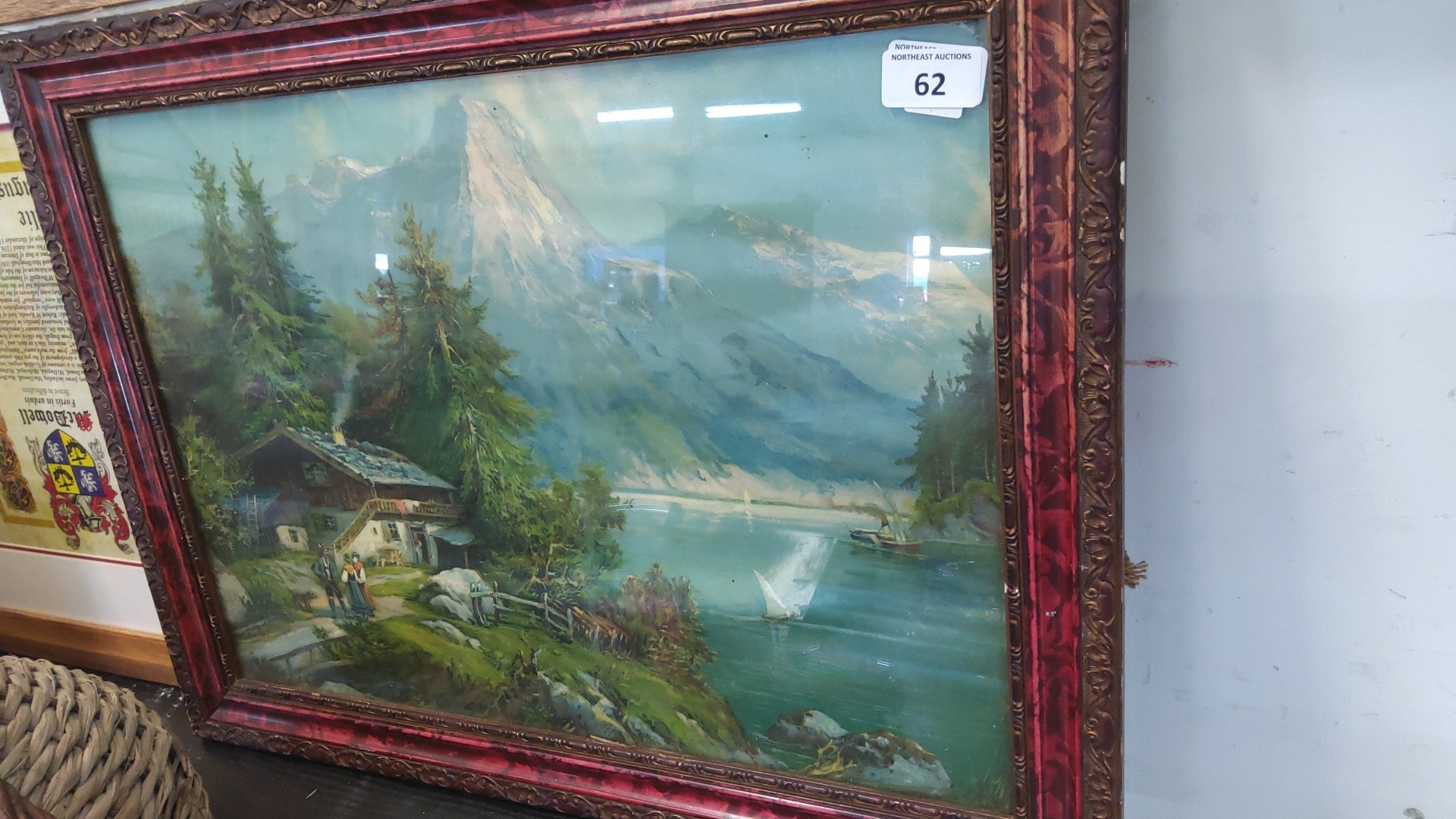 Framed landscape print after a European alpine lakeside scene with chalet, figures, sailboat and steamer, within a moulded gilt slip and faux-tortoiseshell frame under glass.