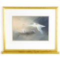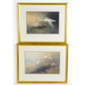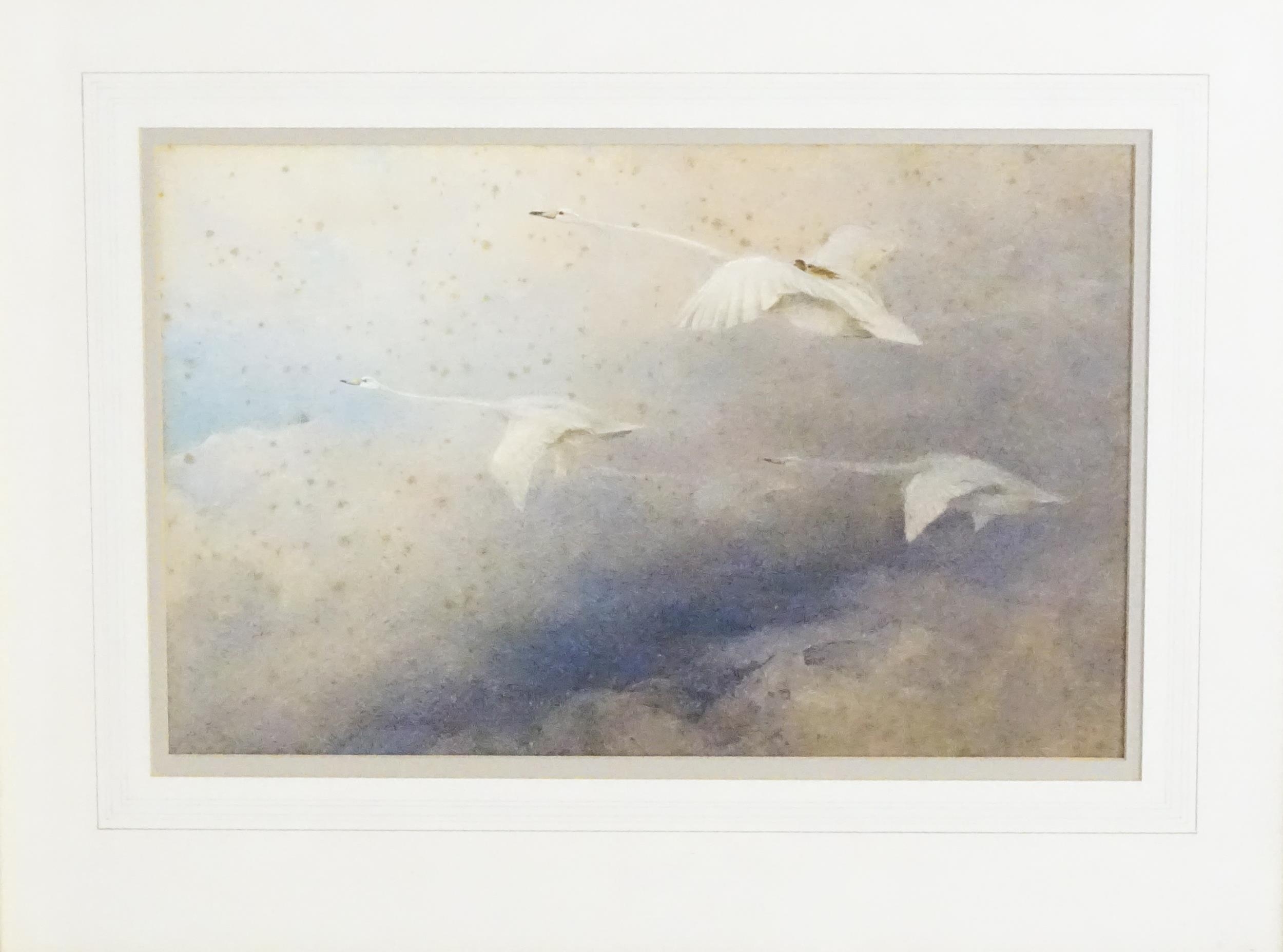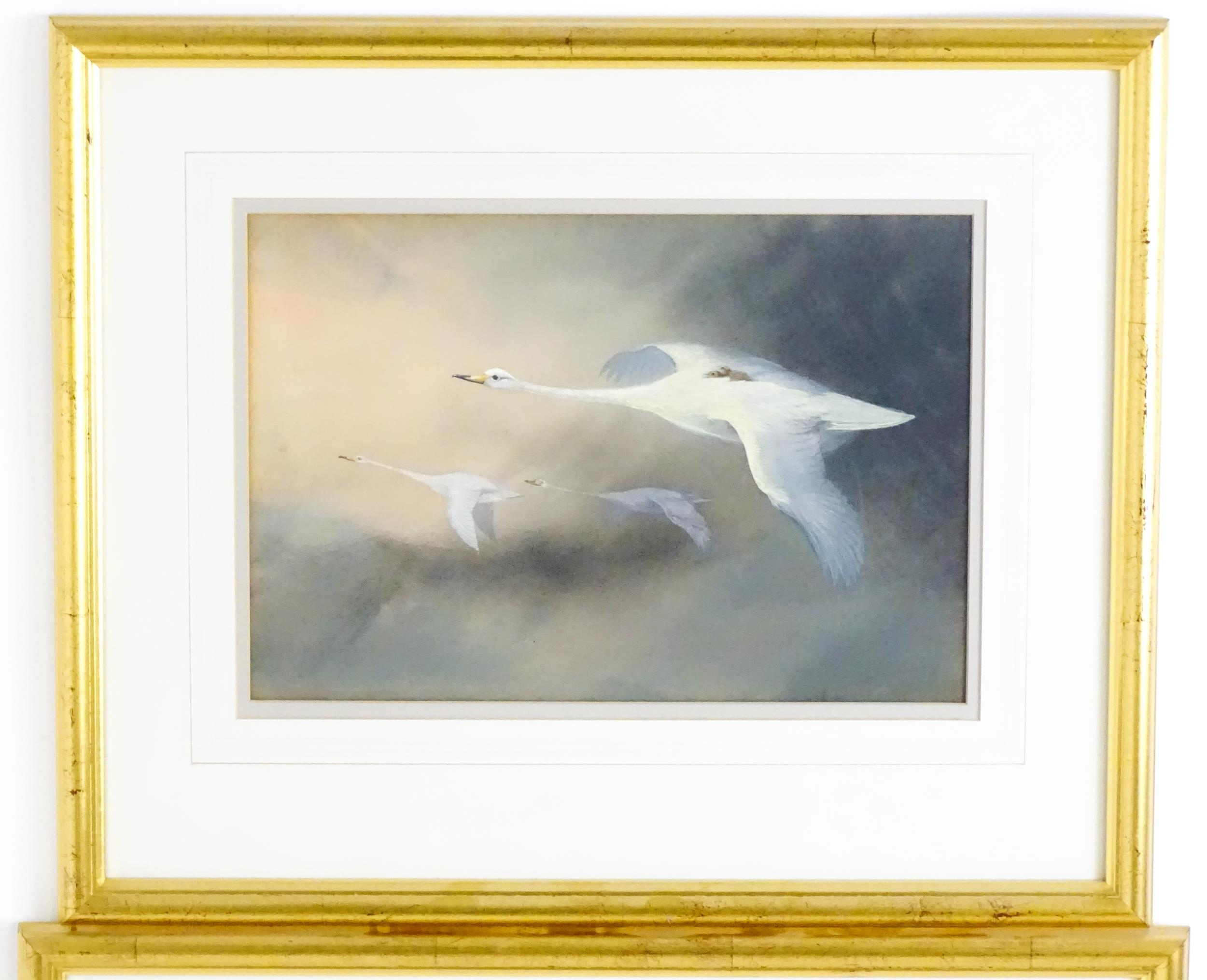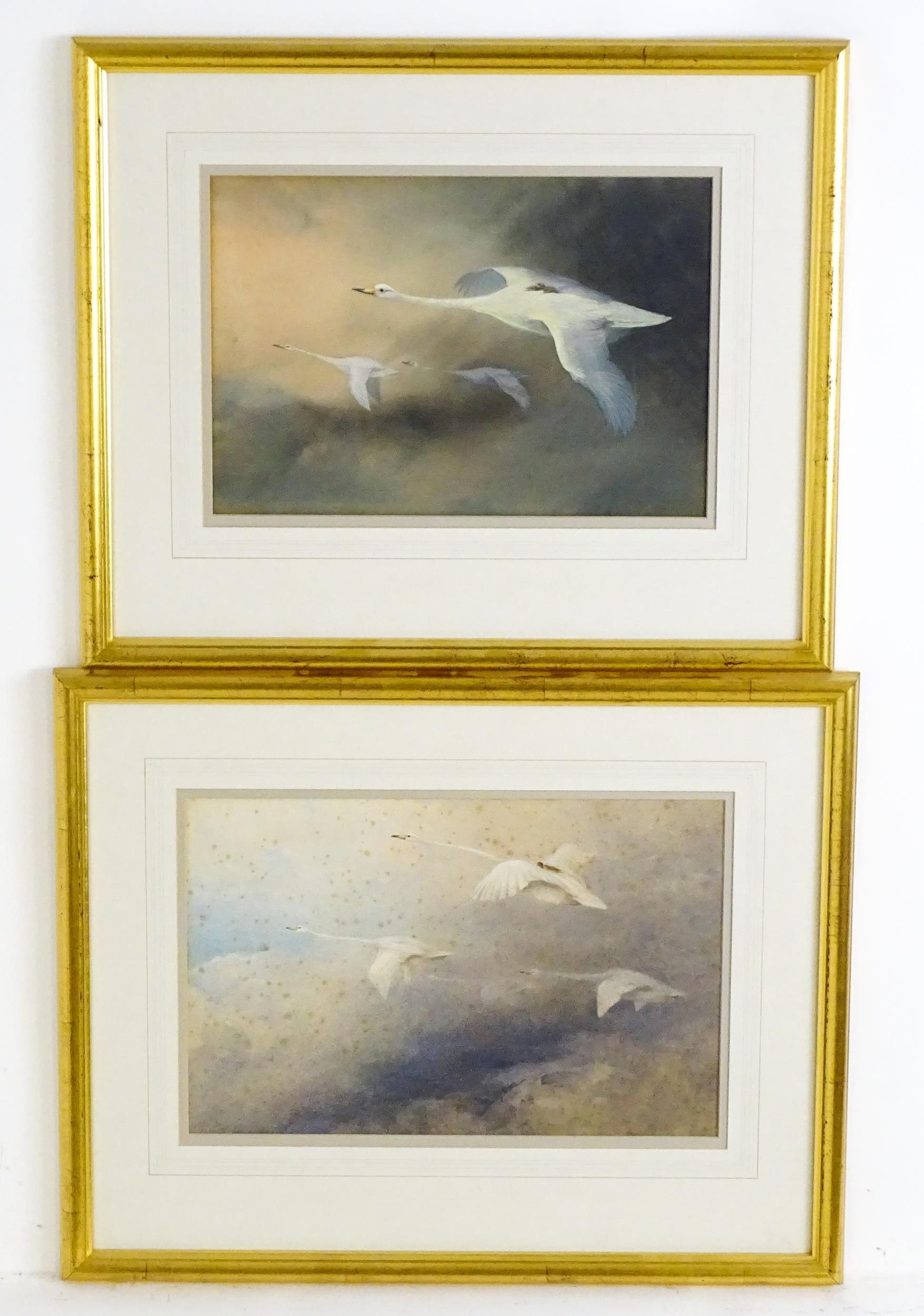 Manner of Charles Whymper (1853-1941), Pastels, Swans in flight with cygnets. Approx. 9 3/4" x 14 1/4" (2)