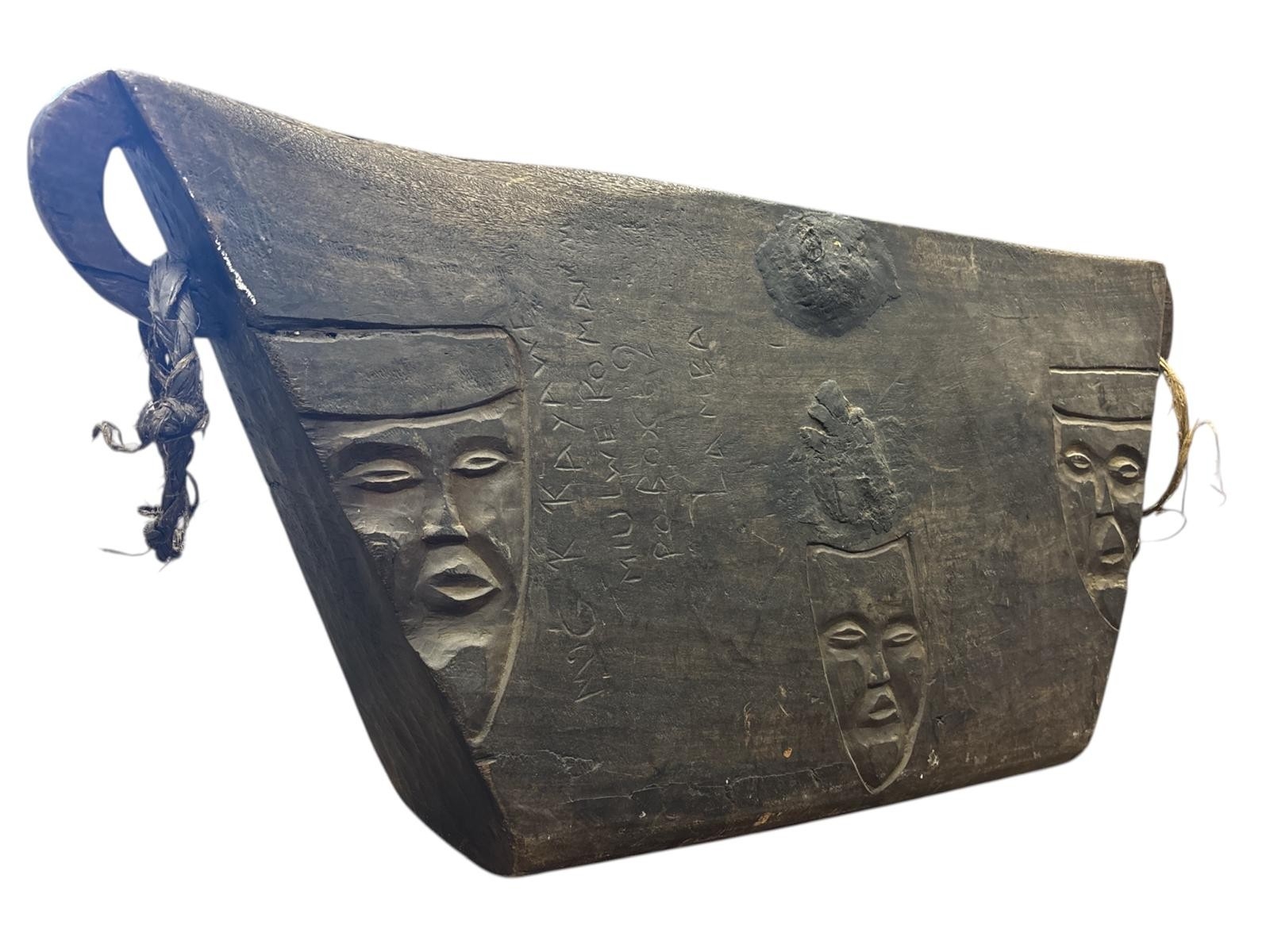 A CONGALESE TETELA LUKOMBE SLIT DRUM bearing multiple carvings of human faces Approx. 132cm (h) x 62cm (d)