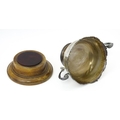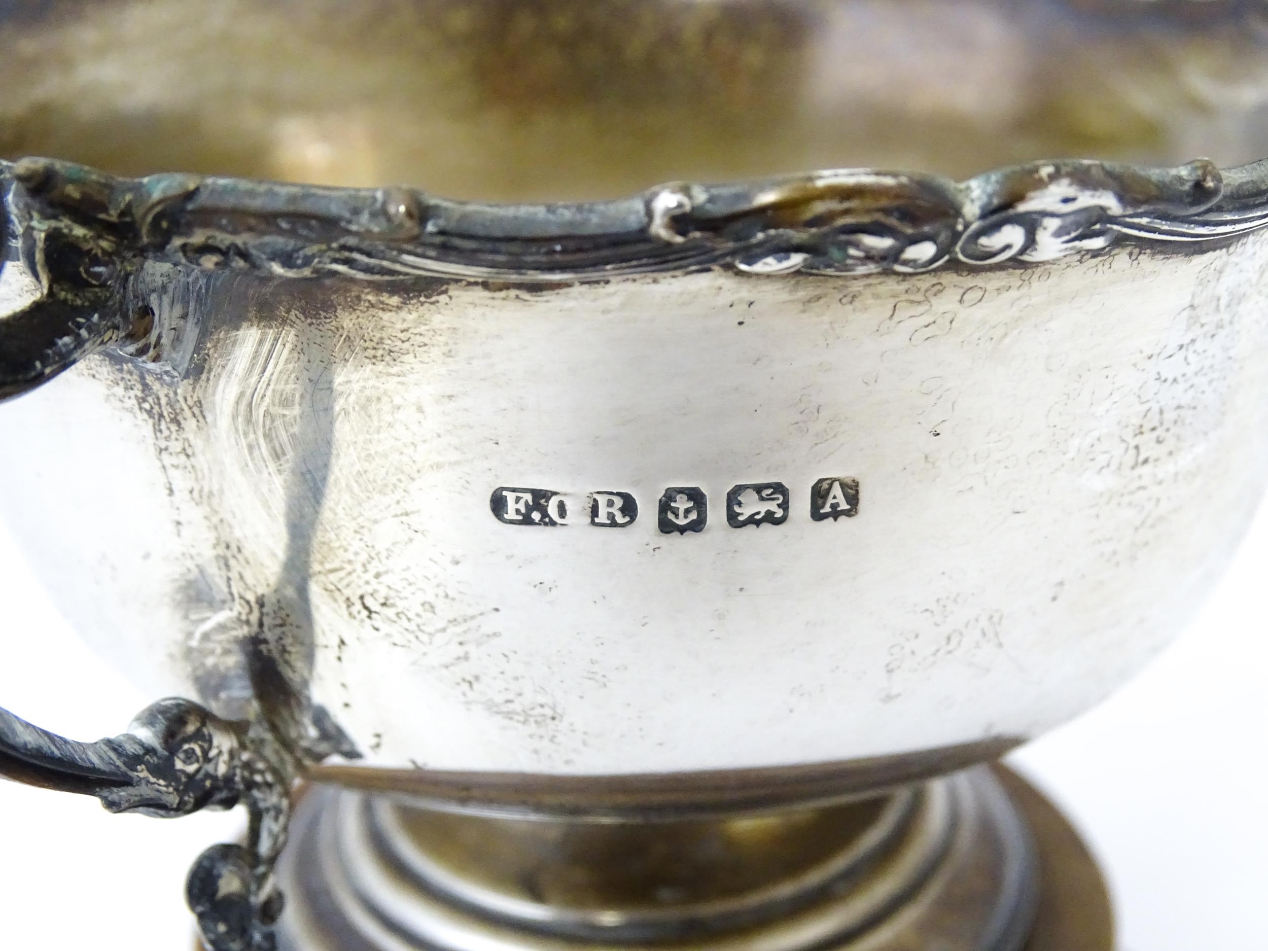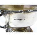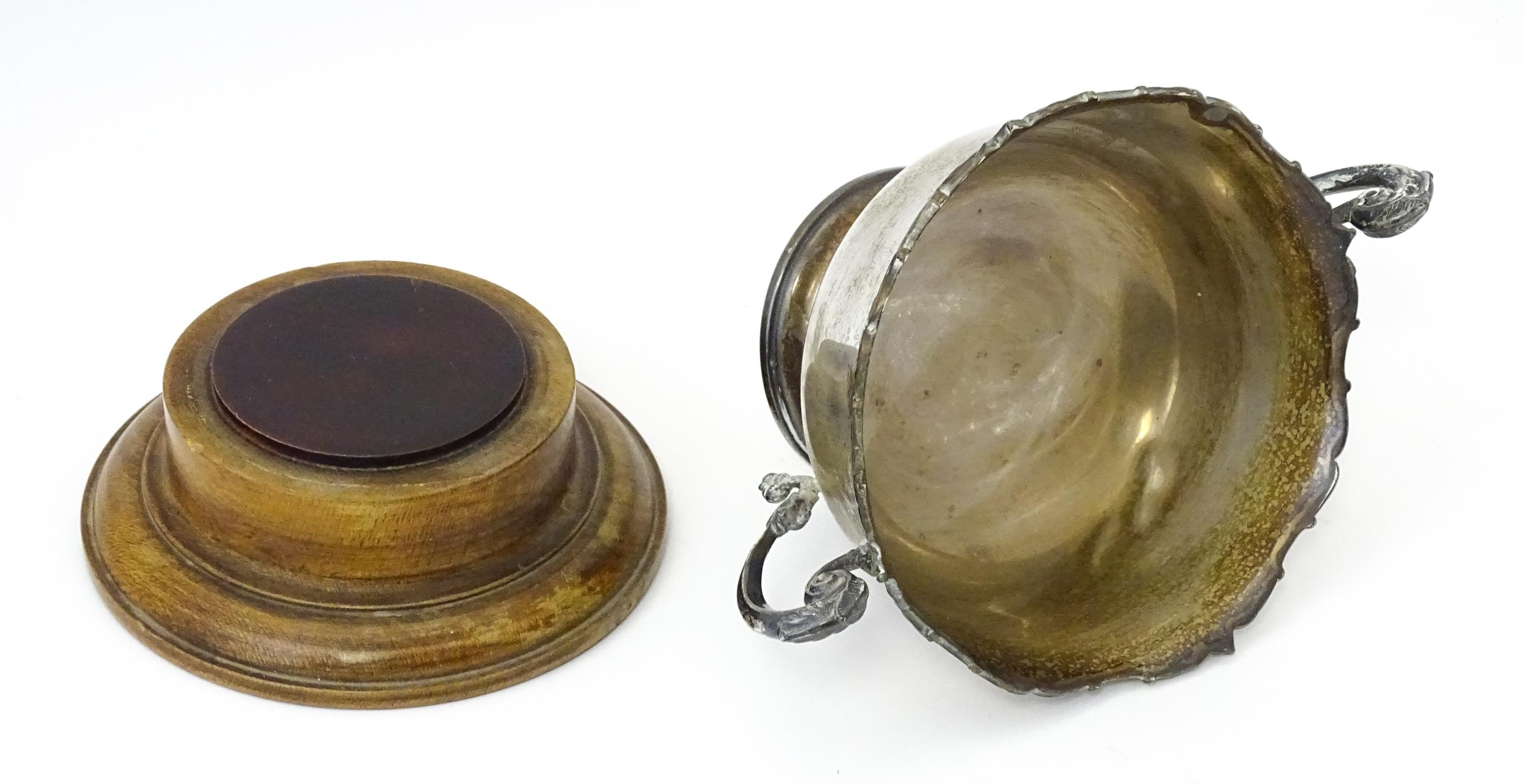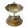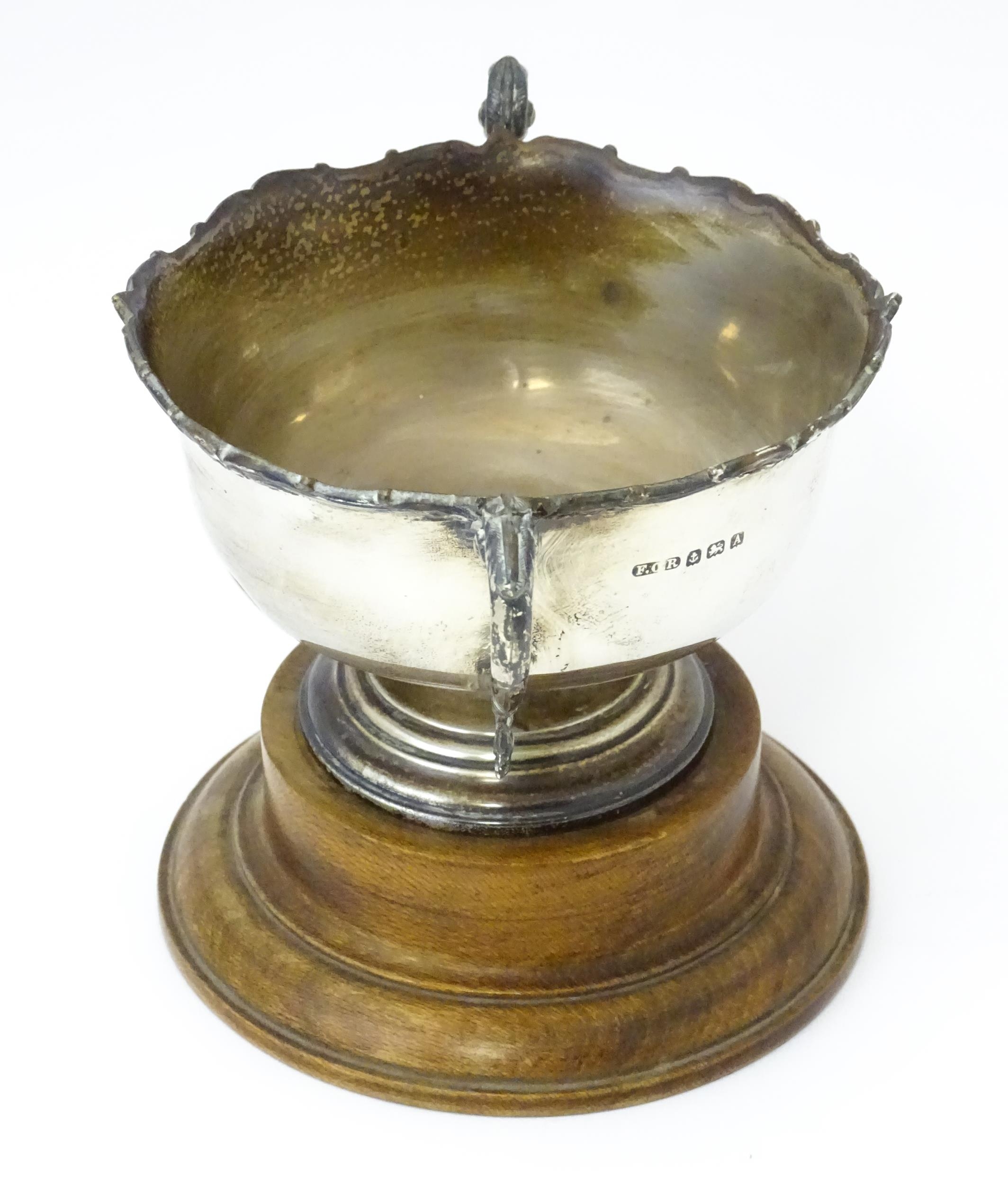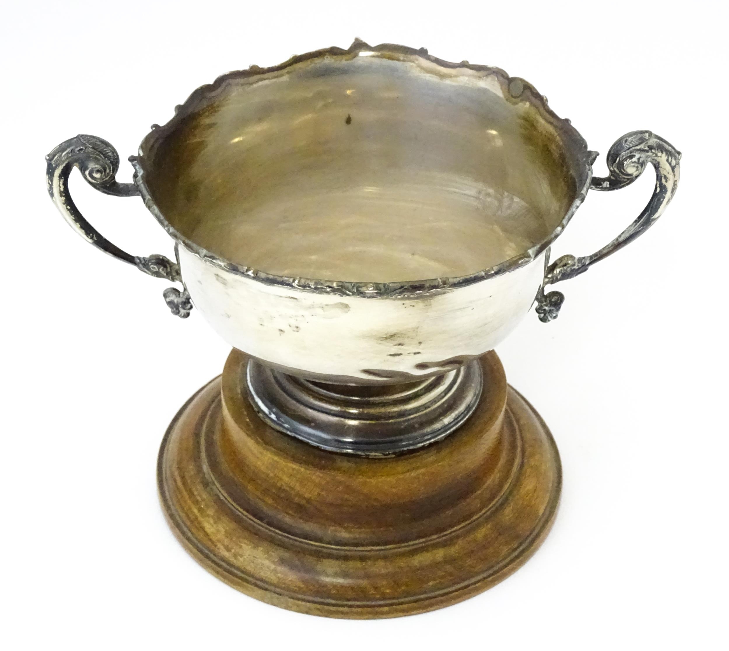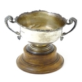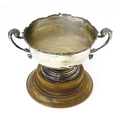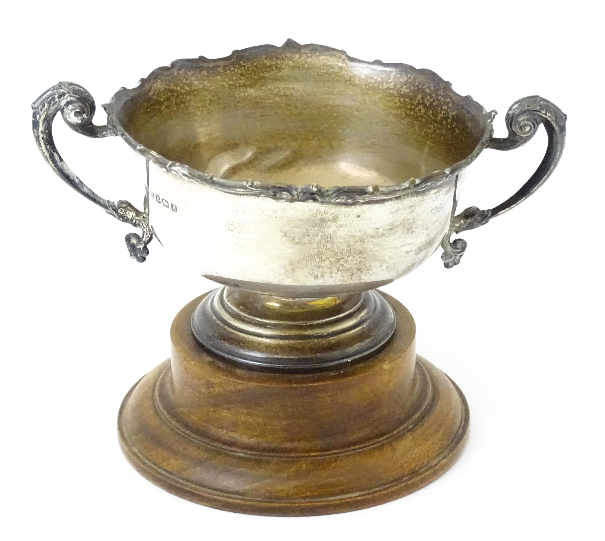 A silver twin handled trophy cup hallmarked Birmingham 1925, maker F. C. Richards. Raised on a turned wooden base. Approx. 4 1/2" high overall