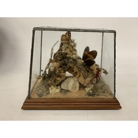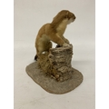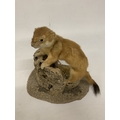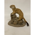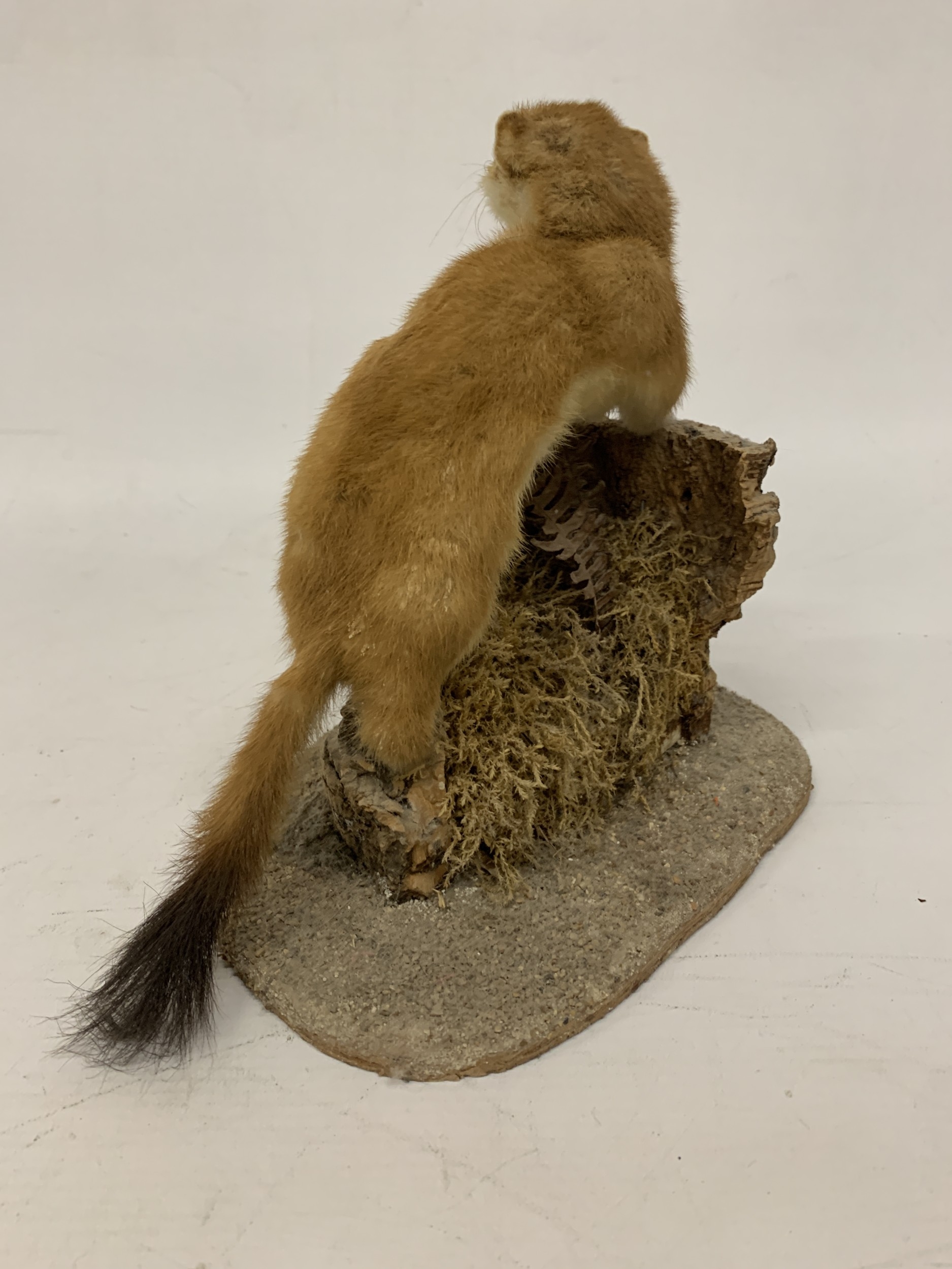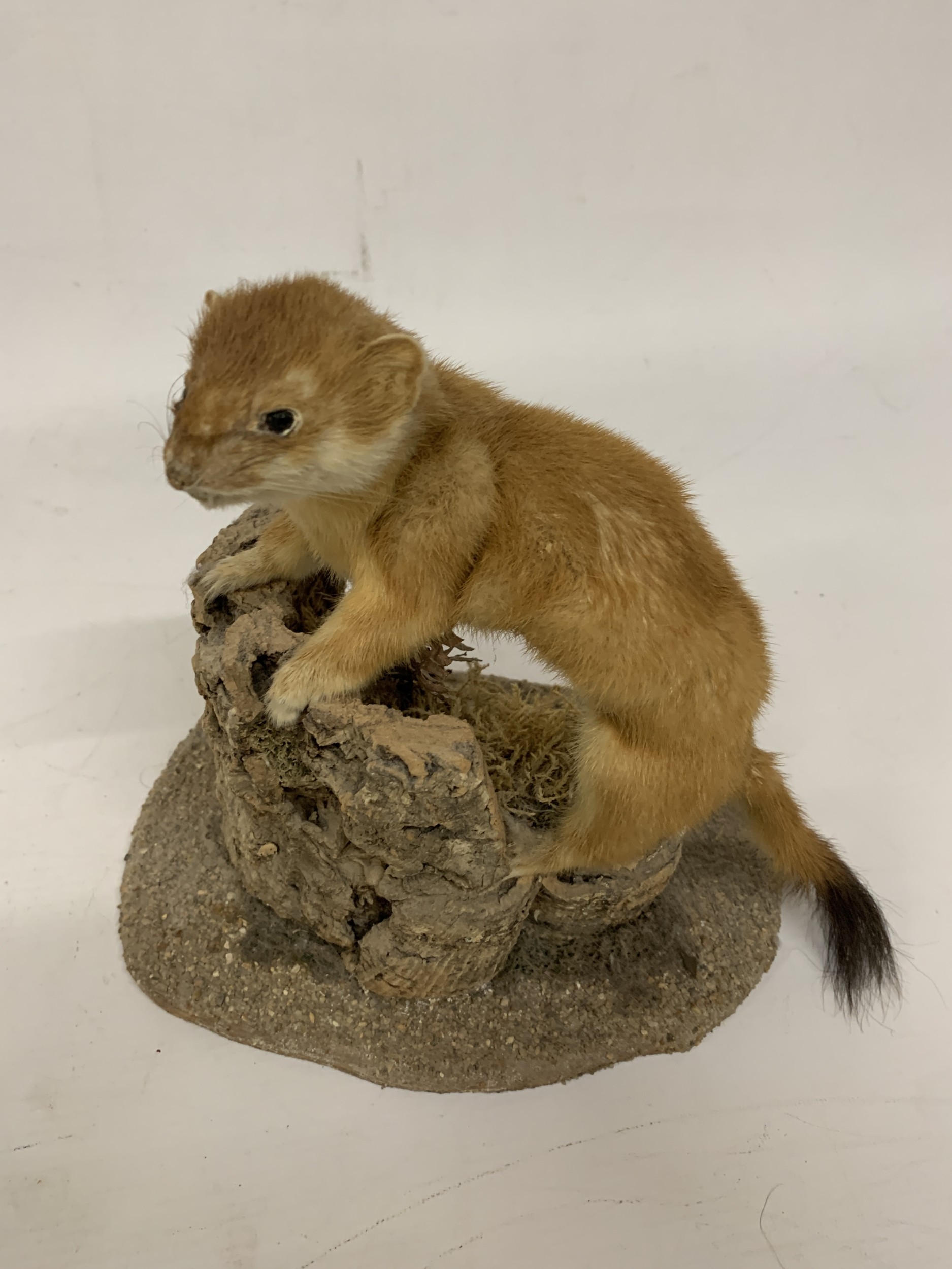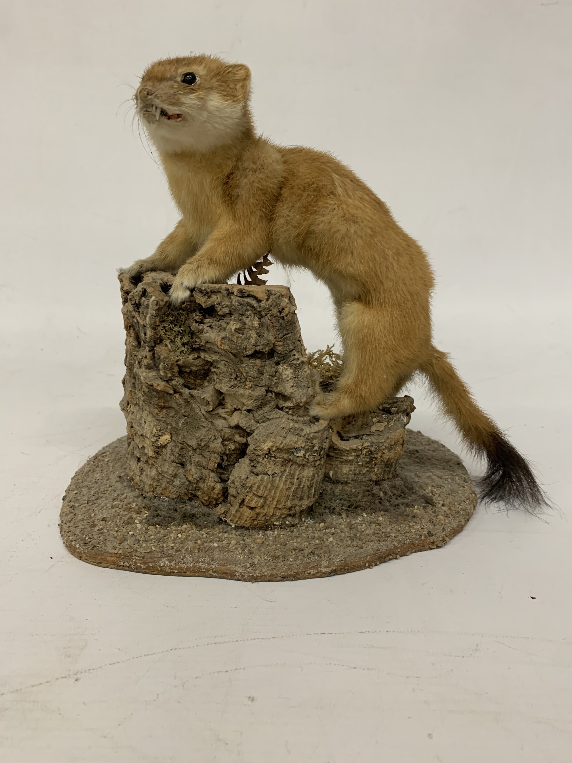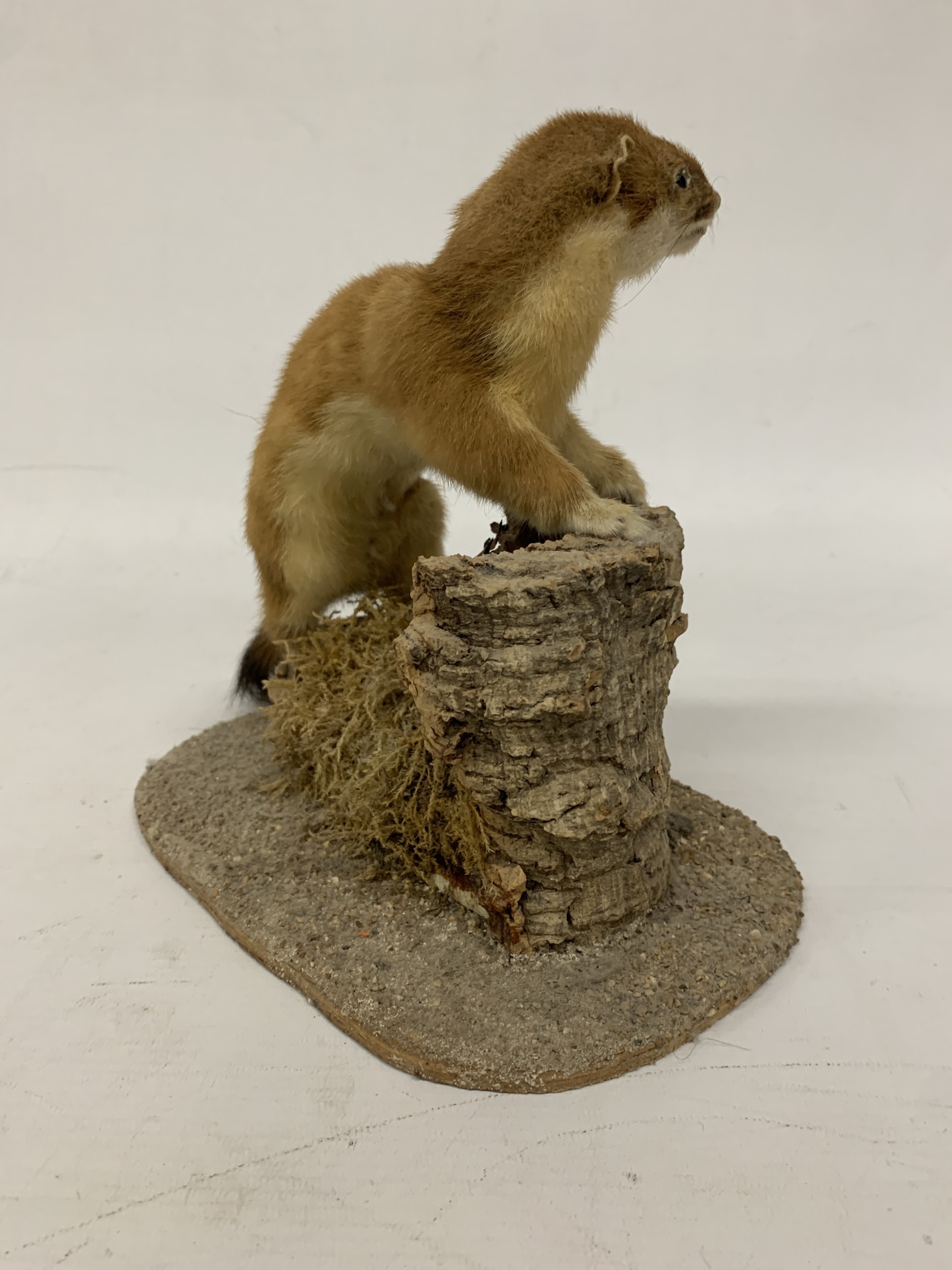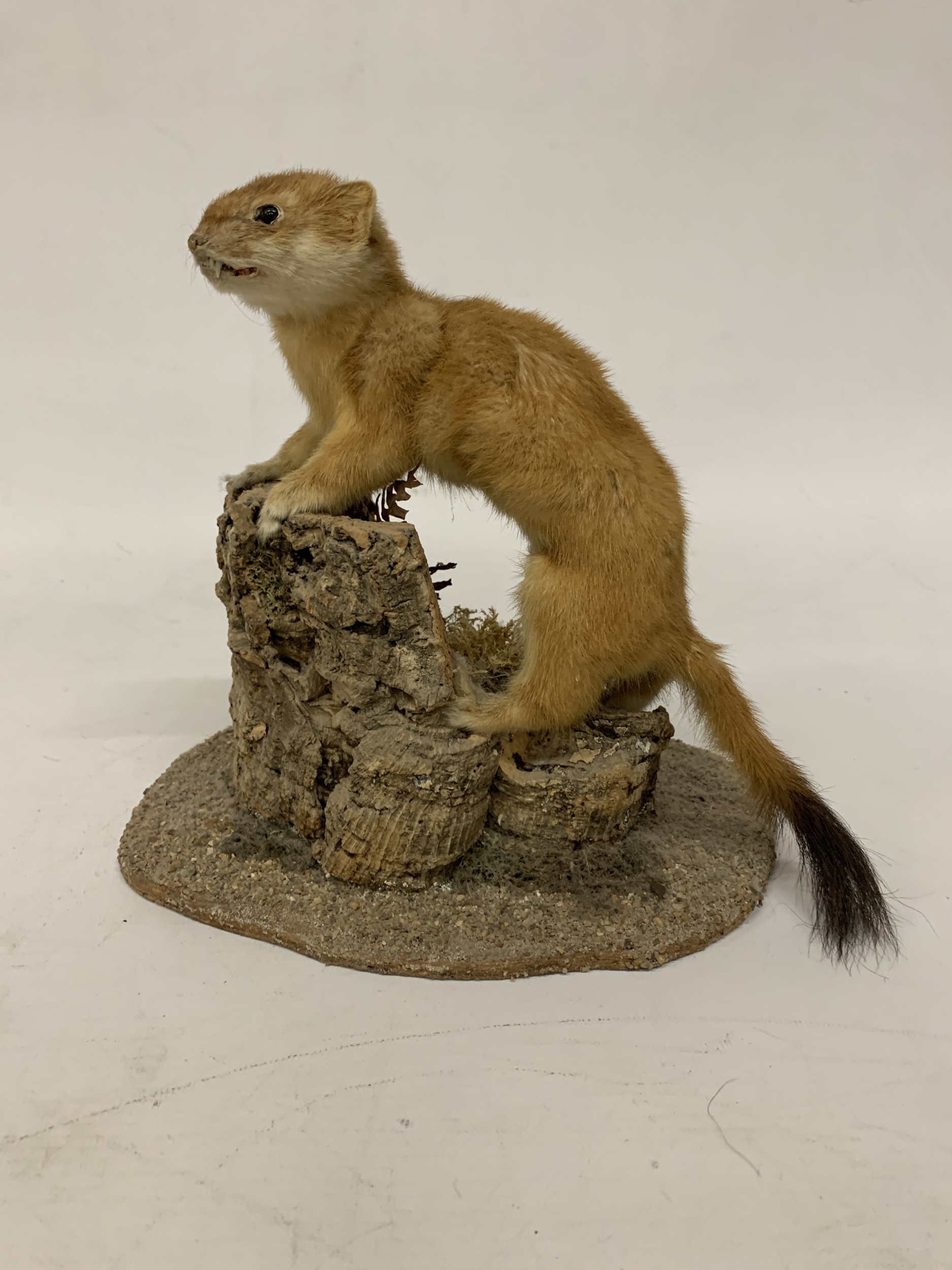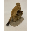 A TAXIDERMY STOAT ON A NATURALISTIC BASE