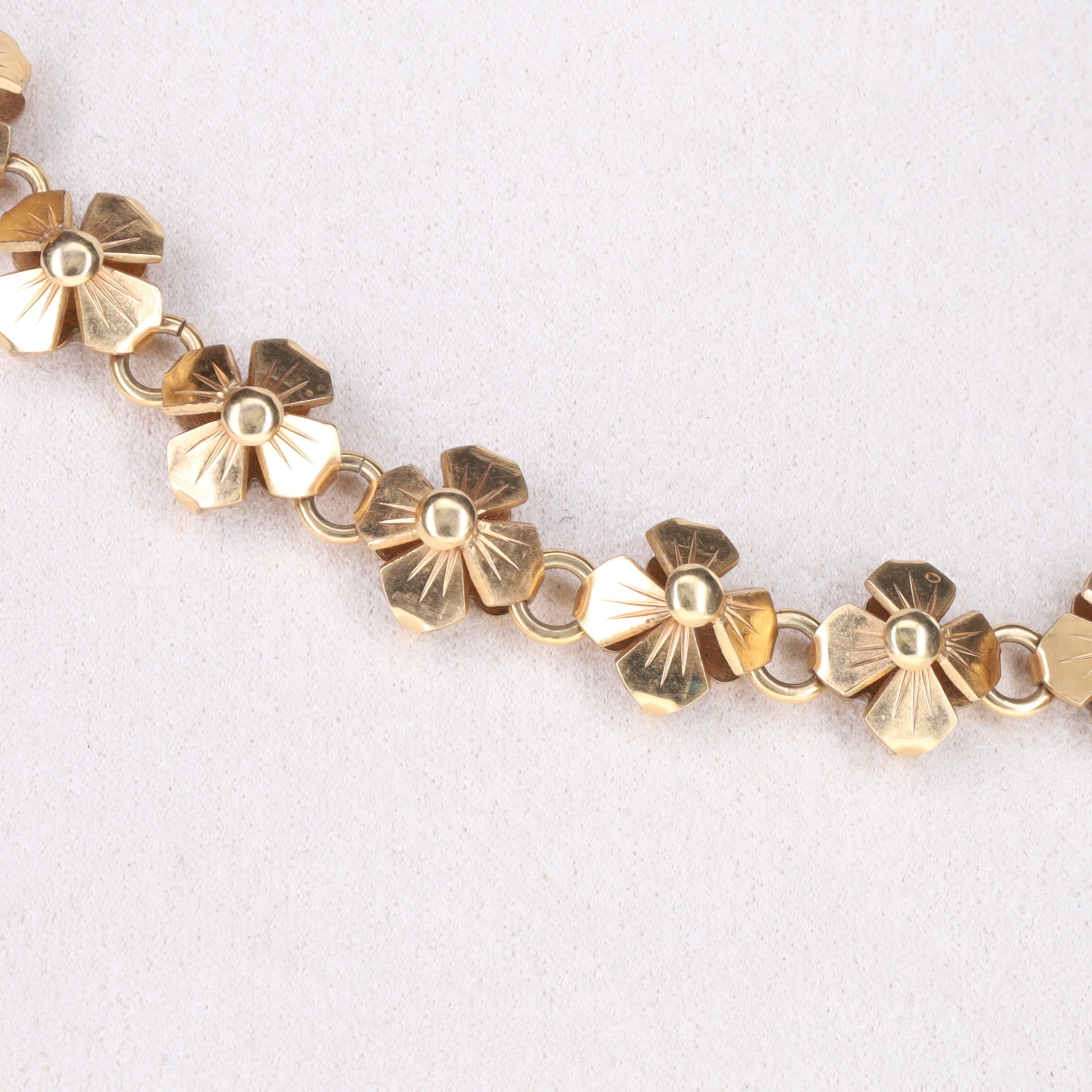 Mid Century Rolled Gold Floral Necklace. Measures approx. 42cm full length. Tested as rolled gold. This necklace is in excellent condition. Weighs in total 20.6g
