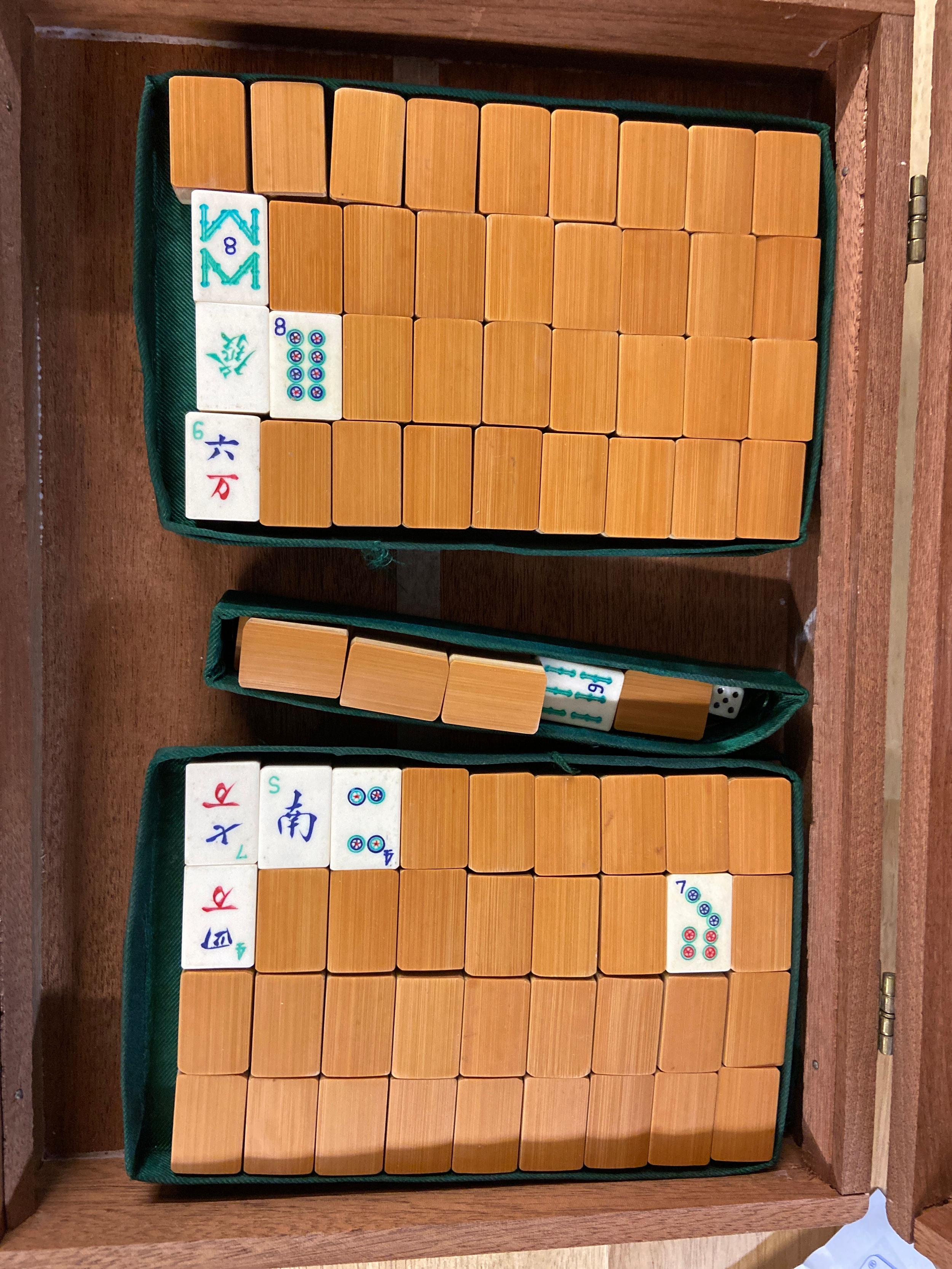 Bamboo based Mah-jong set in wooden case. 152 pieces and dice.