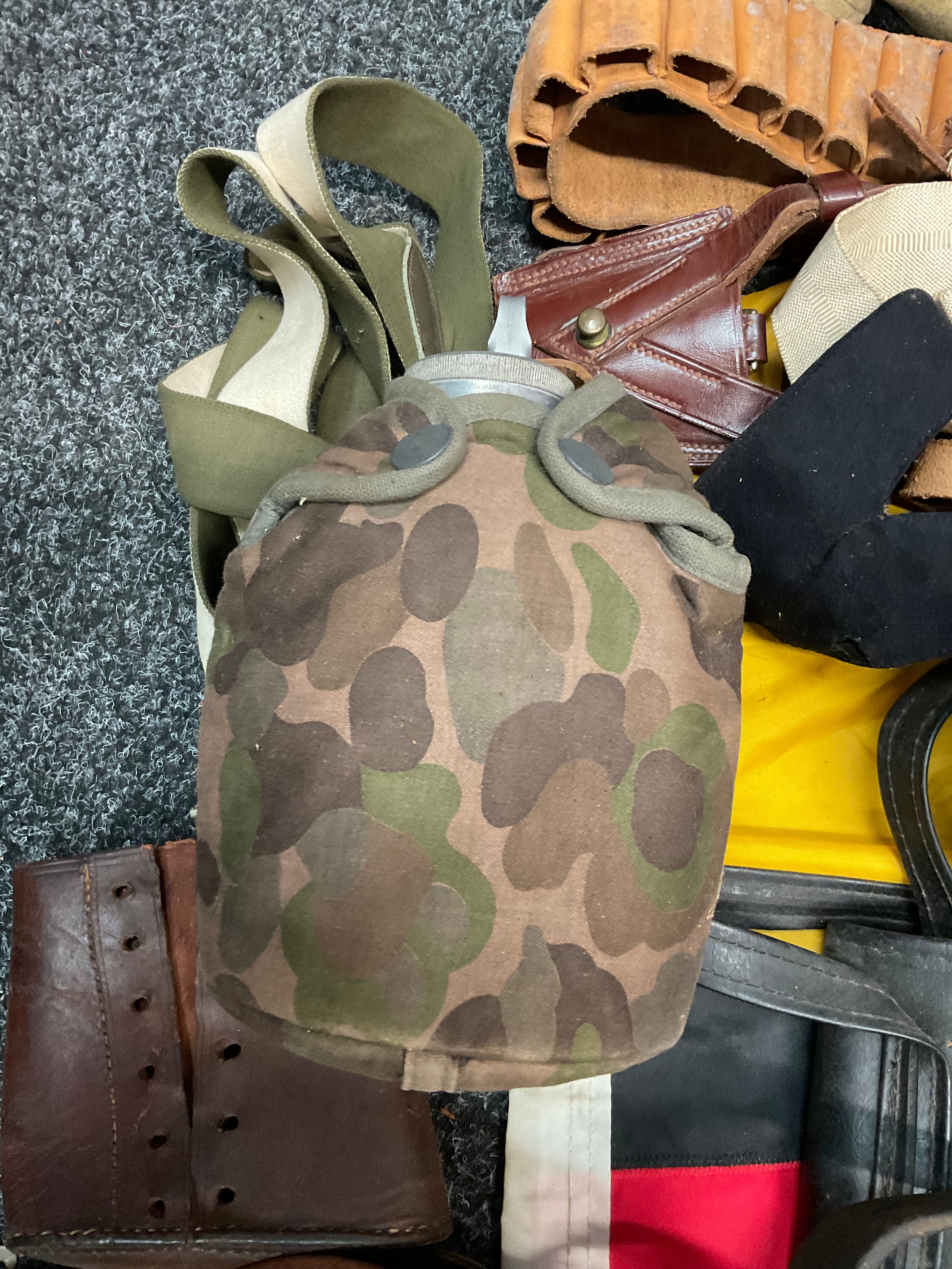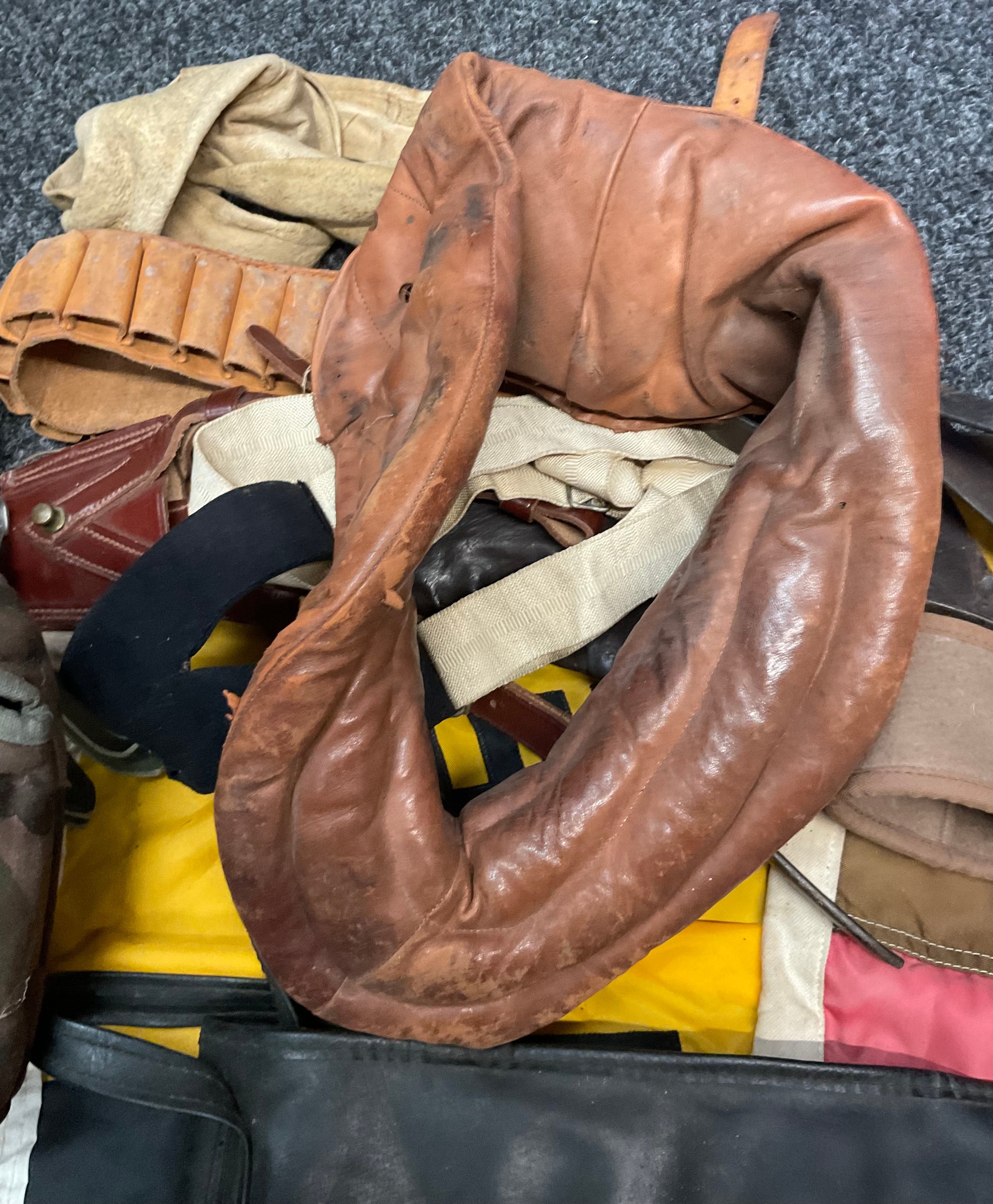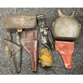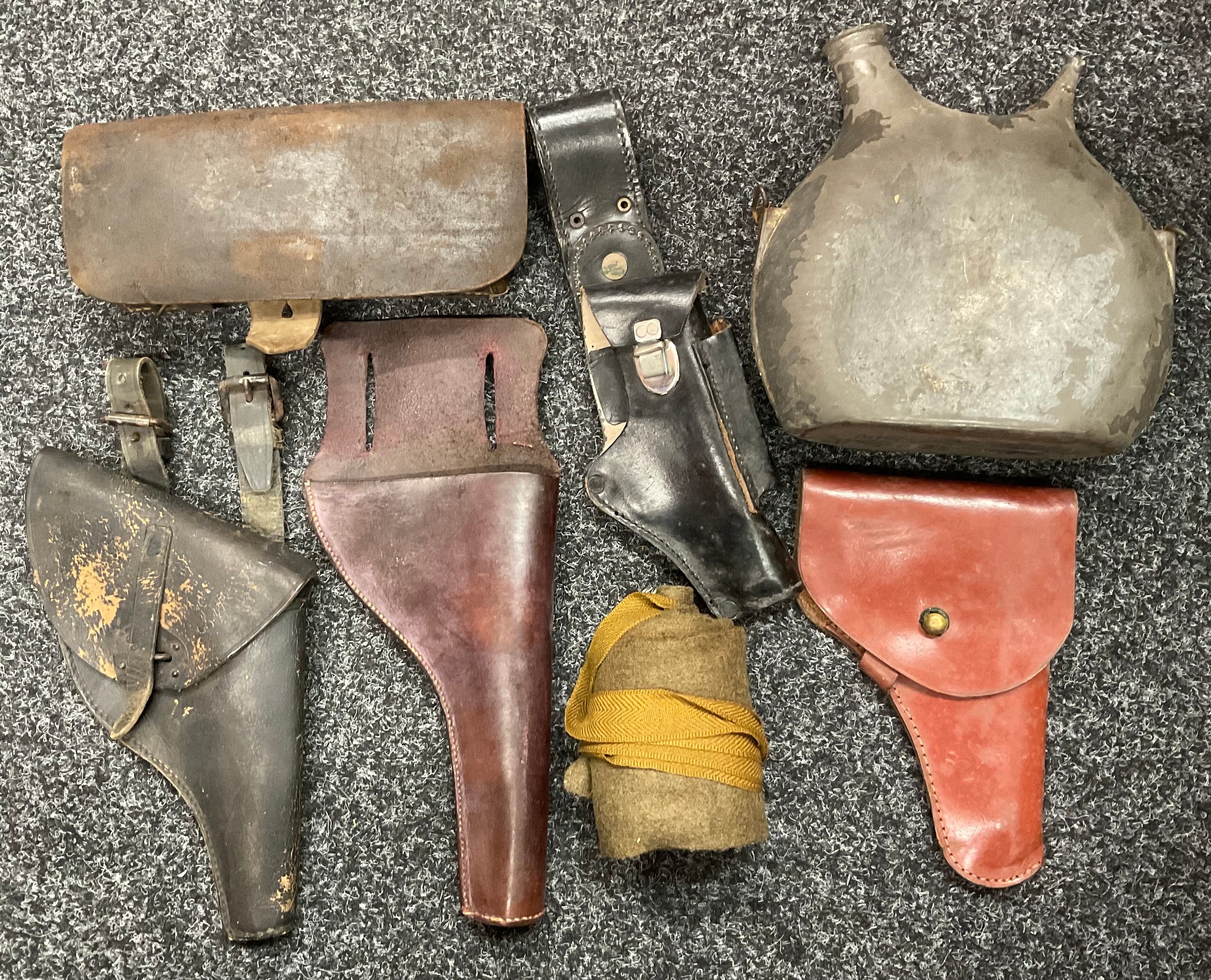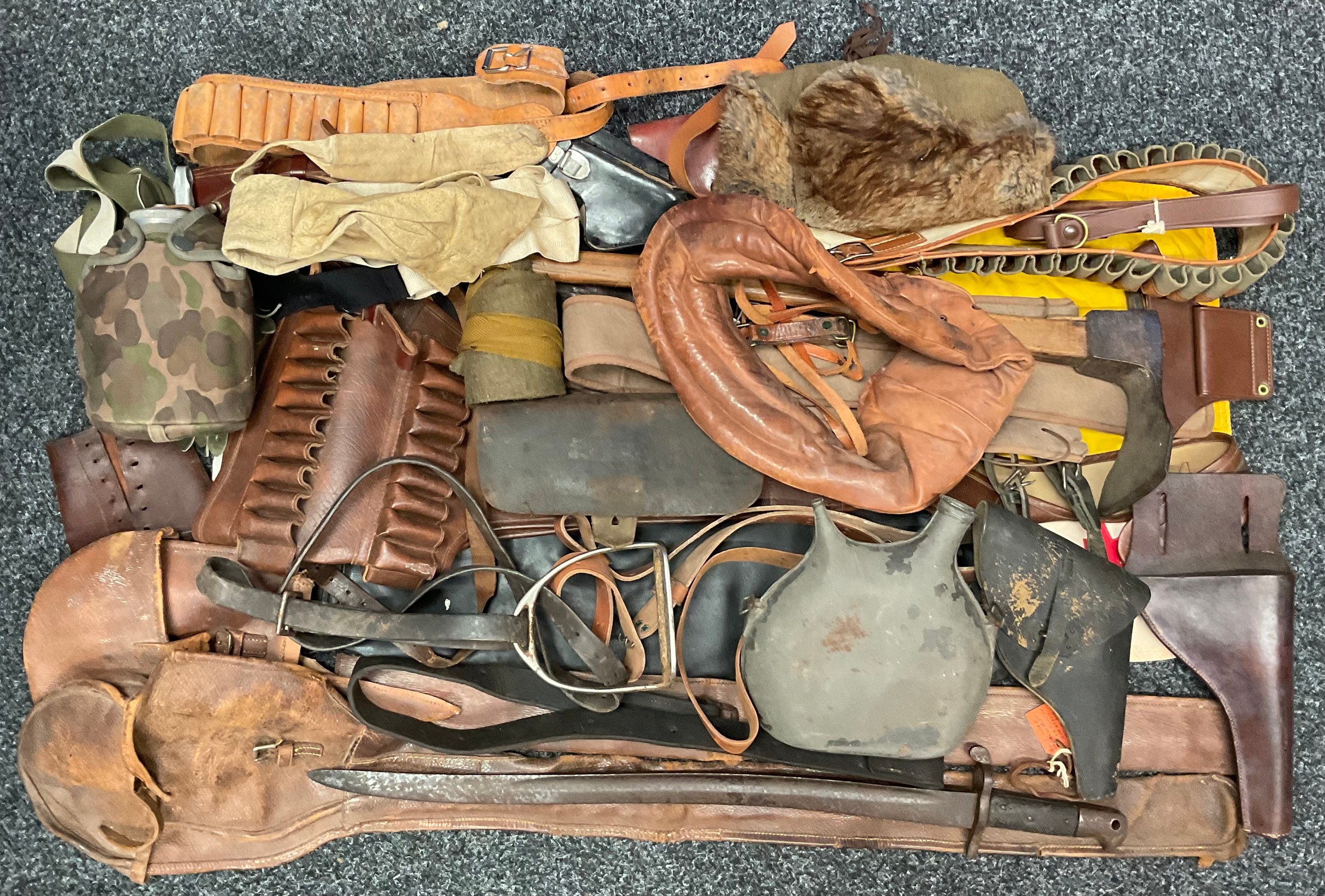 A 19th century British Army P1856/60 yataghan sword bayonet, with curved fullered blade, marked A. & A.S., missing scabbard and half of quillon, blade 57cm in length, 70.5cm total length; others, an Italian Army M1889 revolver holster; 1887 pattern heavy cavalry officers leather sword case; Canadian fur hat; entrenching tool; leather ammo pouch; waterbottles; webbing, etc (qty)