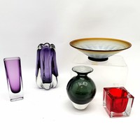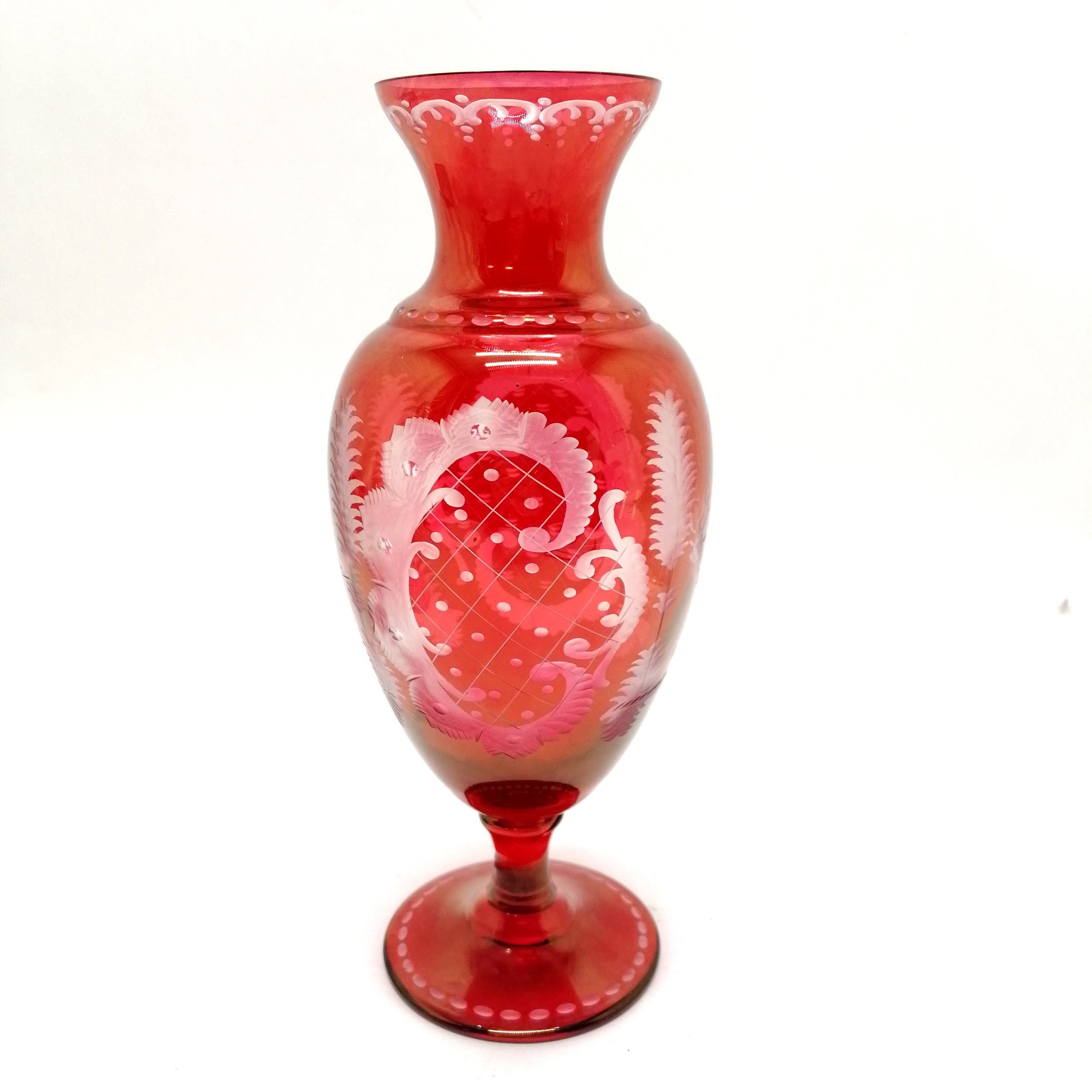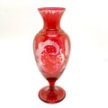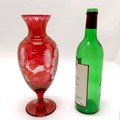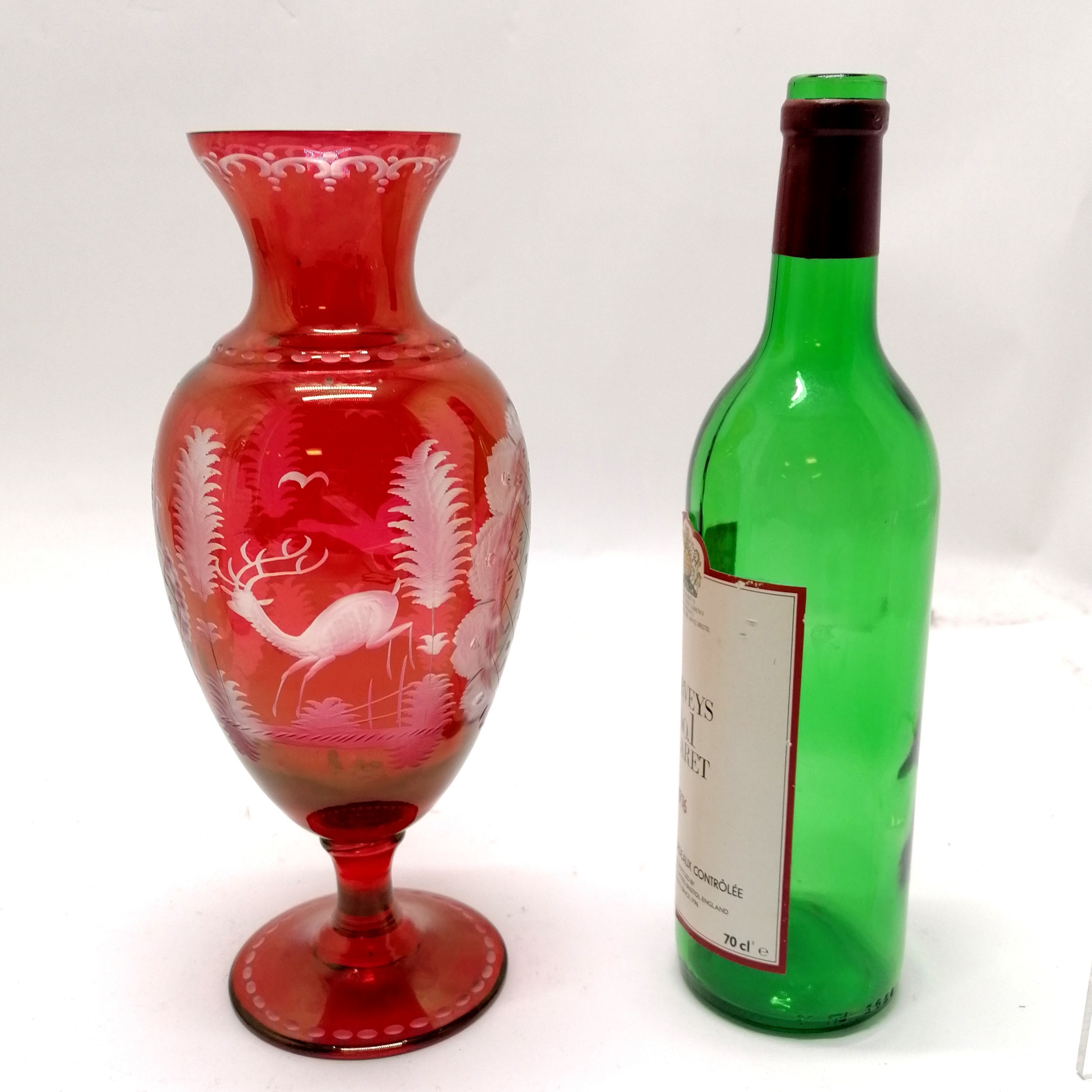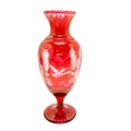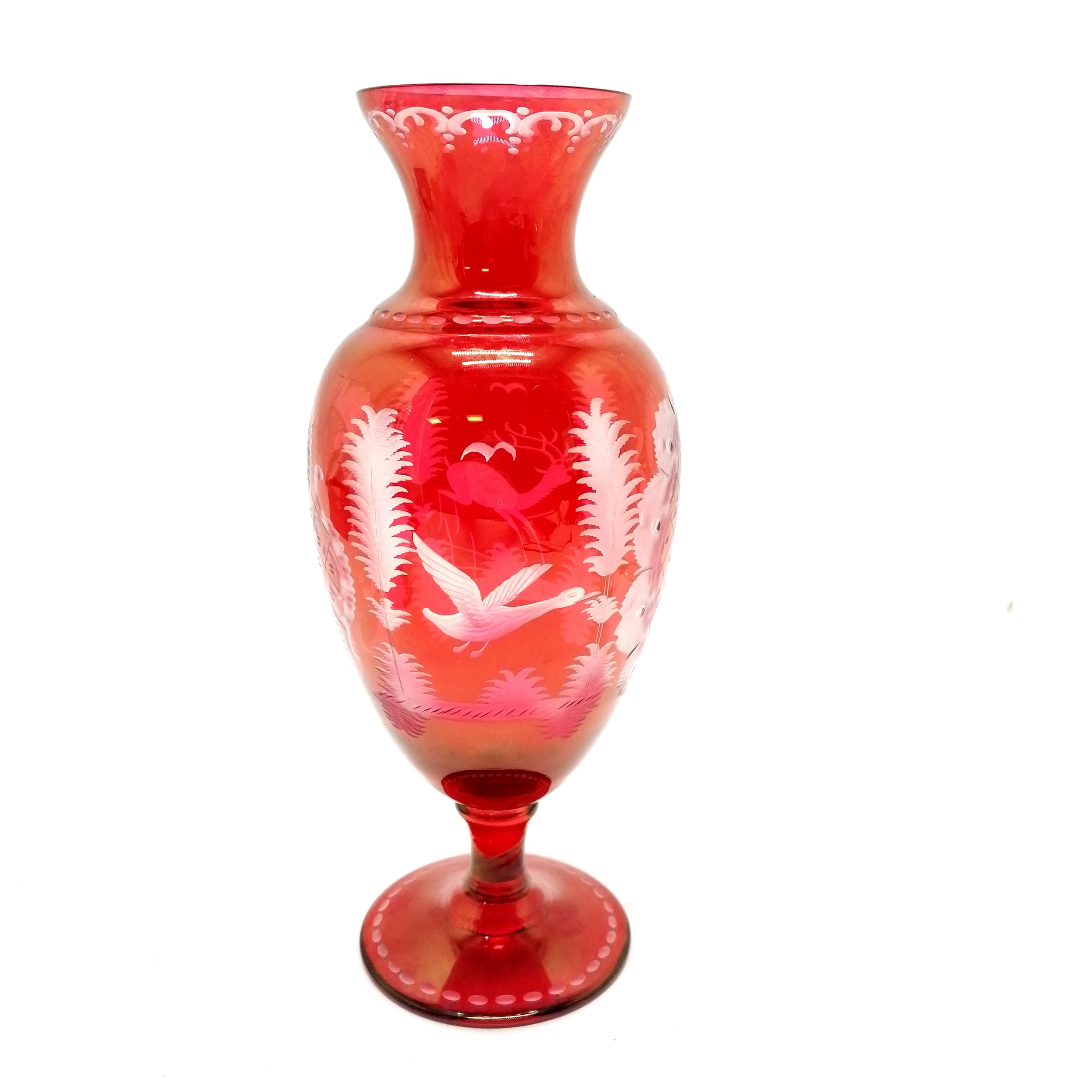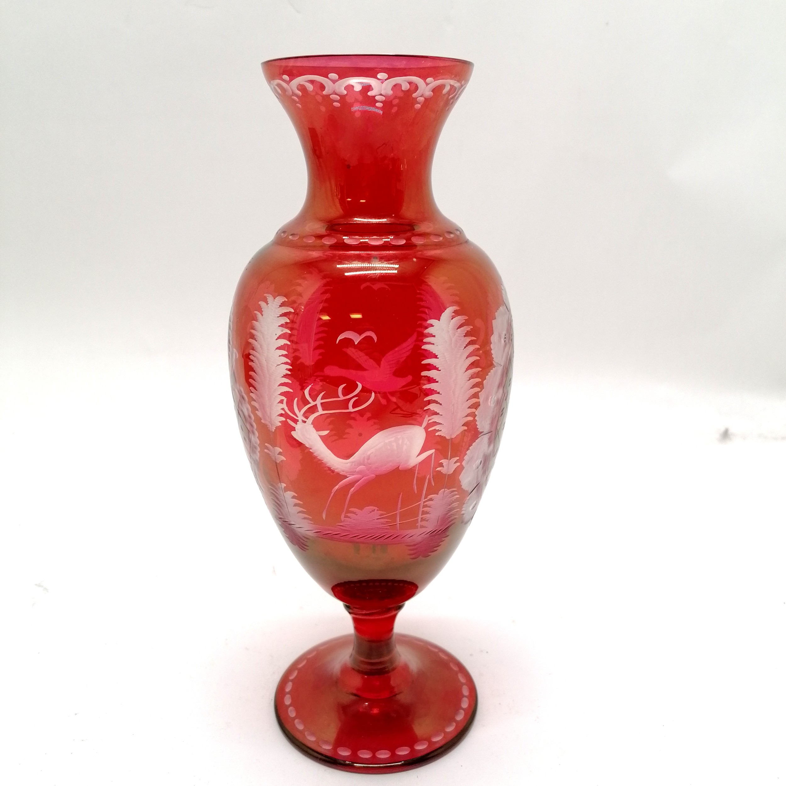 Bohemian glass red baluster vase with engraved detail of stag & bird in flight - 27.5cm high & no obvious damage