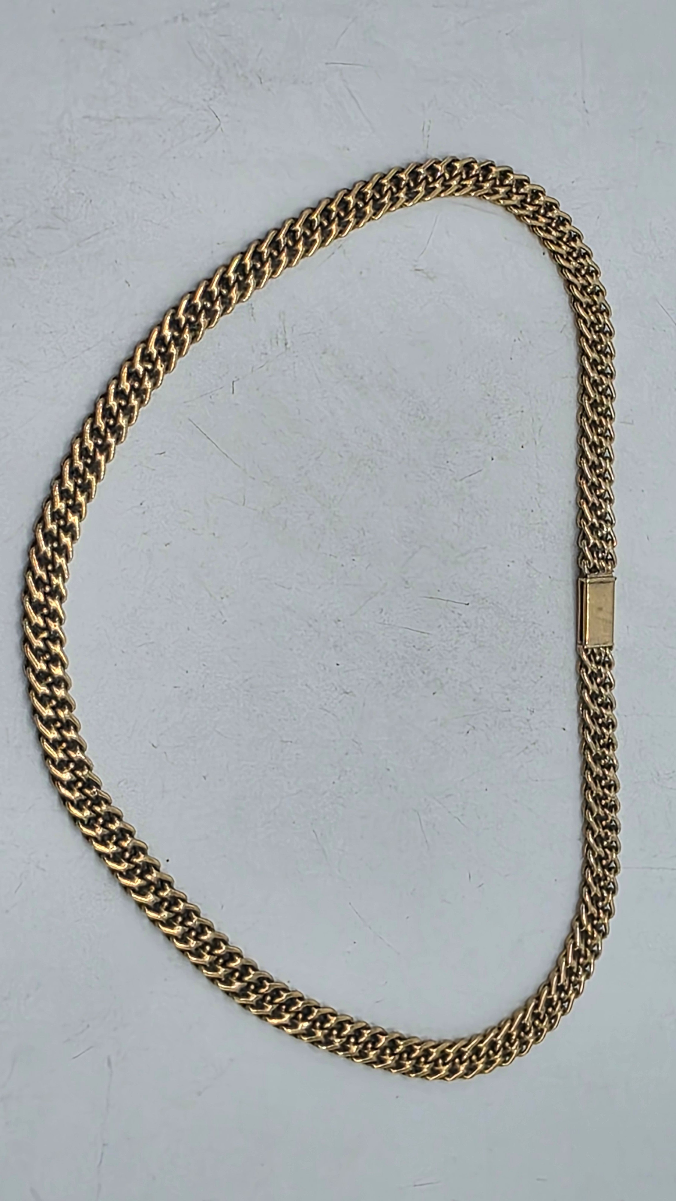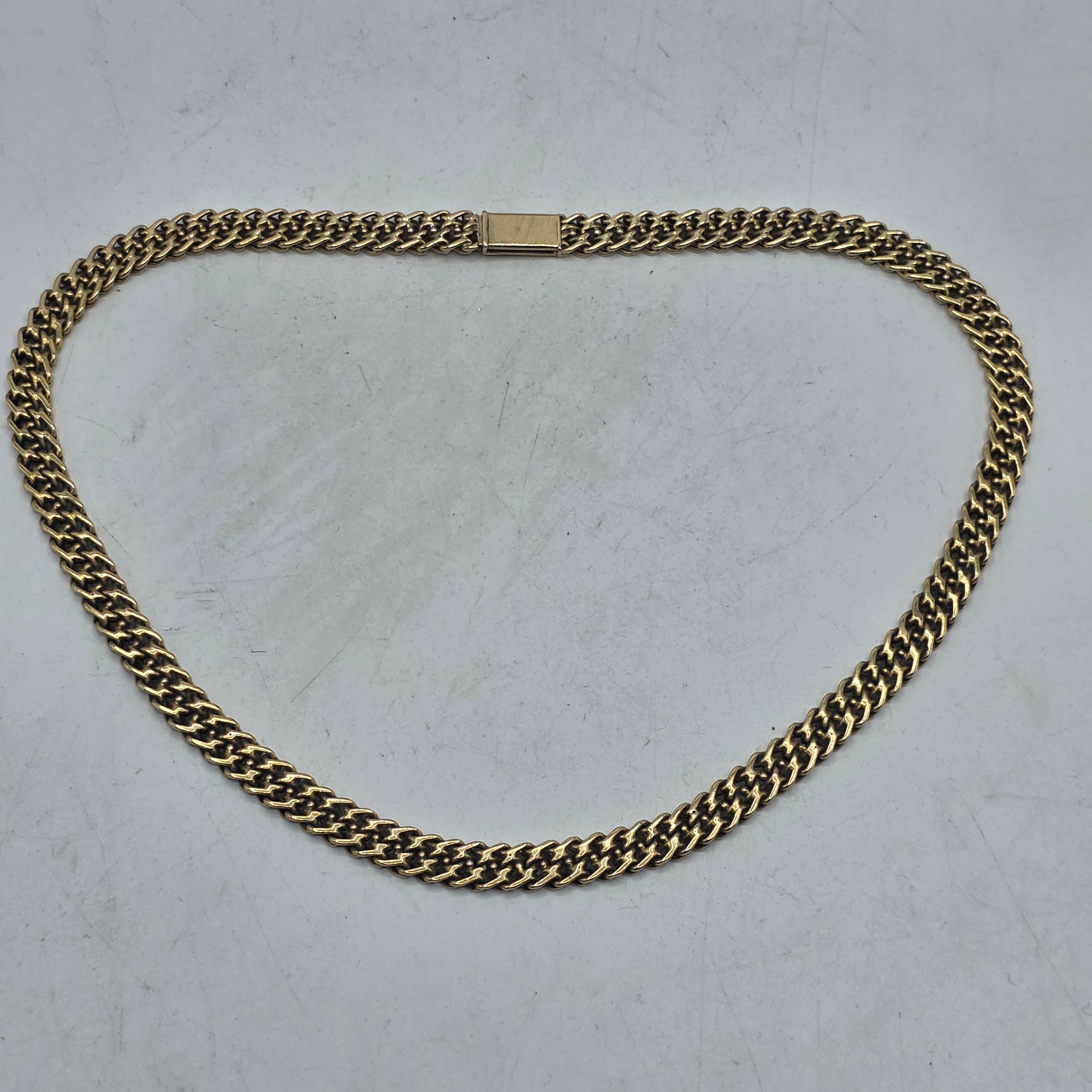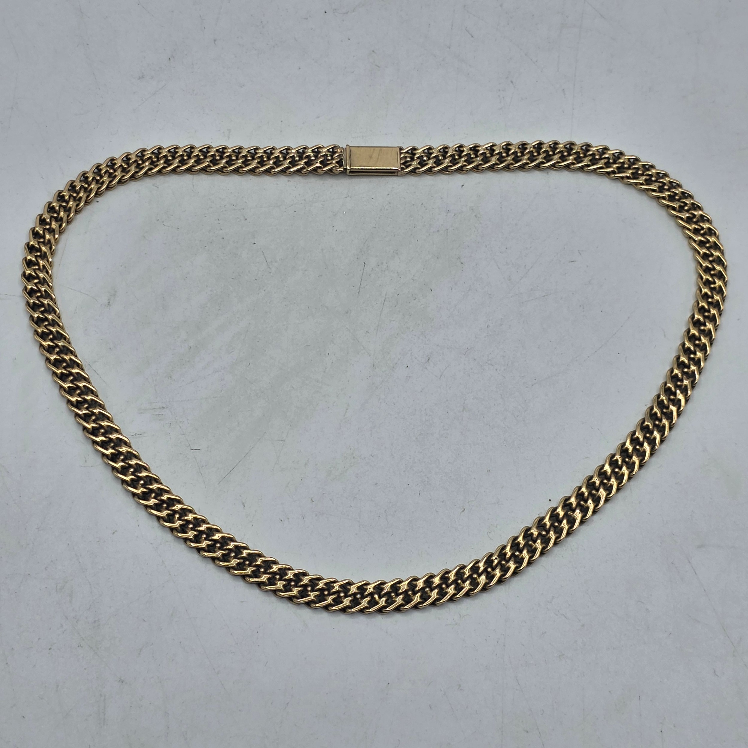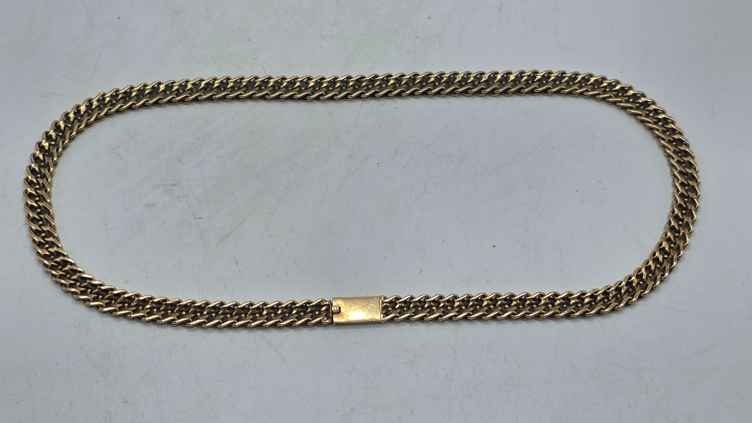 An unmarked yellow metal flat fancy link necklace 44 cm 35.5 g