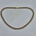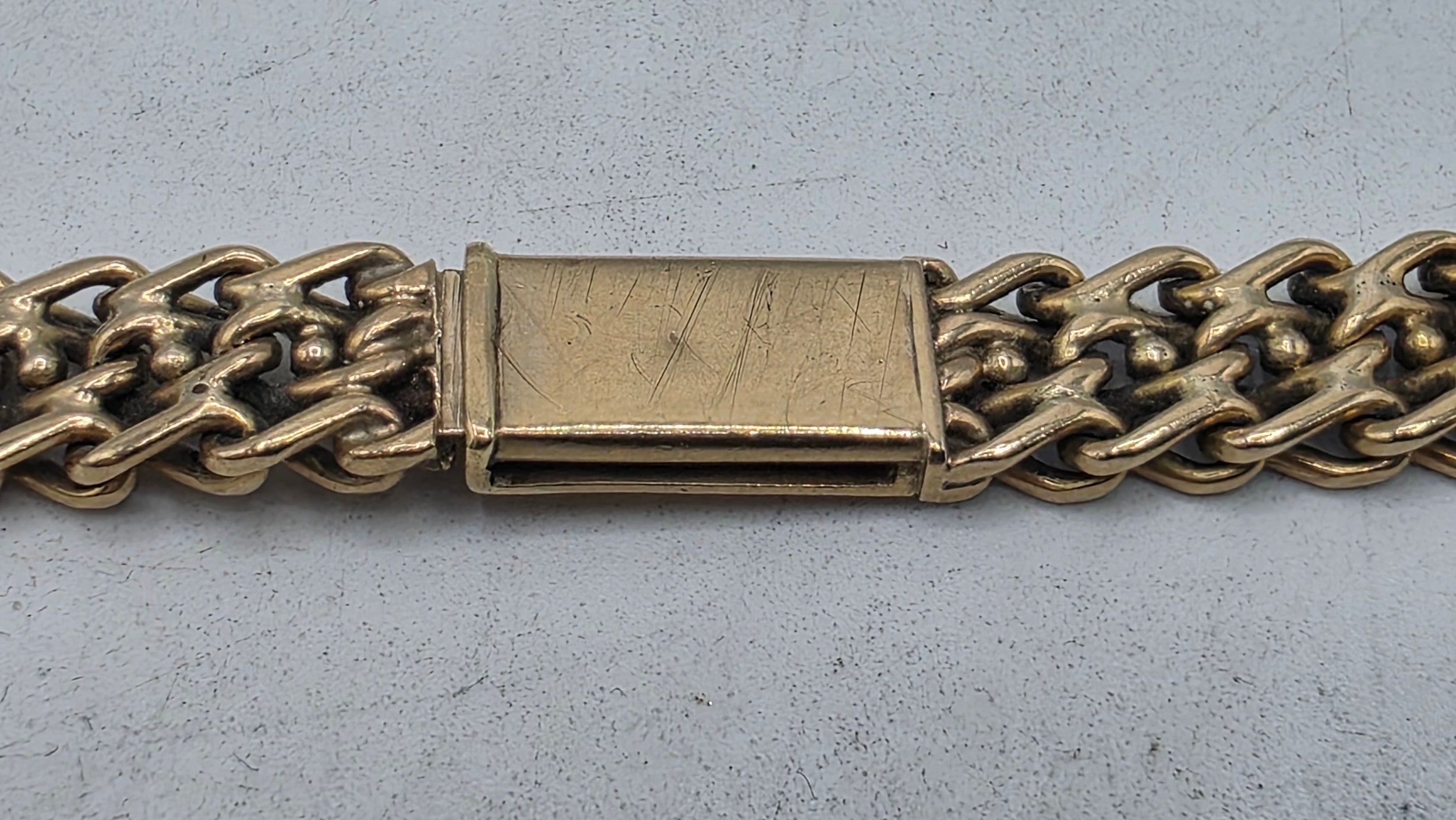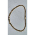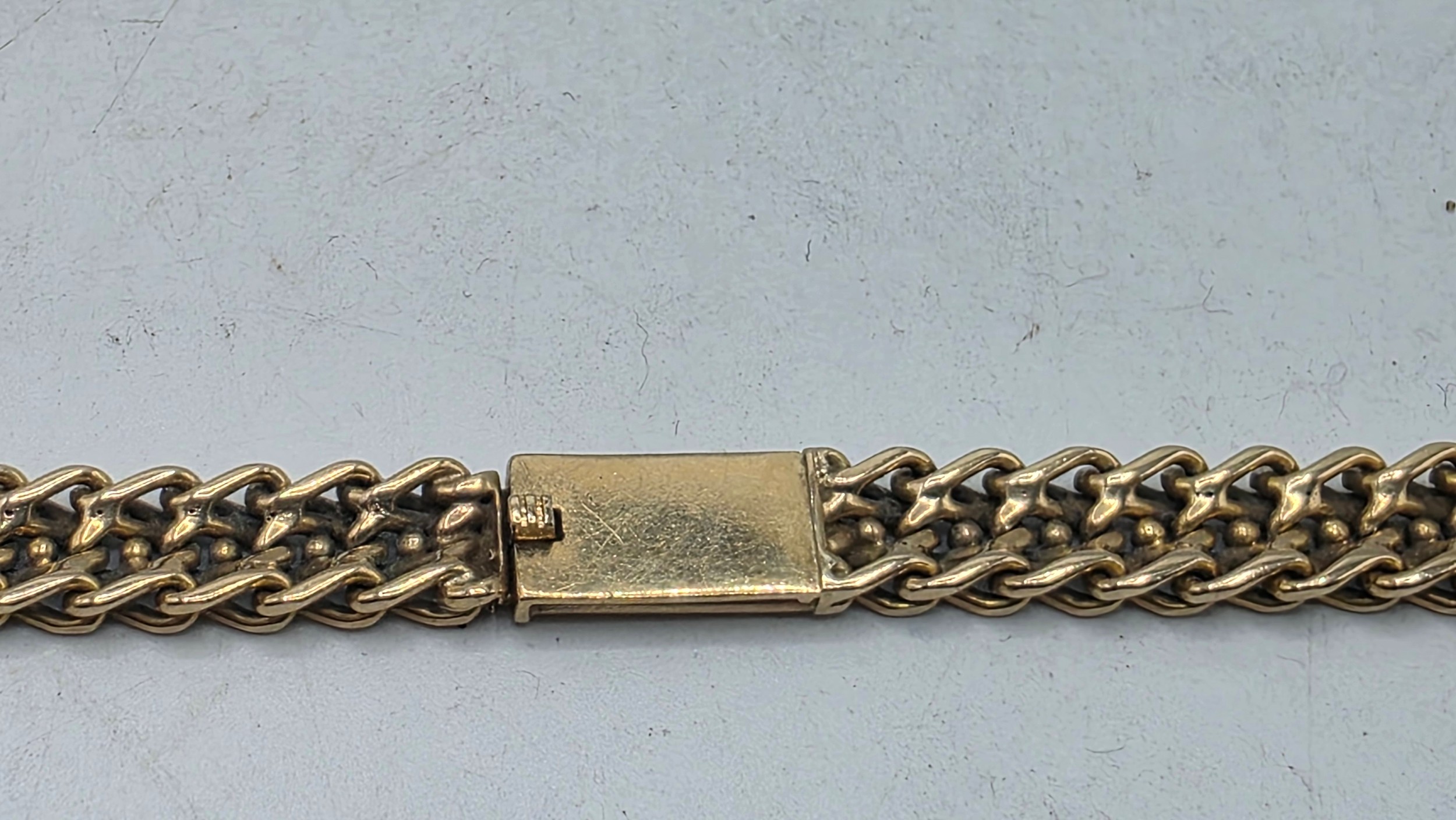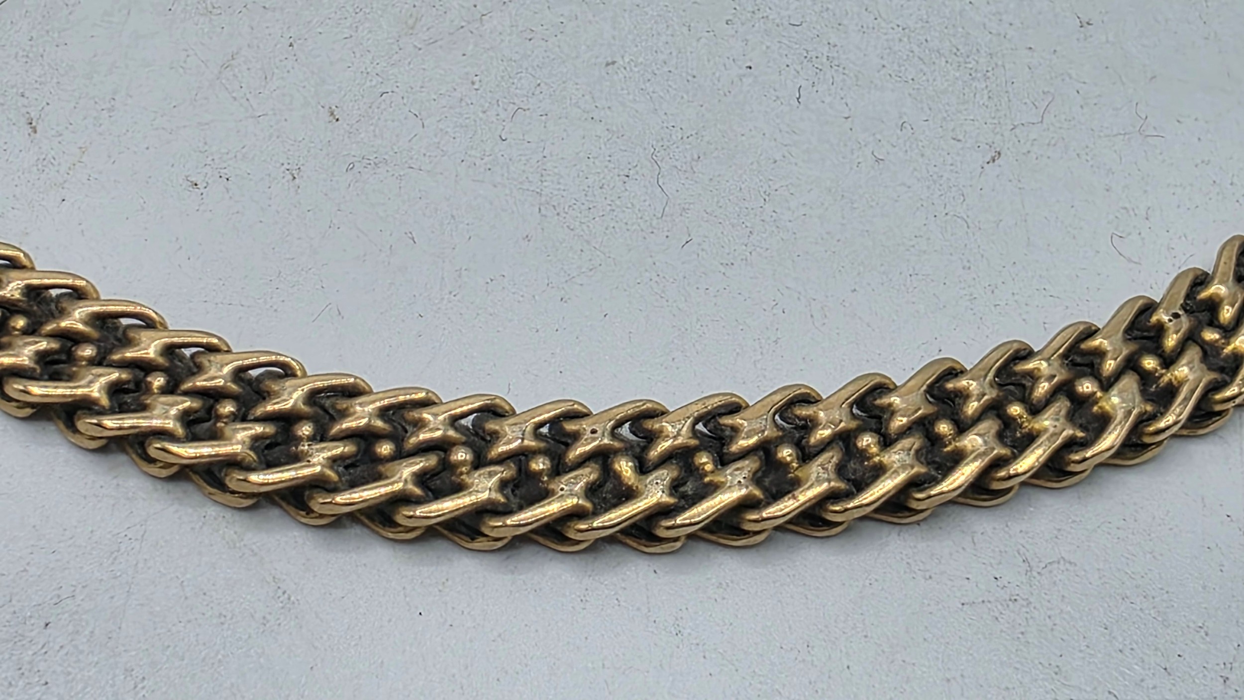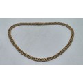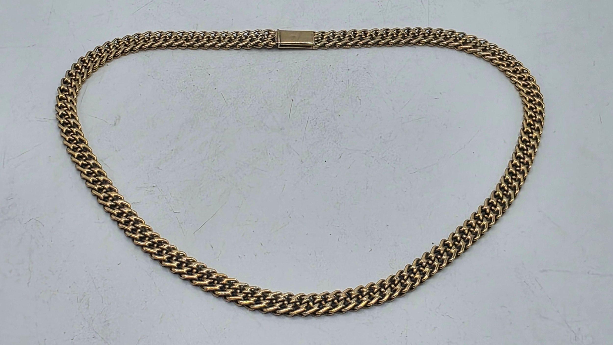An unmarked yellow metal flat fancy link necklace 44 cm 35.5 g
