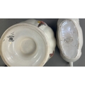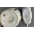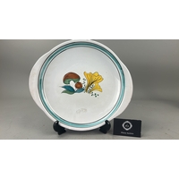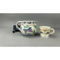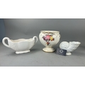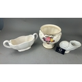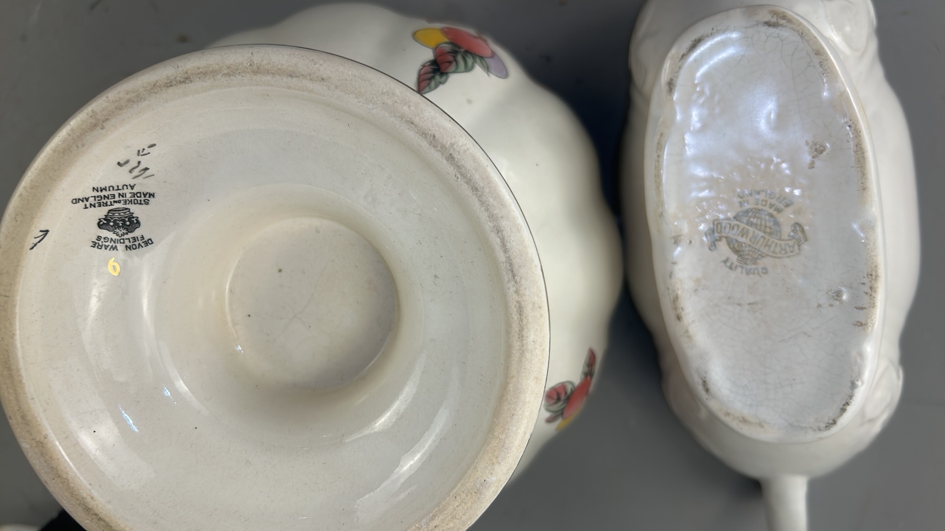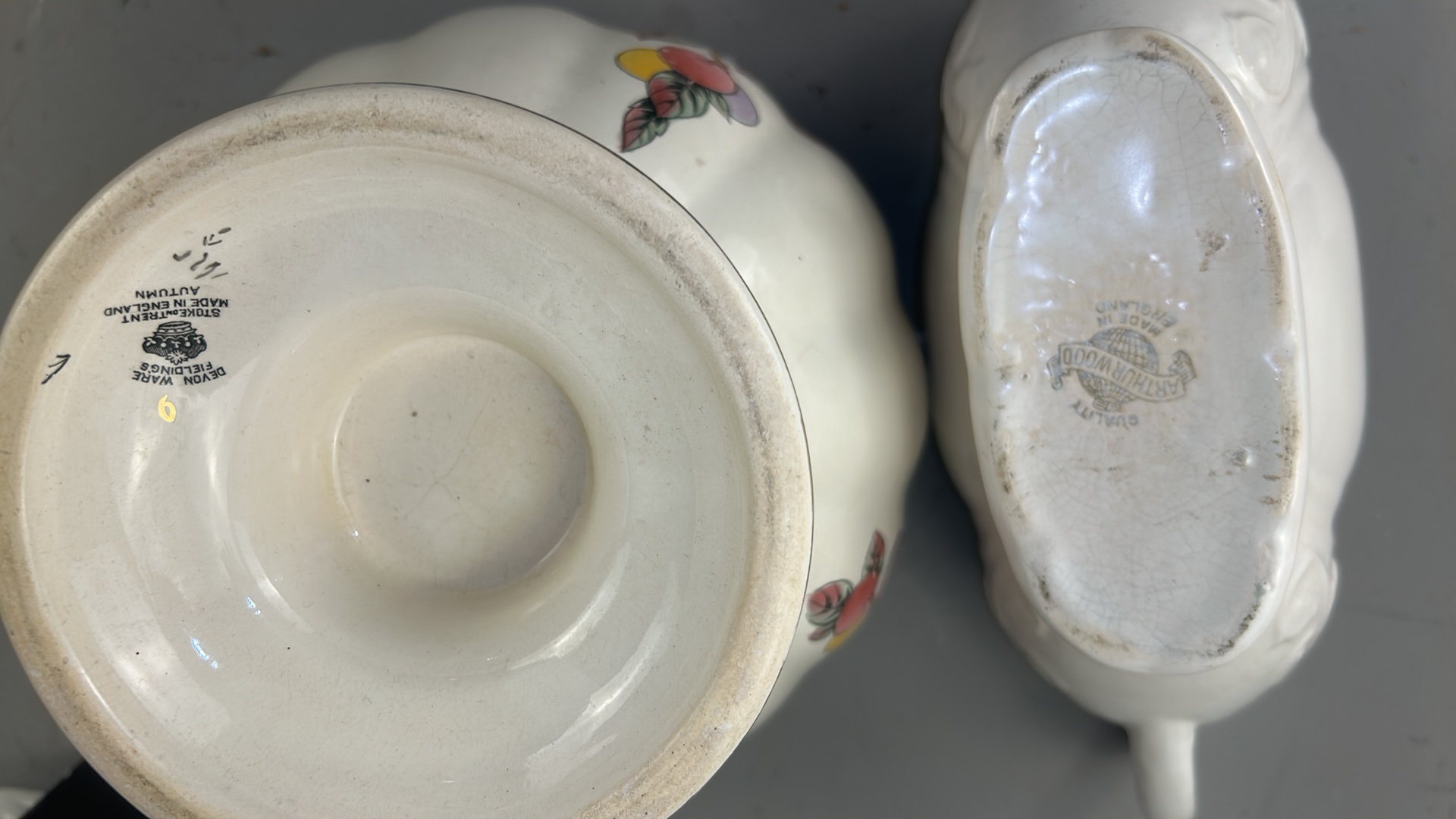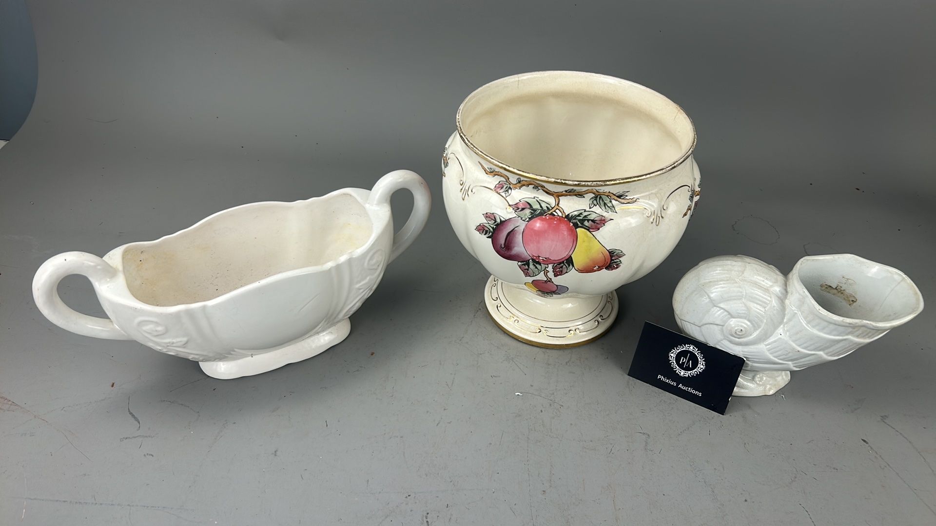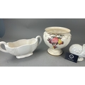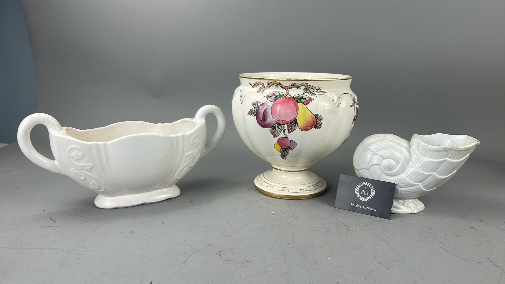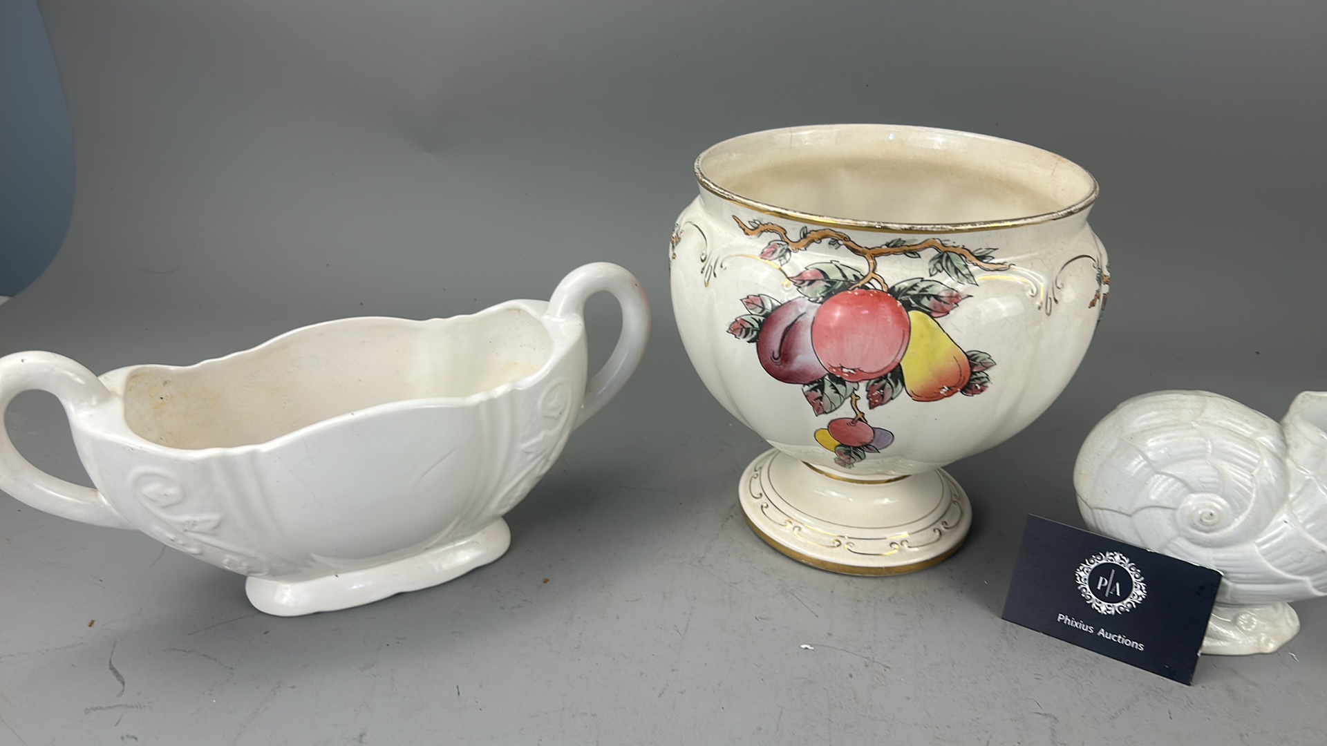 Group of 3 English earthenware pieces: Arthur Wood white twin-handled boat, Arthur Wood nautilus-form posy vase, and Fieldings Devon Ware ‘Autumn’ pedestal bowl with hand-painted fruit spray.