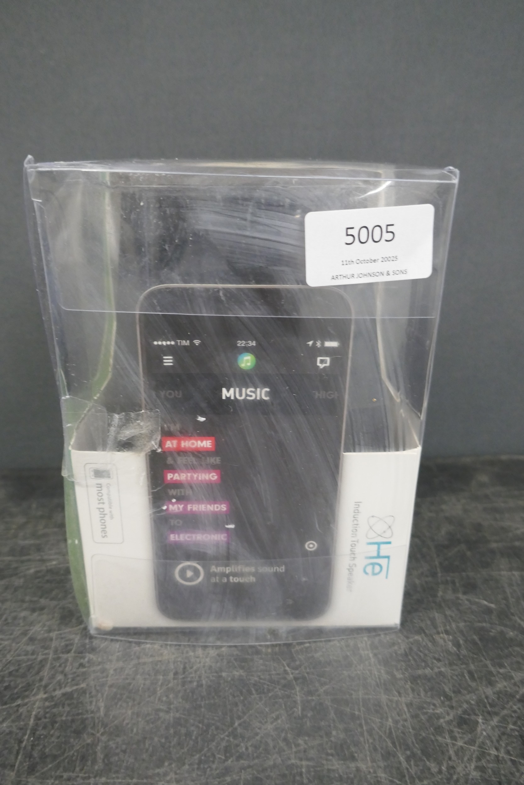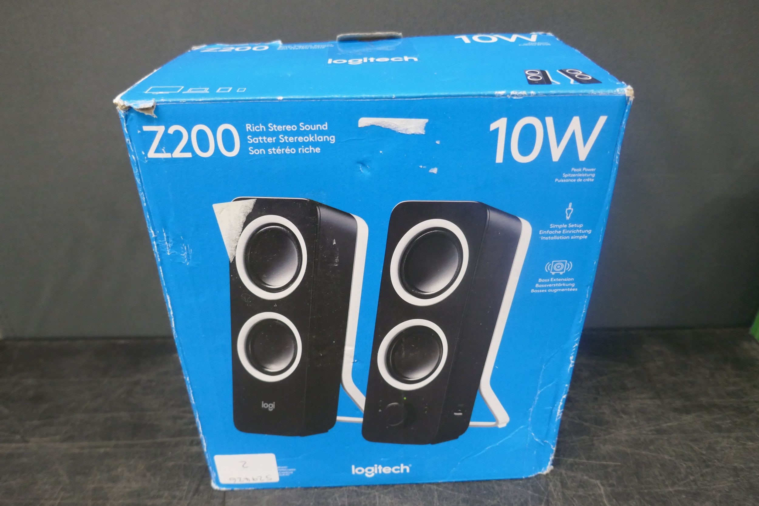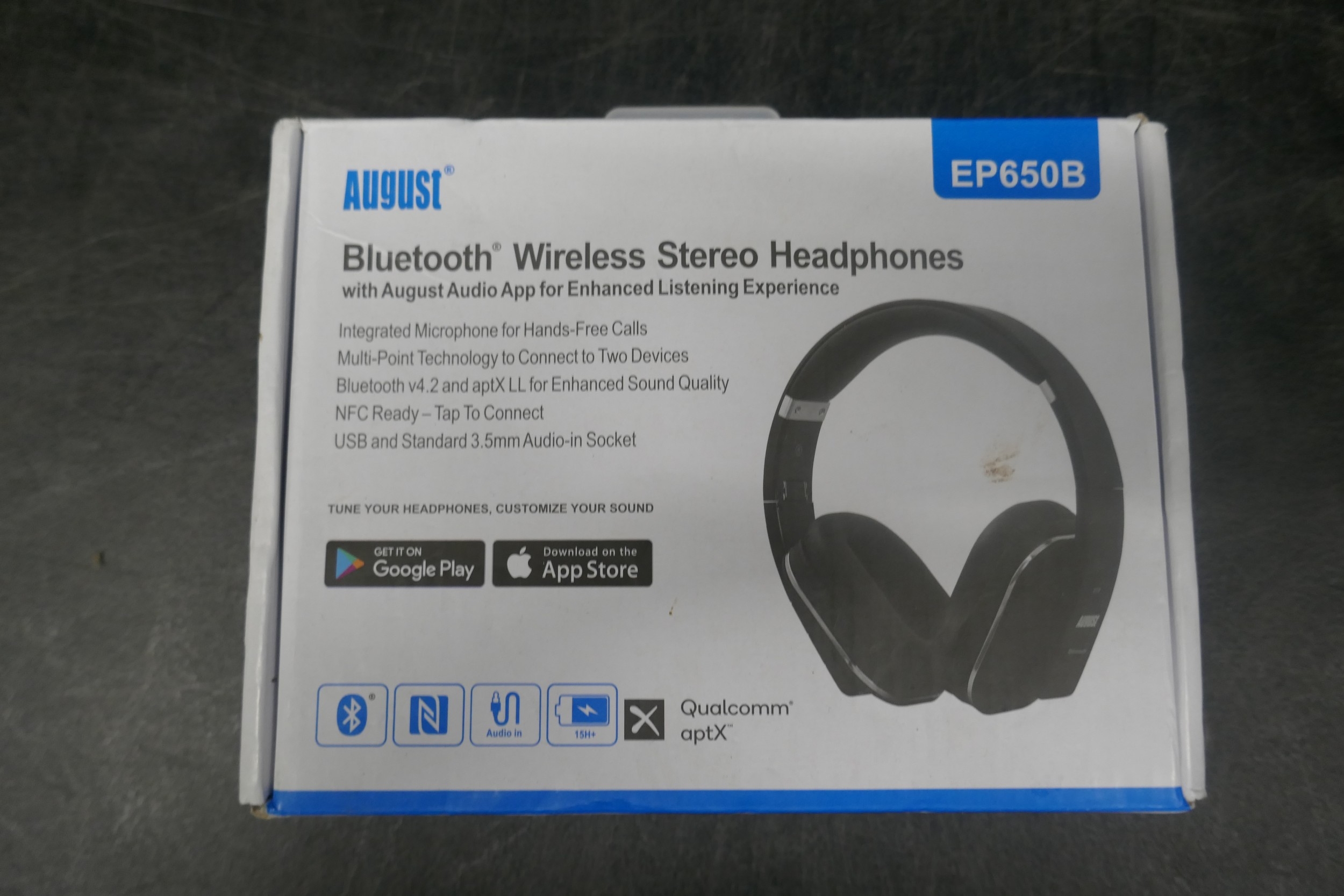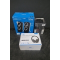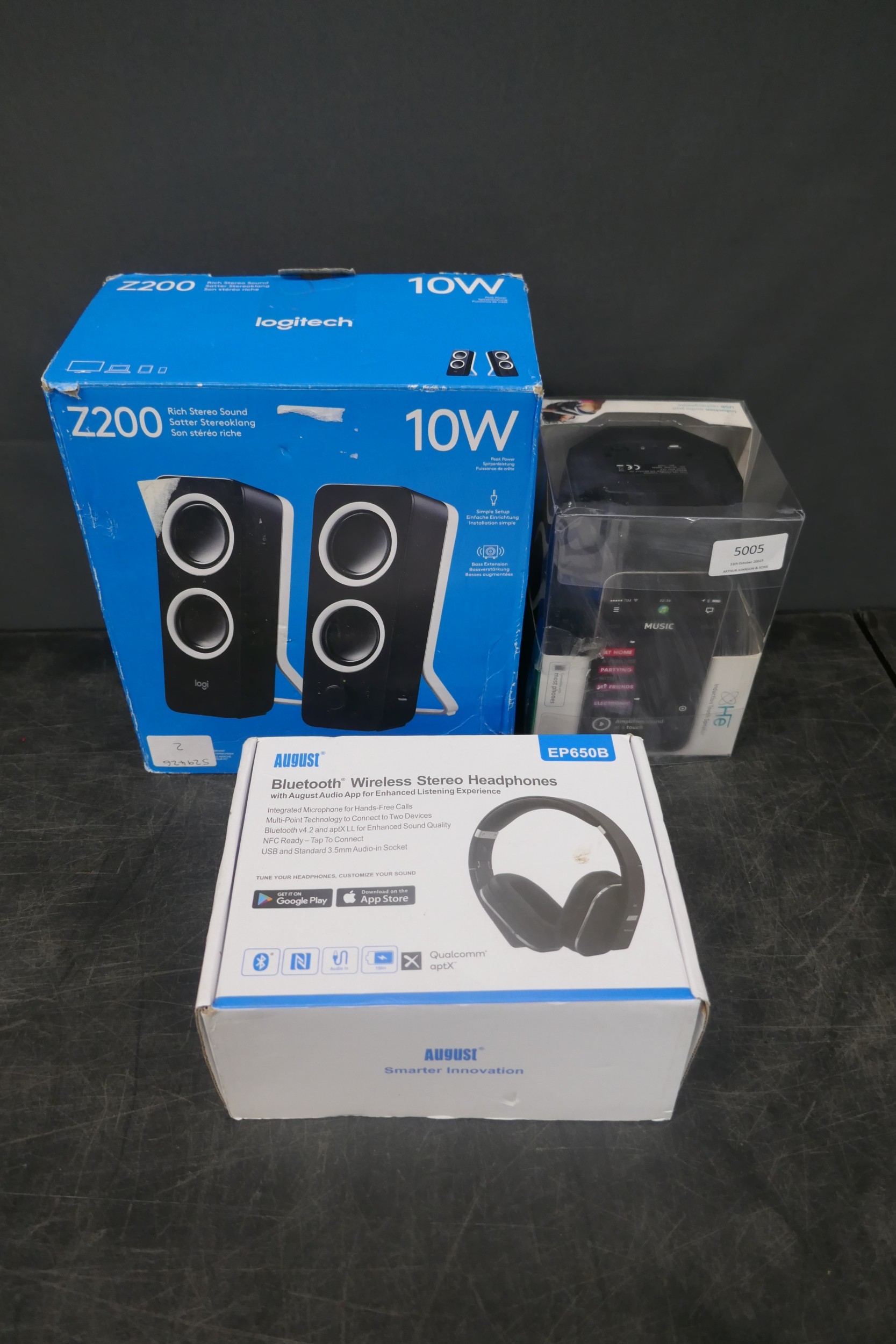 A pair of Logitech Z200 10W stereo speakers, a HE Induction rechargeable touch speaker and a pair of August EP650B Bluetooth wireless stereo headphones, unused