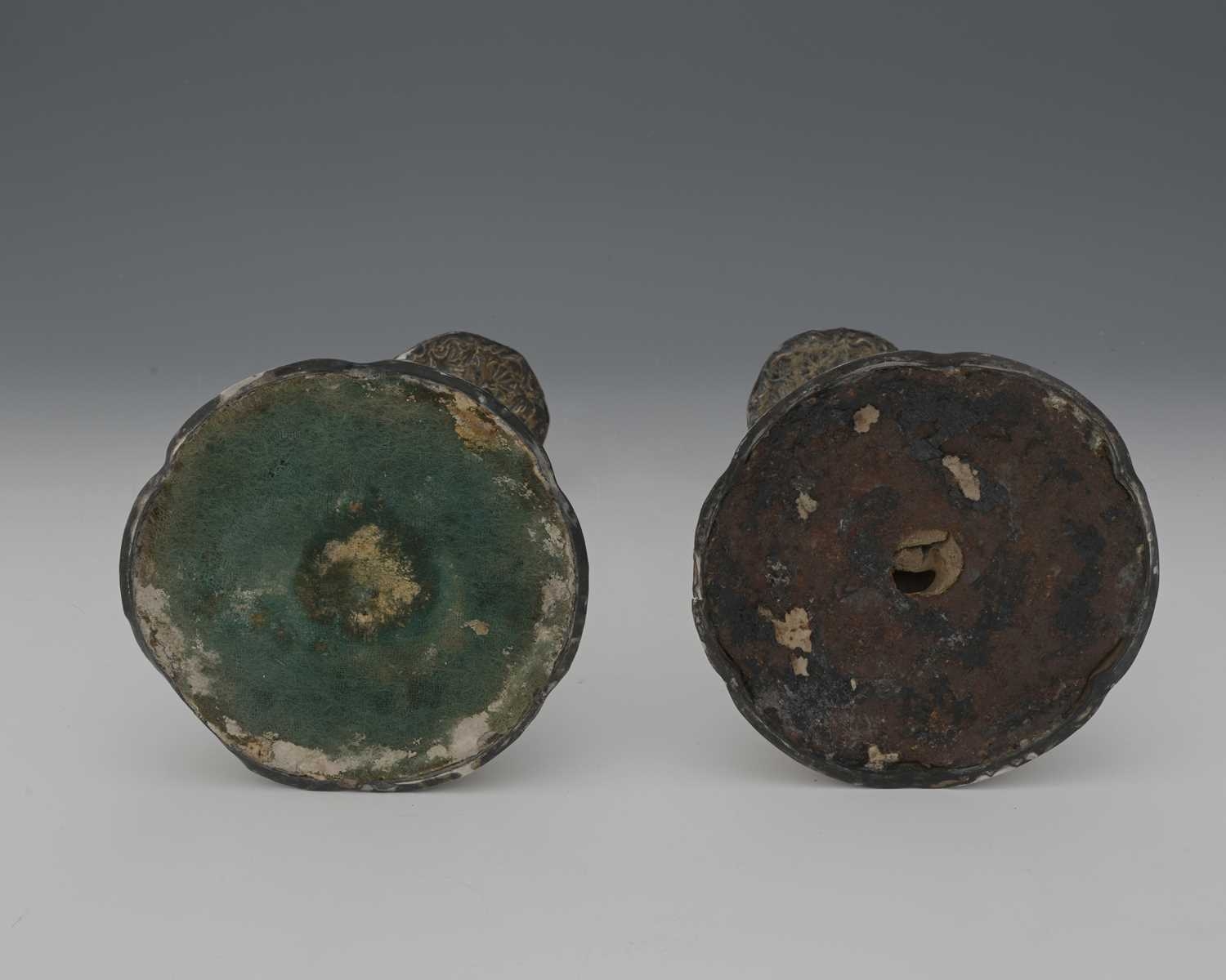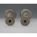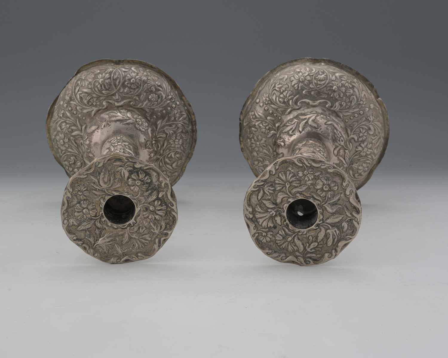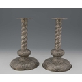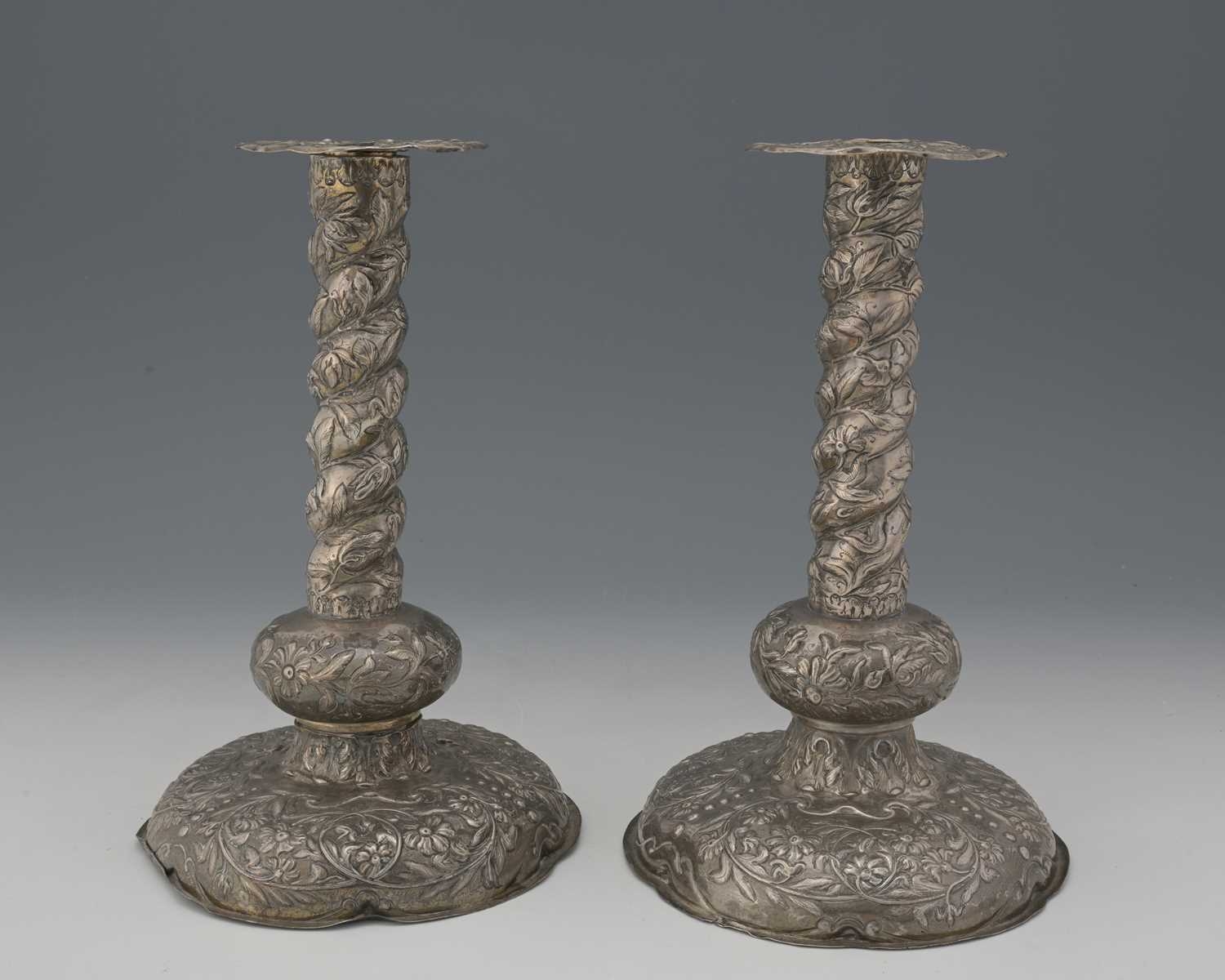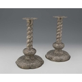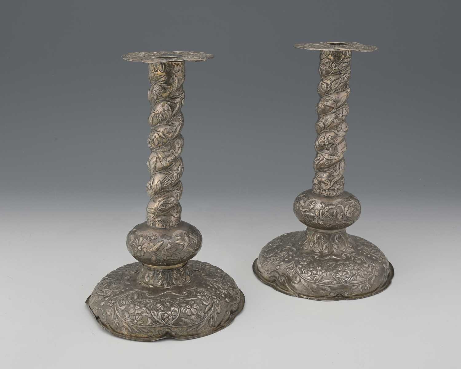 A pair of Dutch candlesticks, each with foliage and flower chased bases and spiral-fluted stems, each with detachable nozzles, the bases filled, height 29.5cm approx (2)