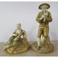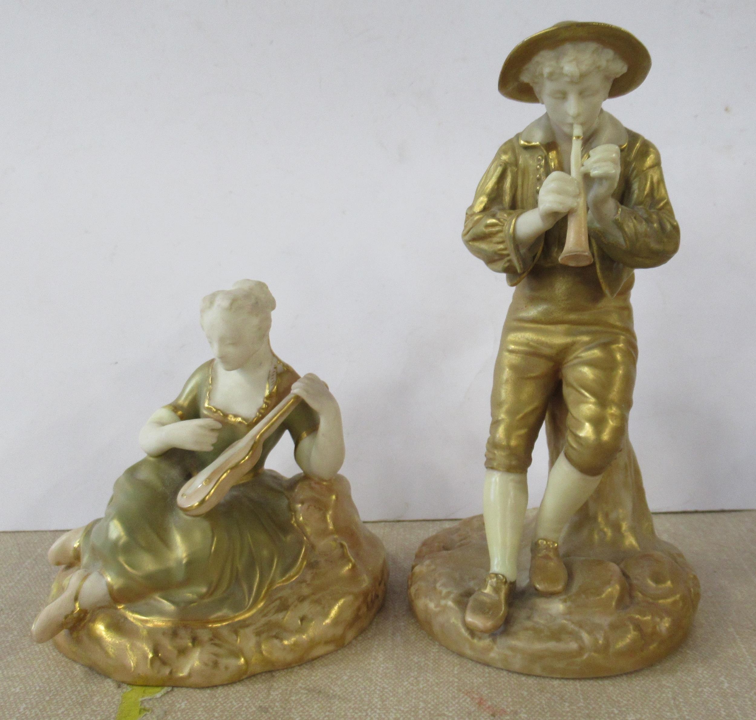 Two Royal Worcester gilded ivory figures, a seated woman playing the lute, model number 1547 and a man playing a pipe, model number 1803, height 3.5ins and 6ins