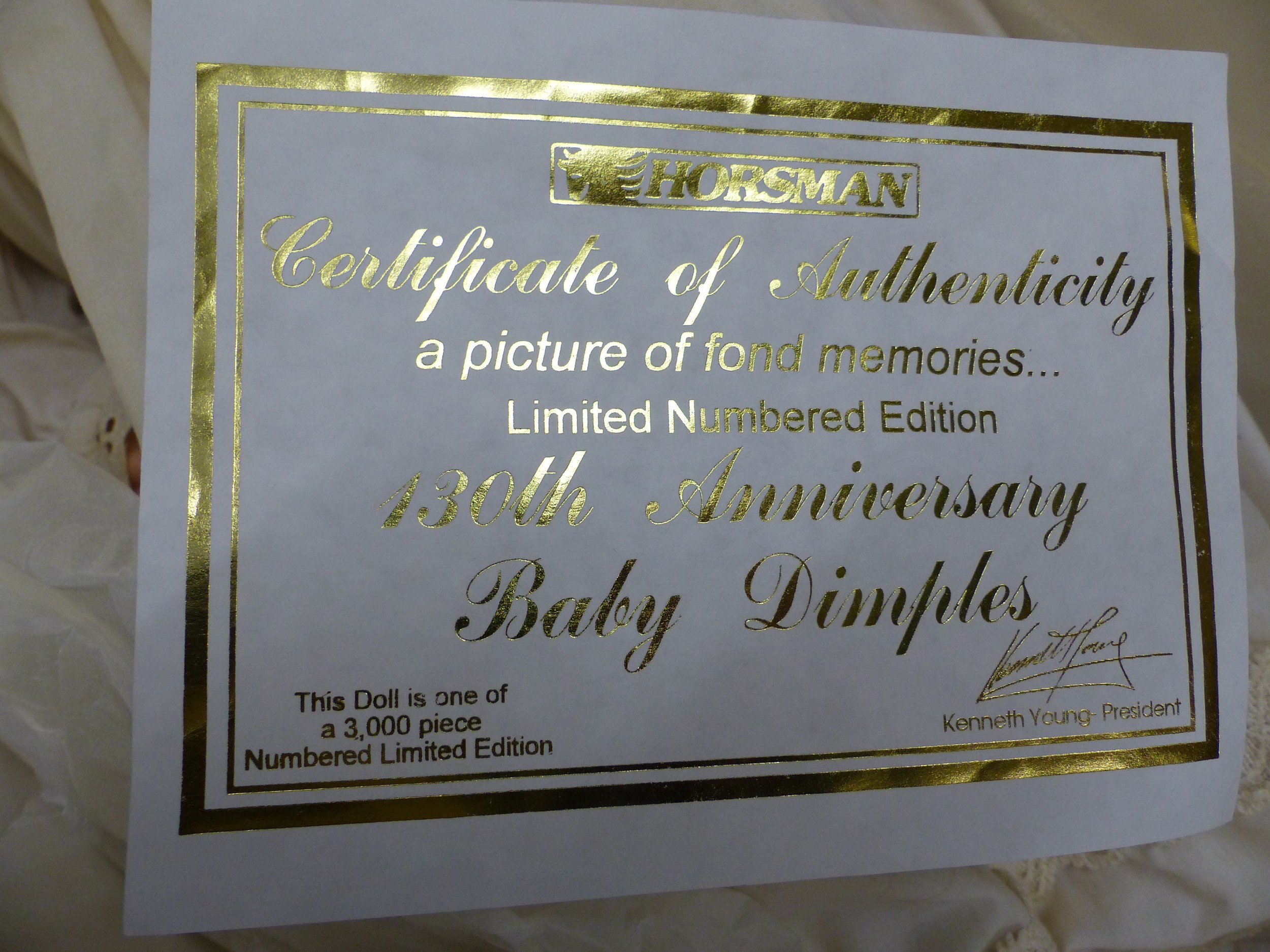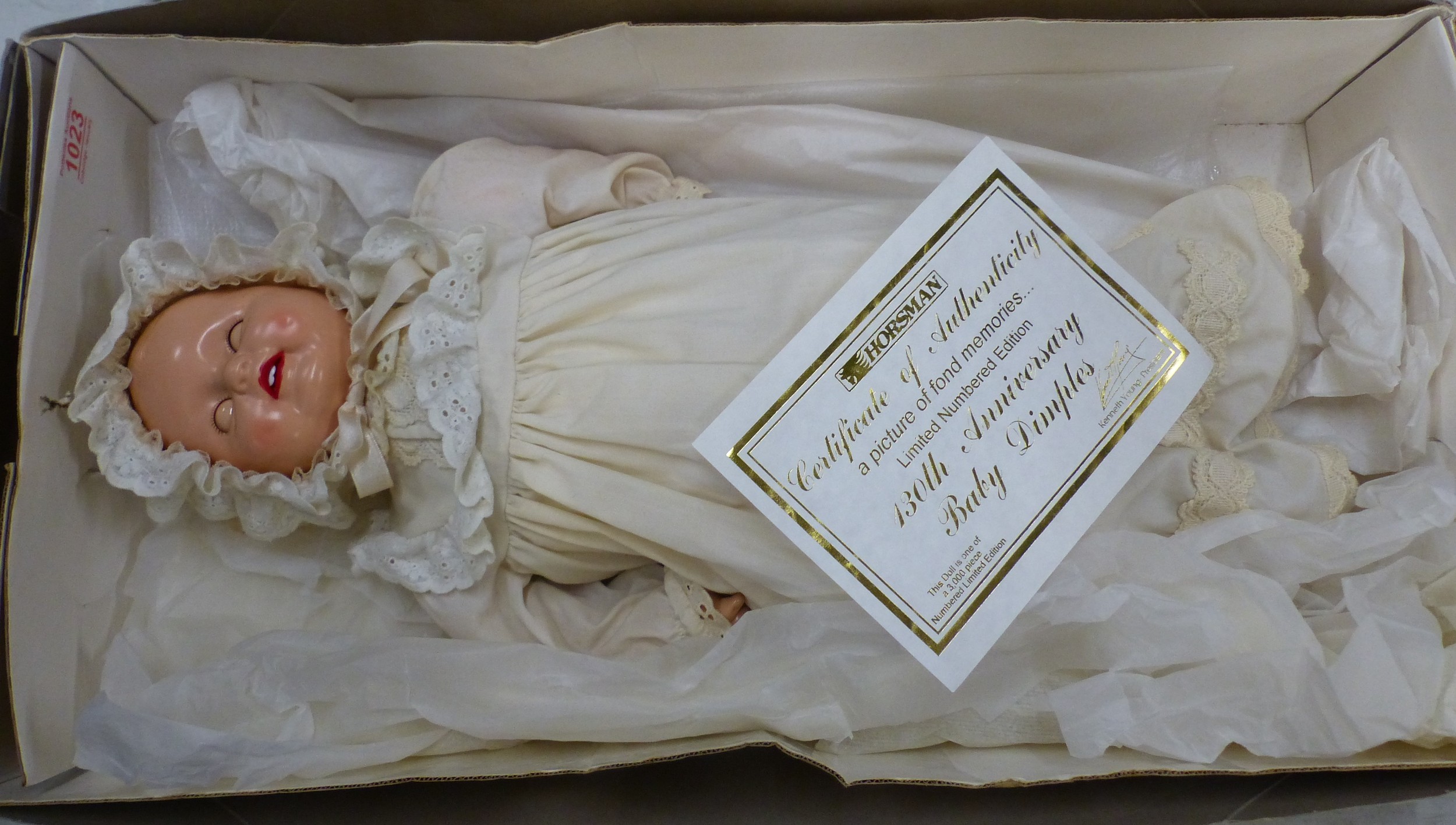 Boxed limited edition Horsman 130th Anniversary 'Baby Dimples' doll, composition head and arms, cloth body and legs, with CoA, height 49cm.