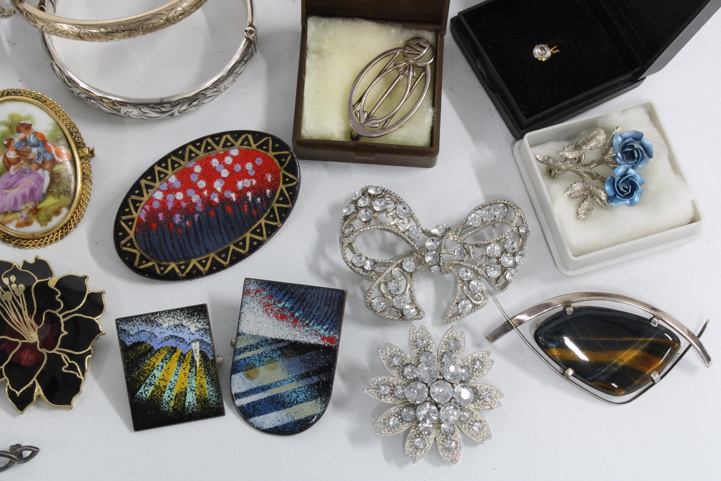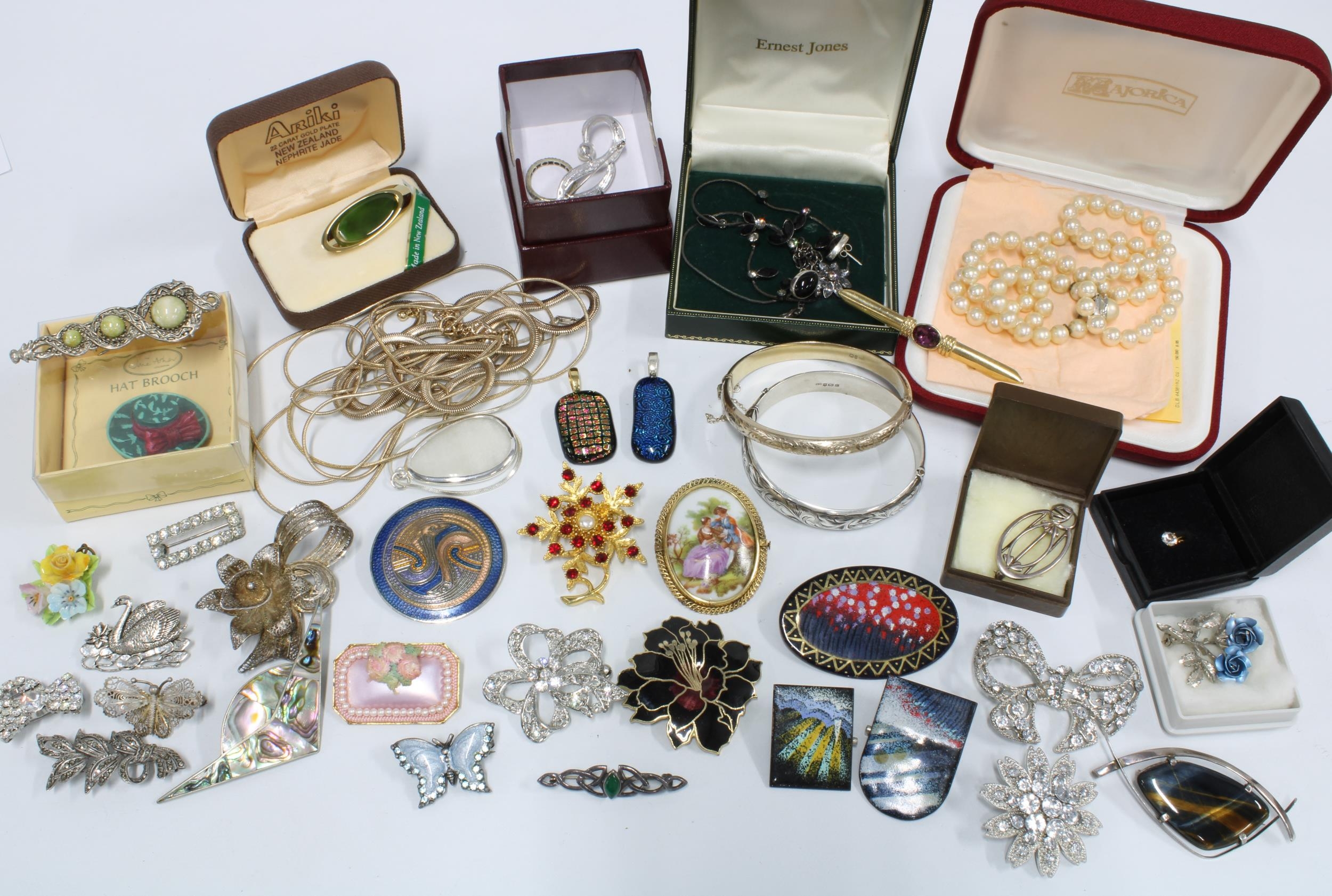 Silver brooches, two silver bangles, gold plated nephrite jade brooch and a collection of costume jewellery, etc (a lot)