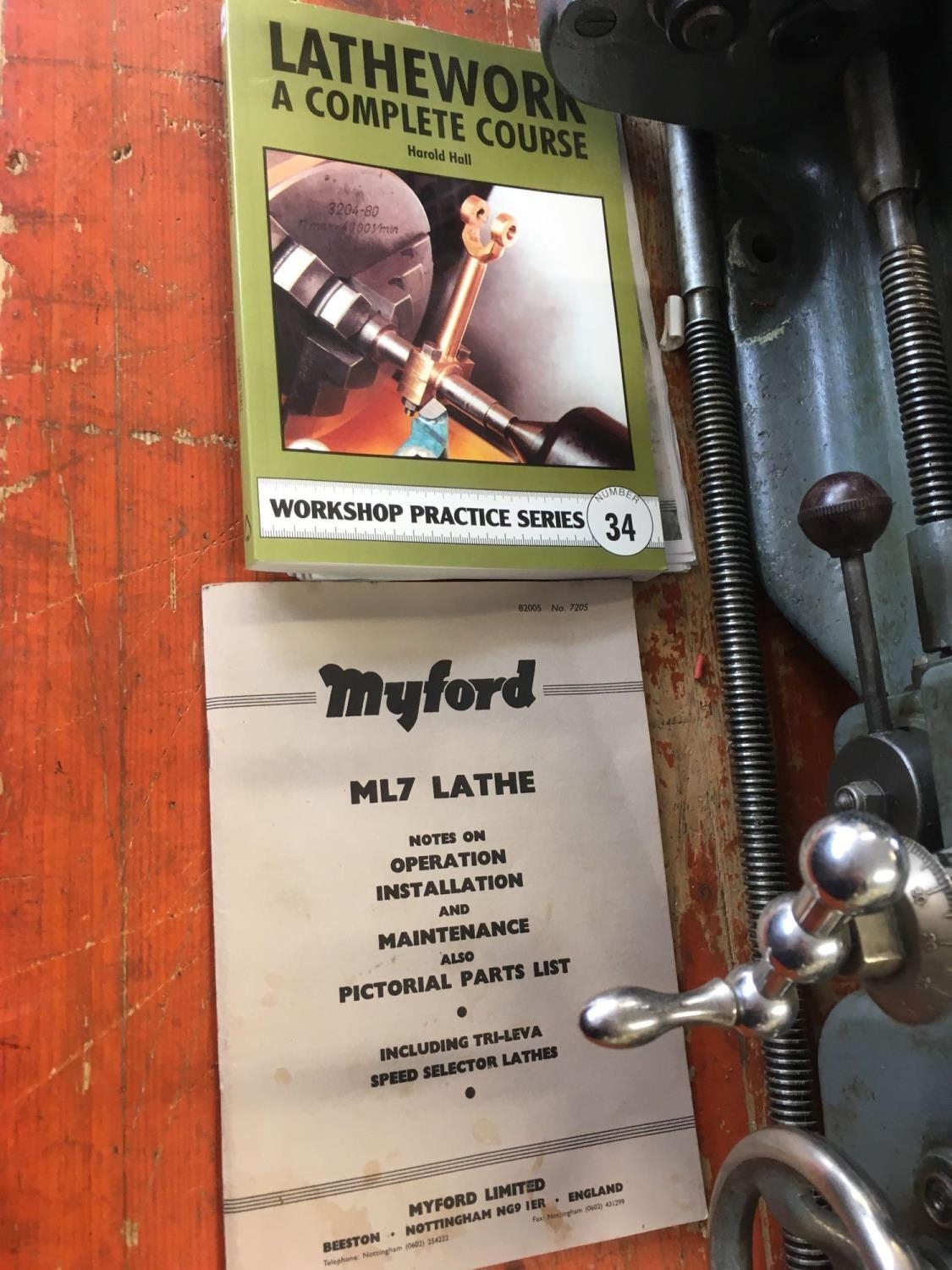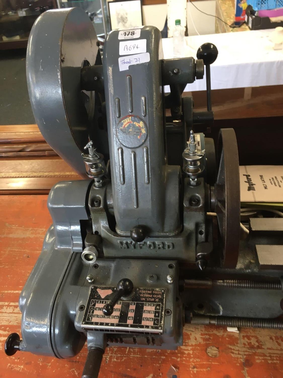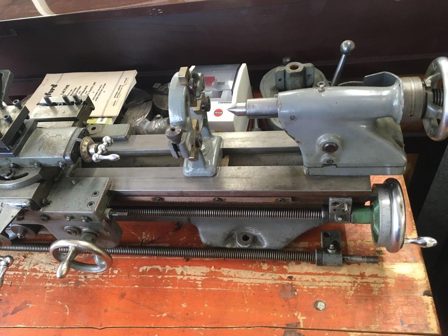 MYFORD ML7 3.5'' CENTRE HEIGHT LATHE WITH LEAD SCREW GEAR BOX, TOOL POSY & SPARE TOOL POST, (INDEX PLATE MISSING), 9'' FACE PLATE, 6'' 4 JAW INDEPENDENT CHUCK, 4'' 3 JAW SELF CENTERING CHUCK (ONLY 3 JAWS PRESENT), SPARE OLD CROSS SLIDE (RUSTY) FIXED STEADY, 18 CHANGE WHEELS, TWO DRILL CHUCKS, ROTATING CENTRE, FLY CUTTER, OLD BACK GEAR COVER (REPLACED BY GEAR BOX), MANUAL, 230 - 240V SINGLE PHASE, WYLEX SWITCH HEAVY MACHINE