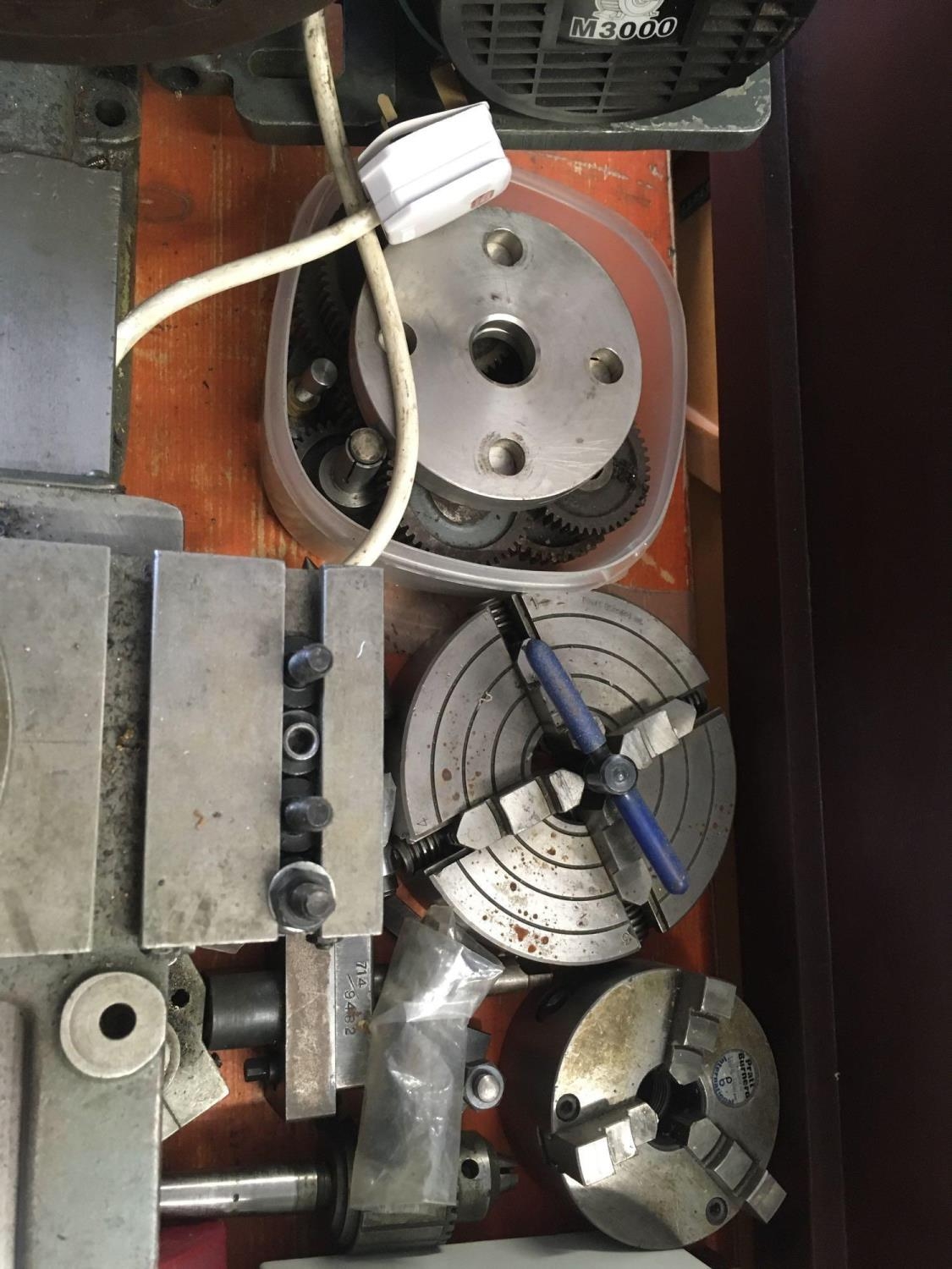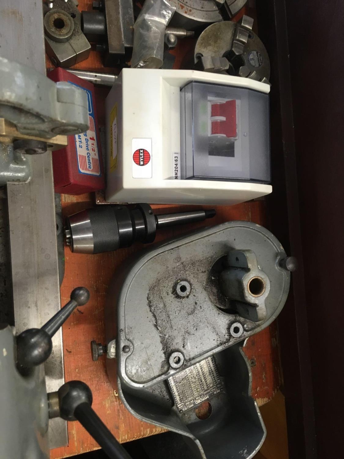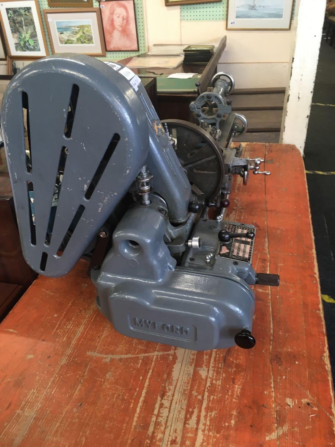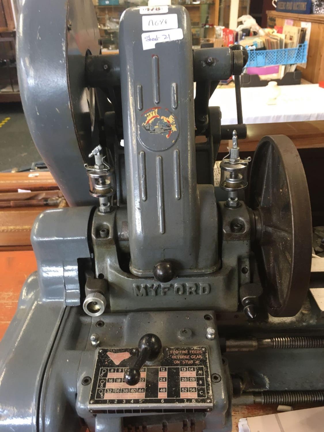 MYFORD ML7 3.5'' CENTRE HEIGHT LATHE WITH LEAD SCREW GEAR BOX, TOOL POSY & SPARE TOOL POST, (INDEX PLATE MISSING), 9'' FACE PLATE, 6'' 4 JAW INDEPENDENT CHUCK, 4'' 3 JAW SELF CENTERING CHUCK (ONLY 3 JAWS PRESENT), SPARE OLD CROSS SLIDE (RUSTY) FIXED STEADY, 18 CHANGE WHEELS, TWO DRILL CHUCKS, ROTATING CENTRE, FLY CUTTER, OLD BACK GEAR COVER (REPLACED BY GEAR BOX), MANUAL, 230 - 240V SINGLE PHASE, WYLEX SWITCH HEAVY MACHINE
