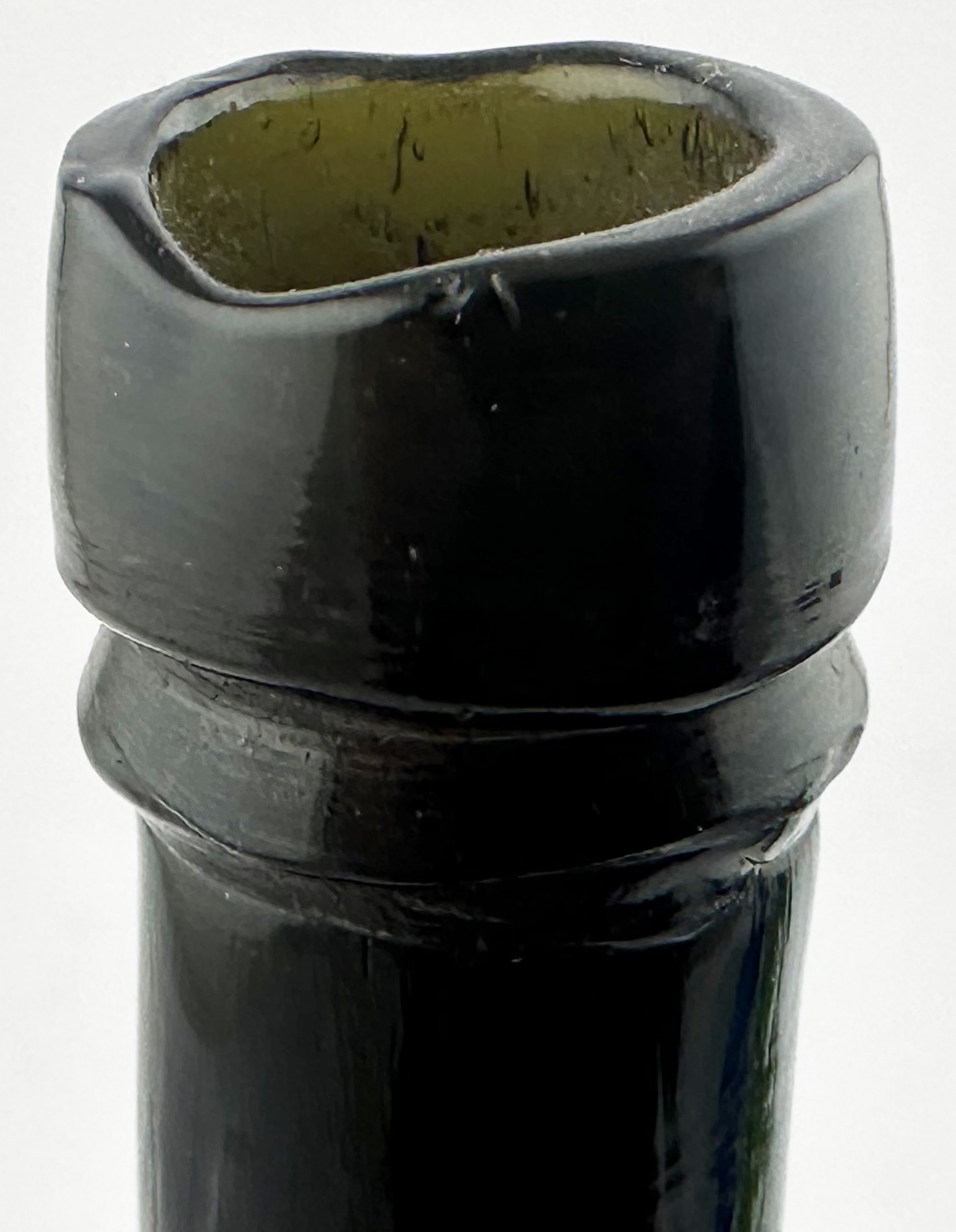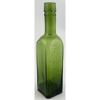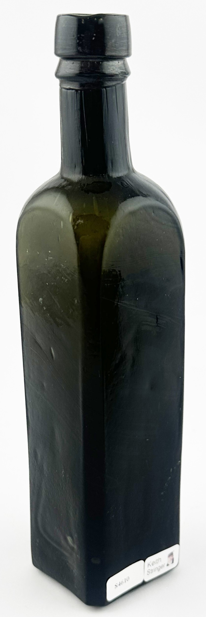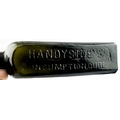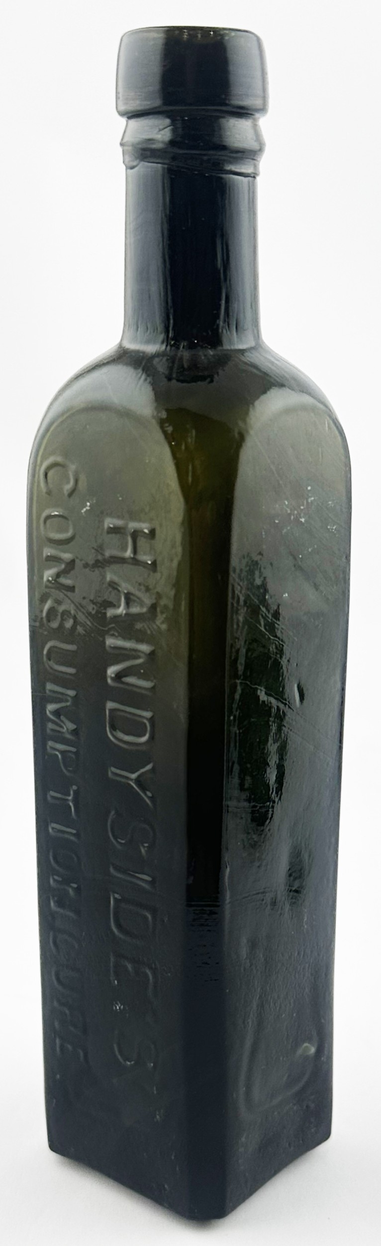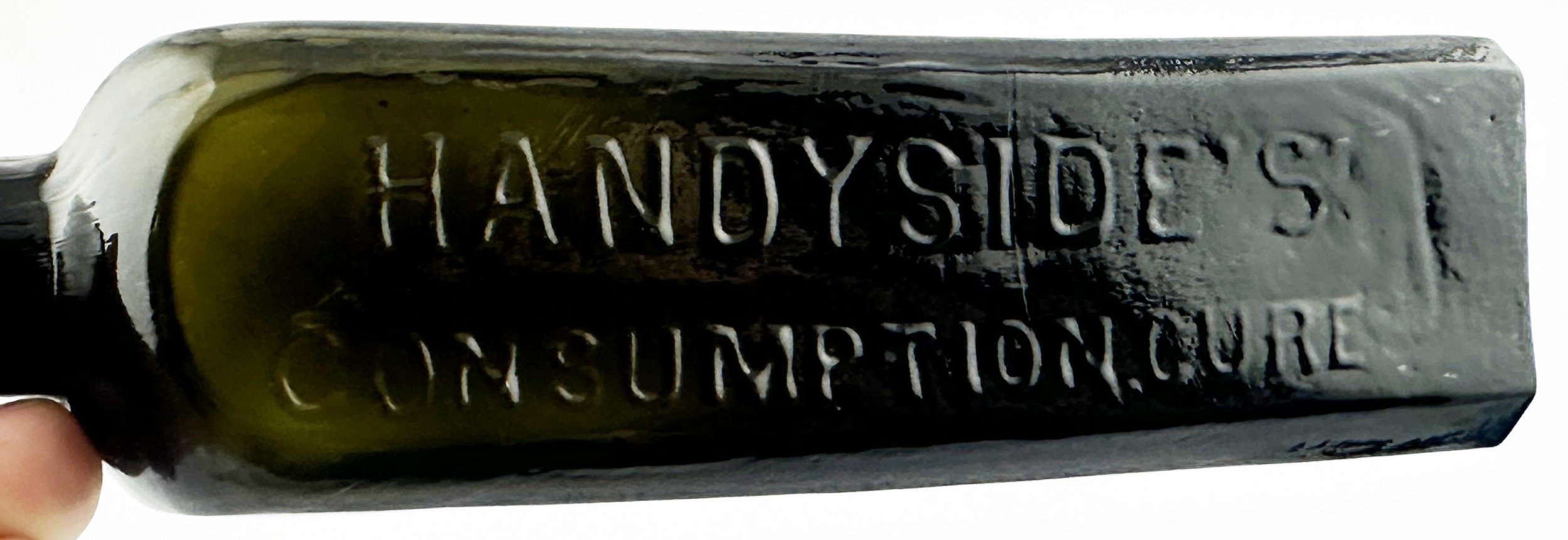 HANDYSIDES CONSUMPTION CURE BOTTLE. 8ins tall. Black glass (very dark green) sauce shape. Vertically embossed letters. Usual super crude manufacture. Keith Stringer Collection.