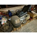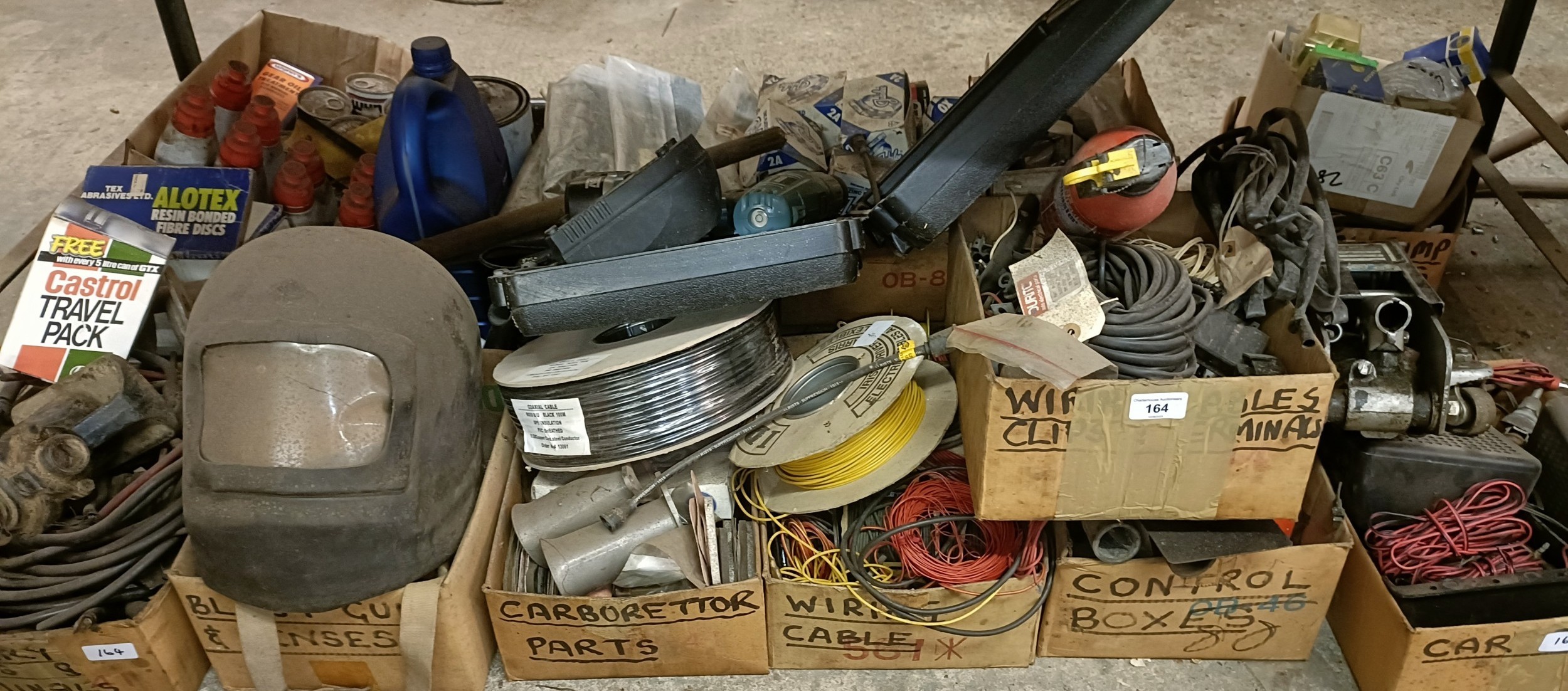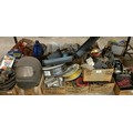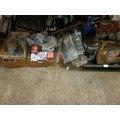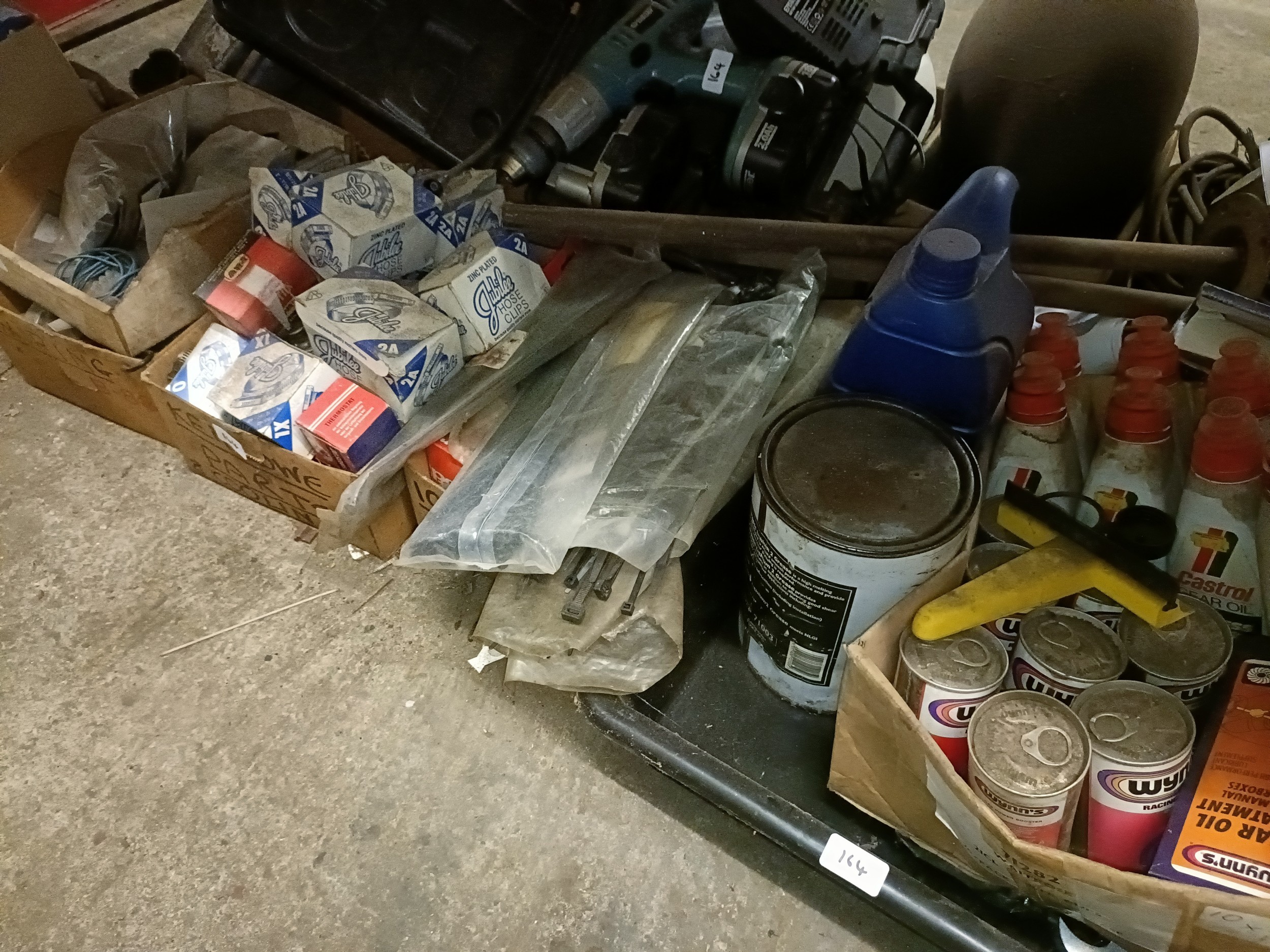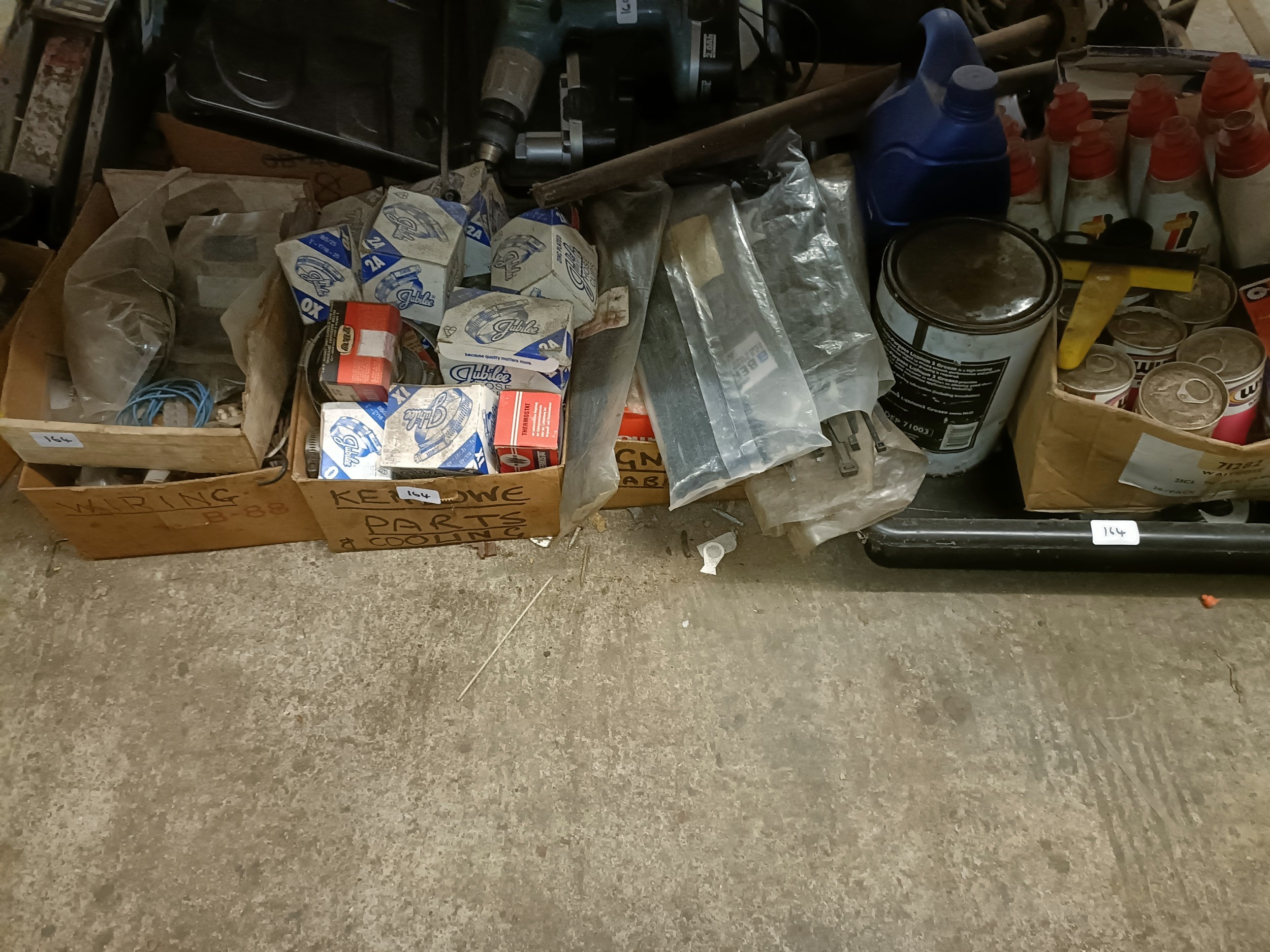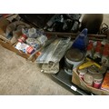 A trolley jack, assorted oil, new old stock and other parts (qty)