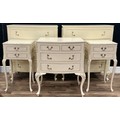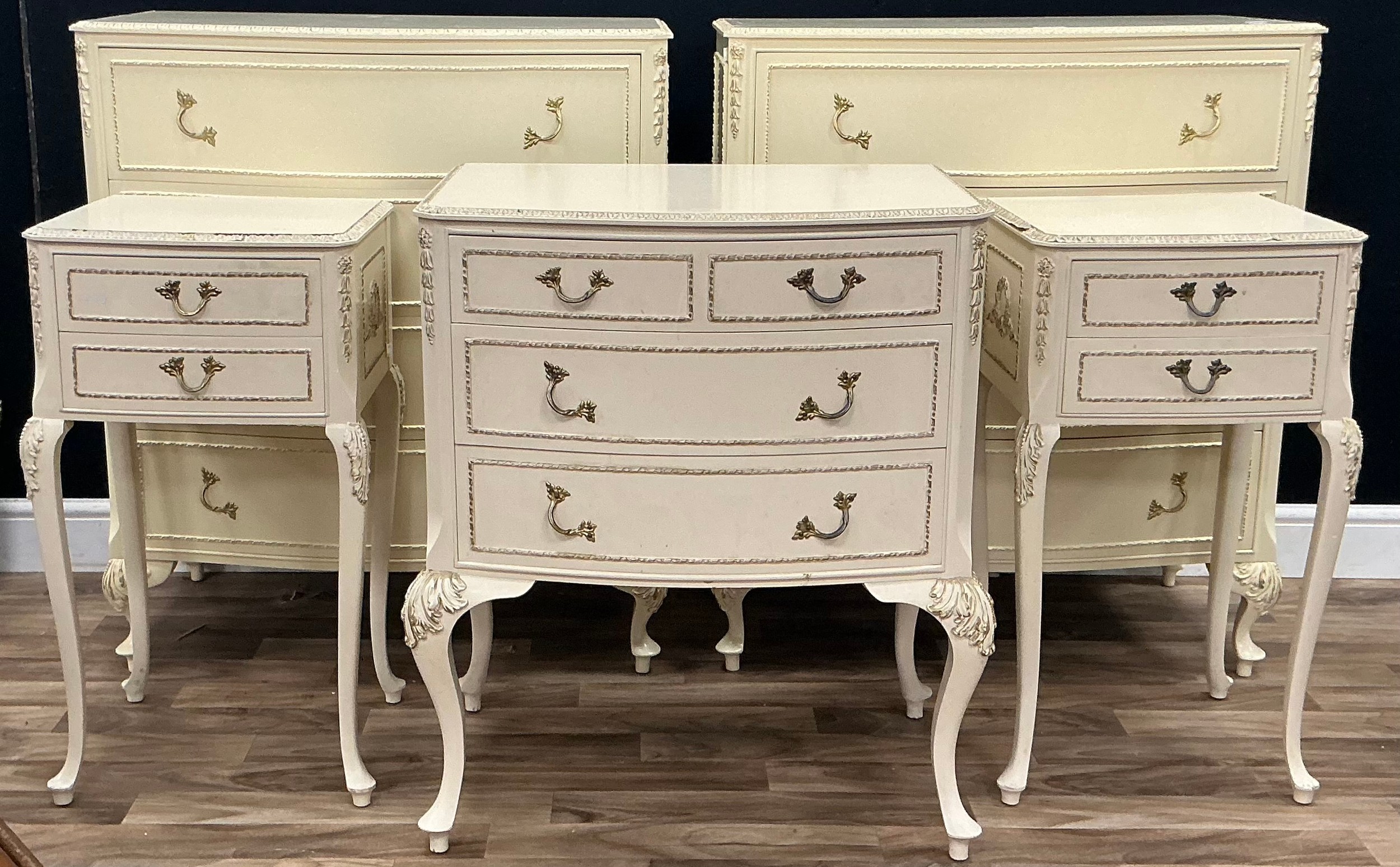 A French style part bedroom suite, comprising pair of serpentine front chests of four drawers, each 90cm high x 78cm wide; pair of bedside cabinets, 68.5cm high; and a single small chest of three drawers, (5).