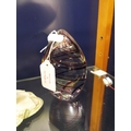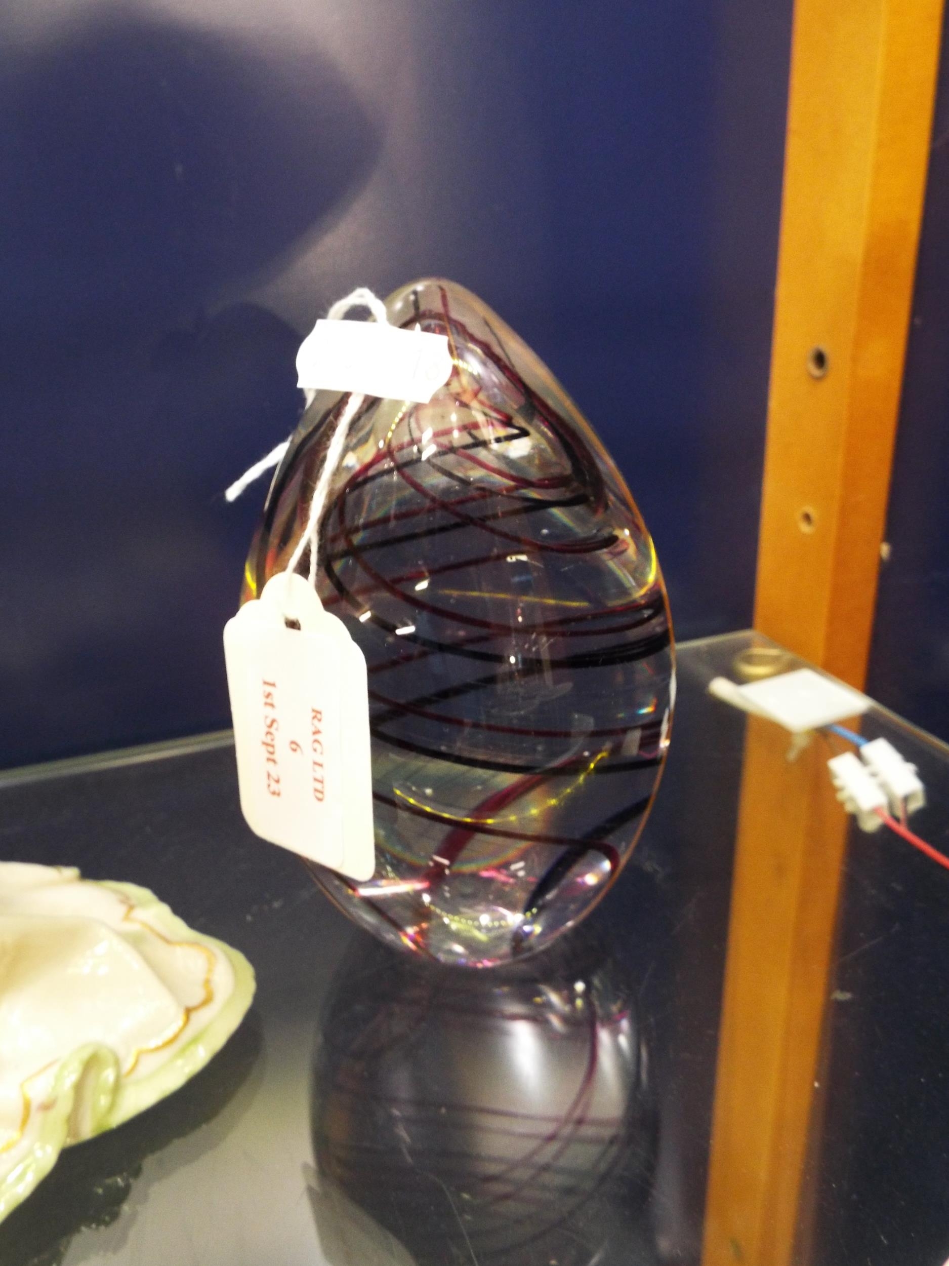A large glass egg shaped paperweight with a spiral design, signed