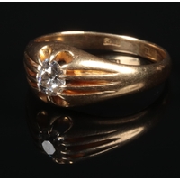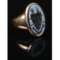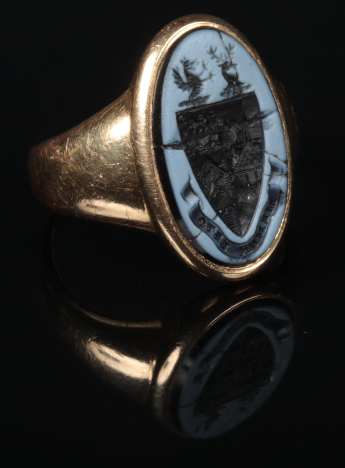 A gentleman's 18 carat gold seal ring. With carved hardstone armorial crest having Latin inscription Memor Esto (be mindful), 8.8 grams gross, size N.