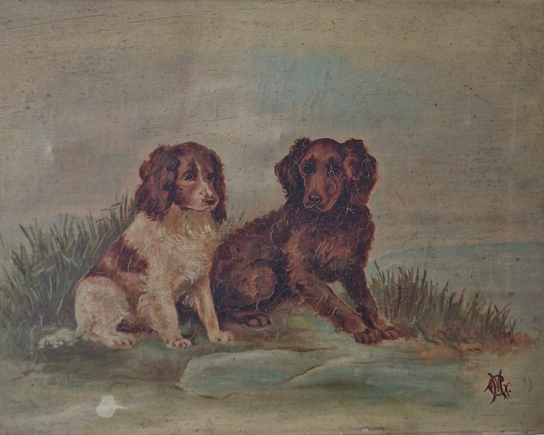 Early 1900s oil on canvas of two dogs.