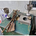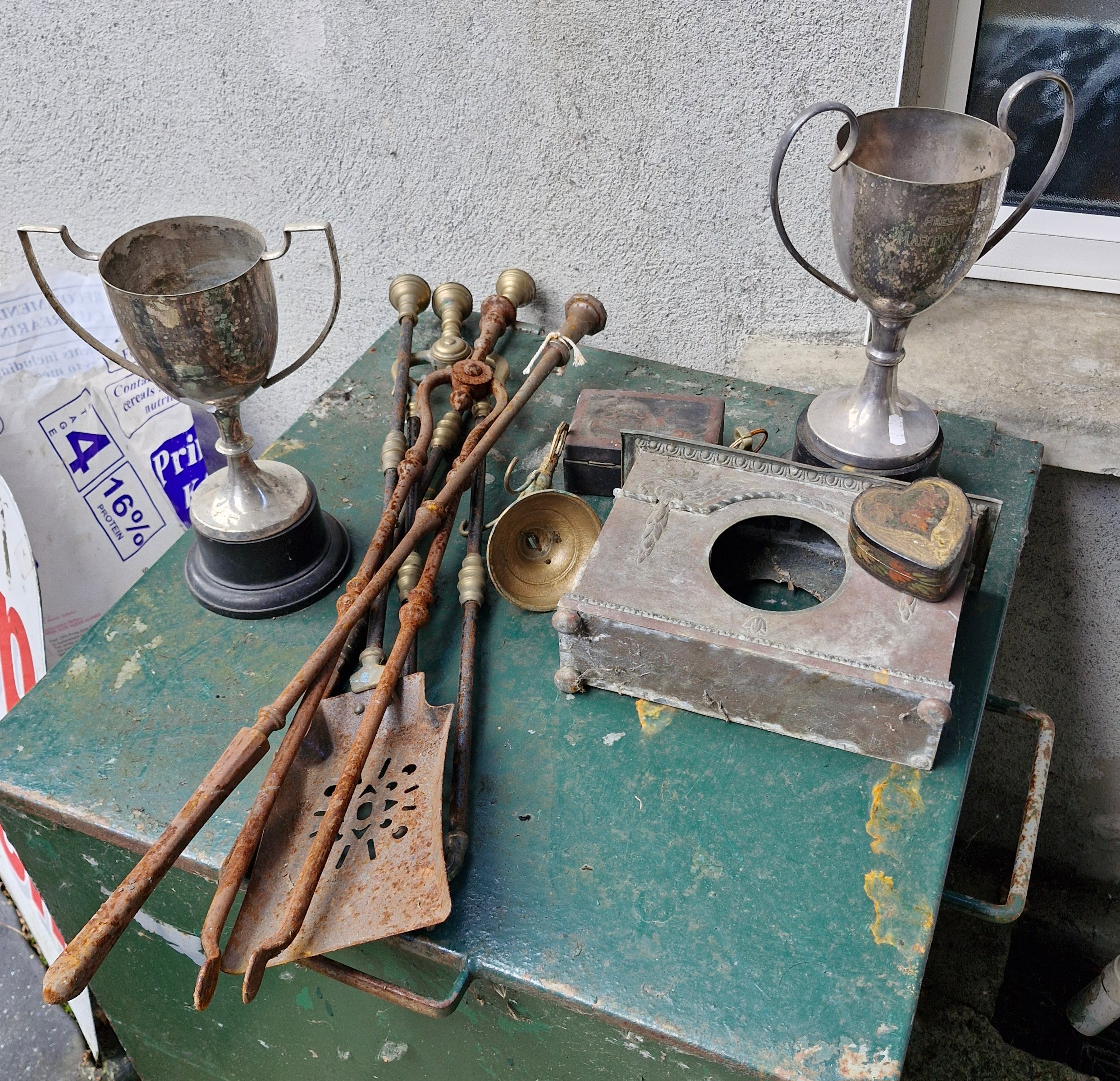 Mixed lot Victorian fire furniture brass clock hood trophies etc.
