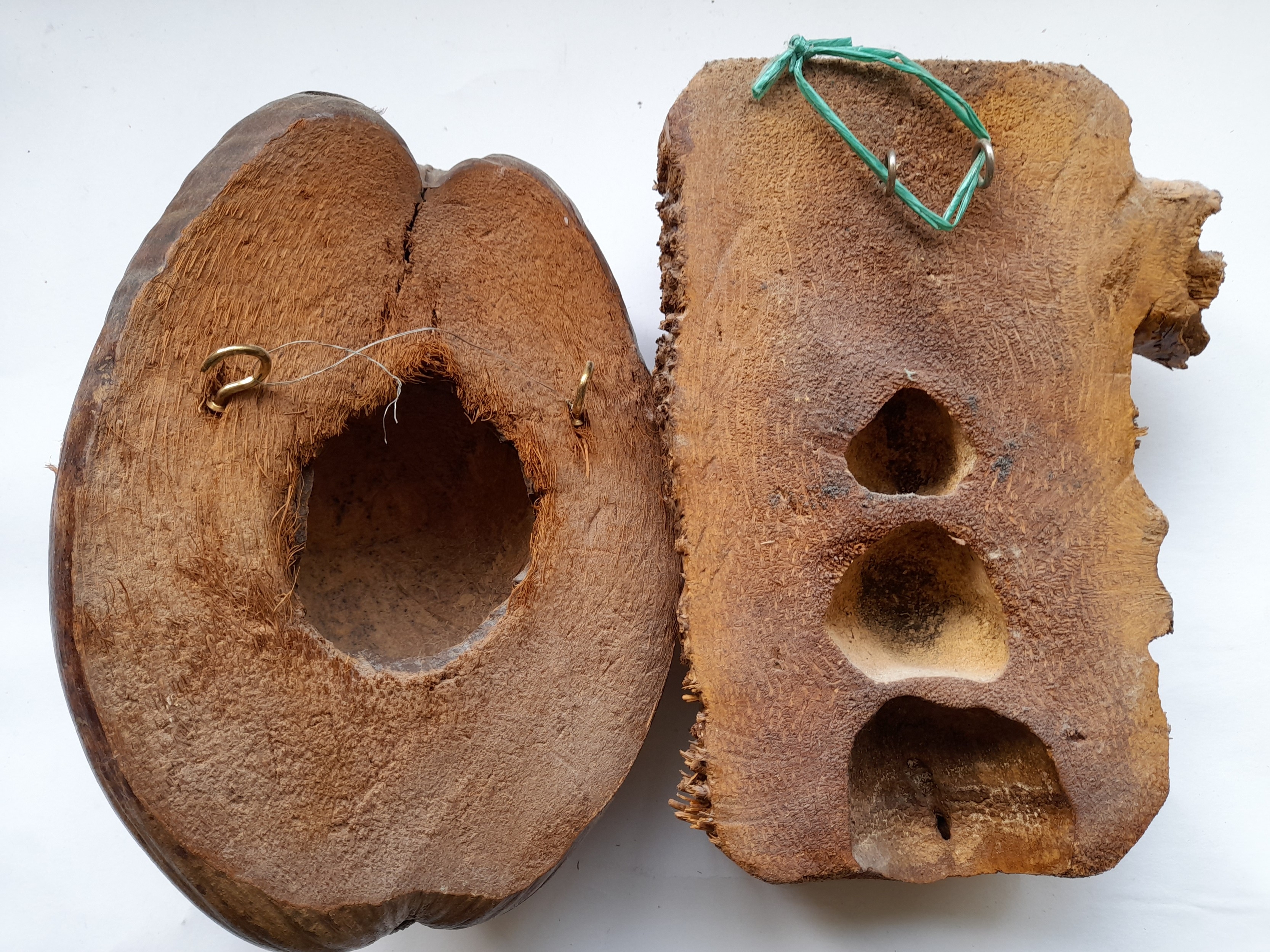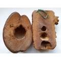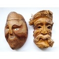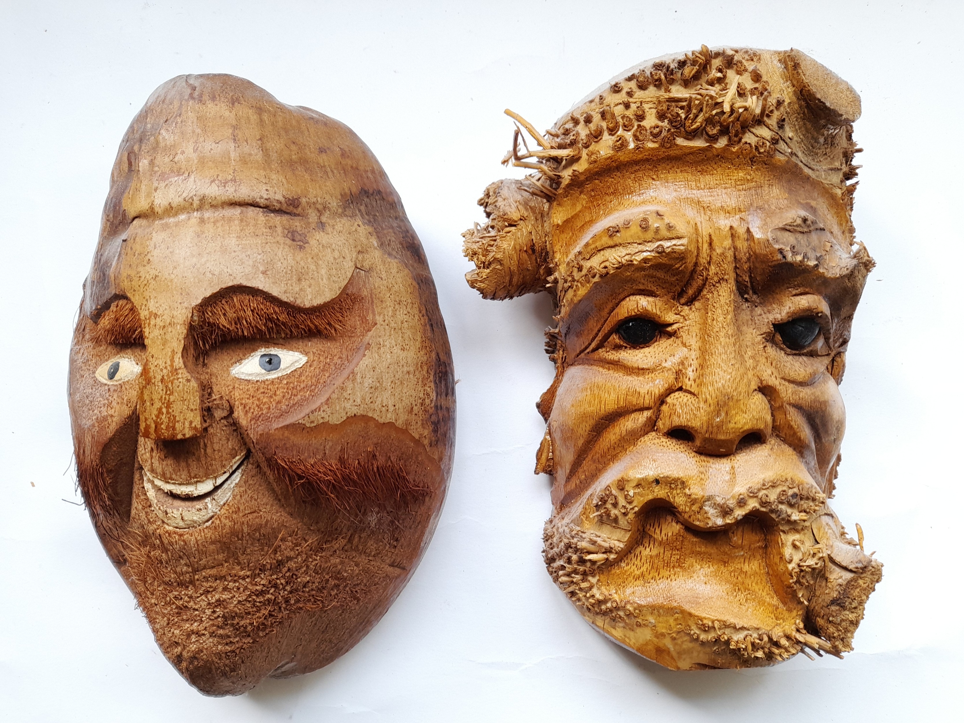 2 x carved Faces, 1 from a Coconut both approx 23cm long