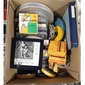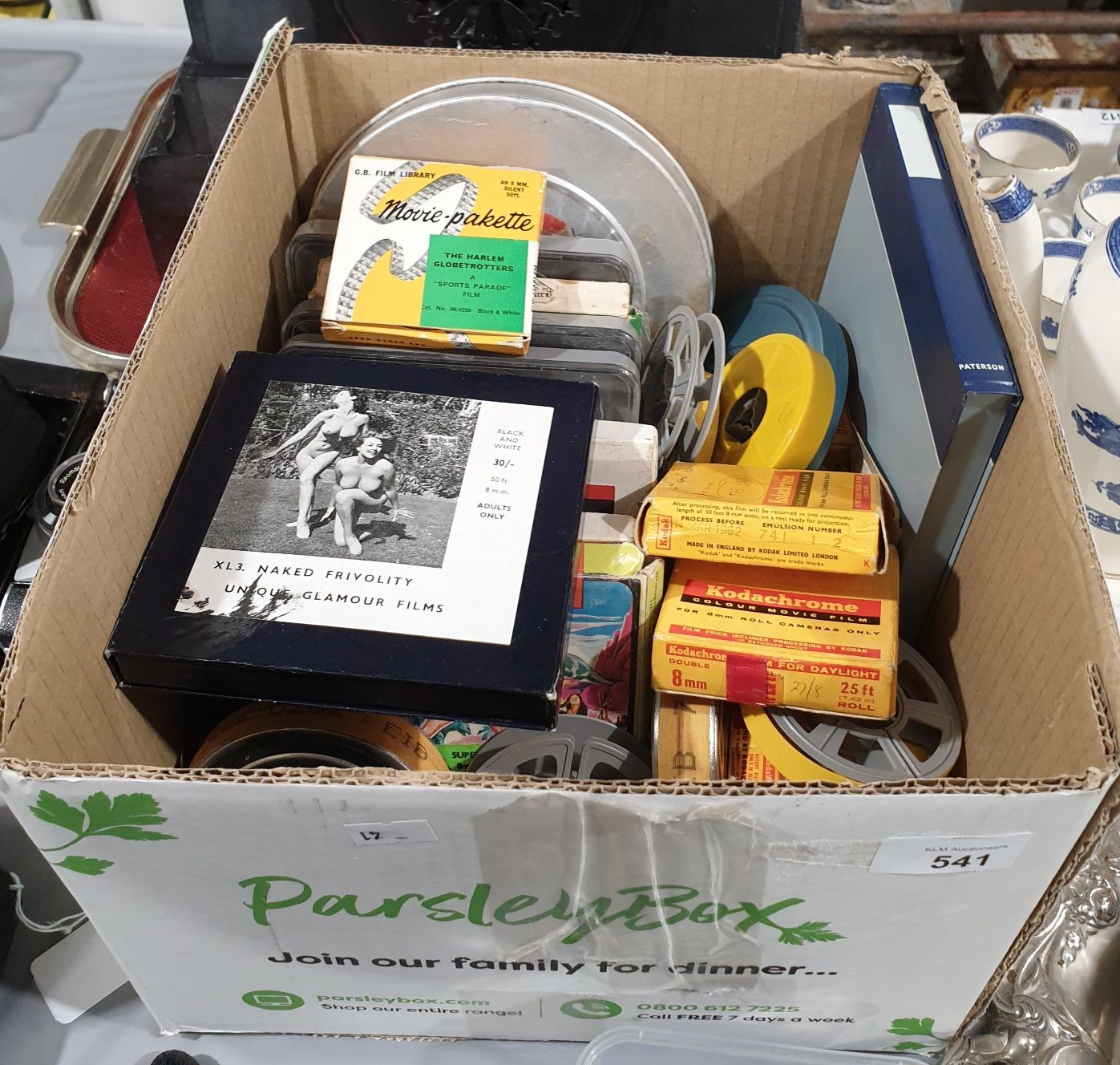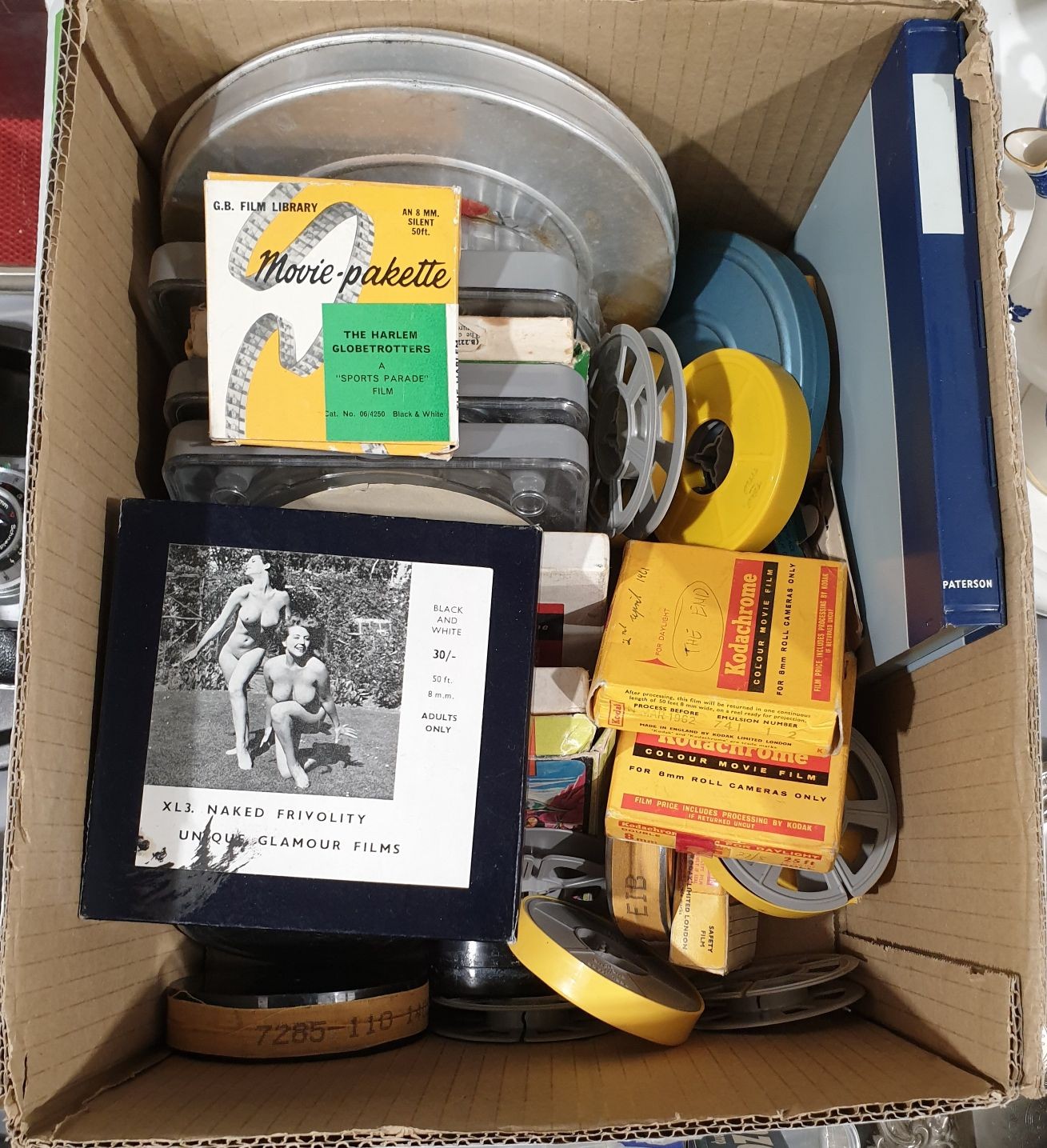 A box of 8mm film stock and films including The Harlem Globe Trotters.