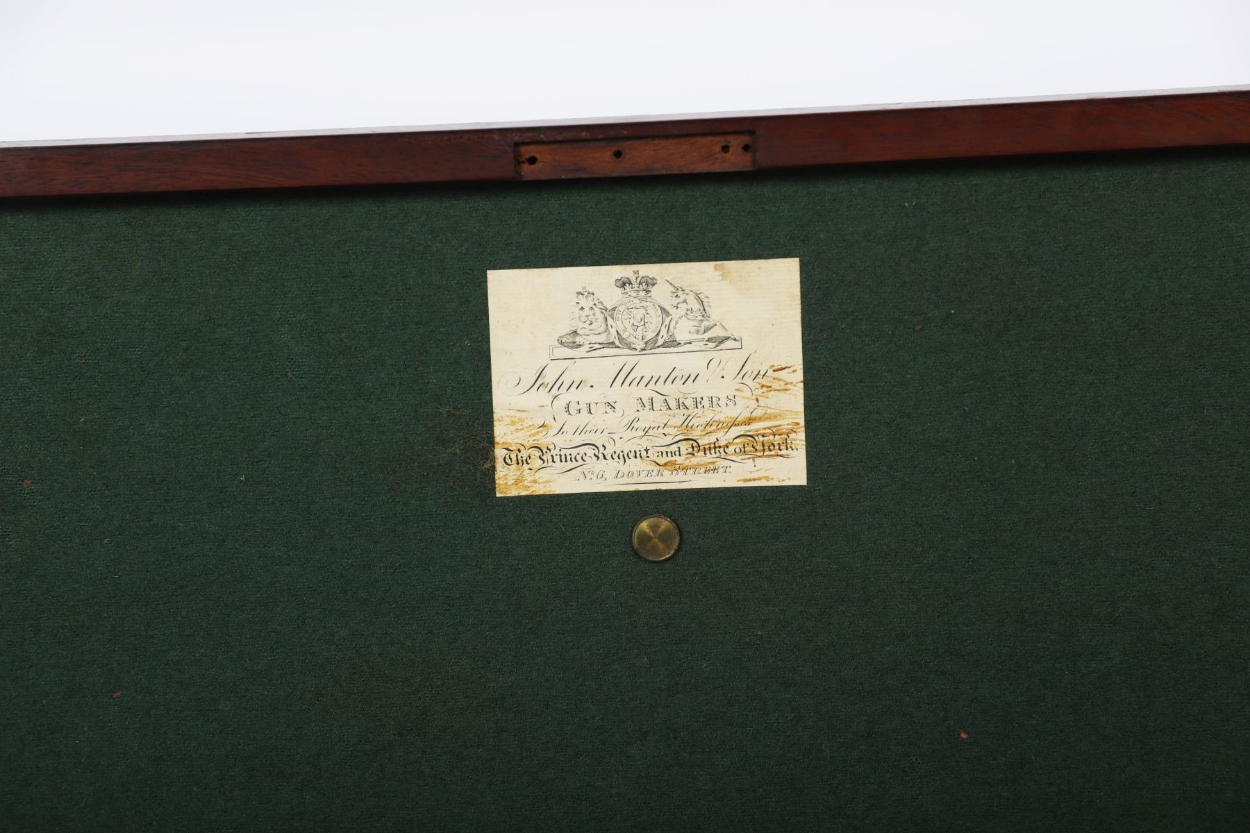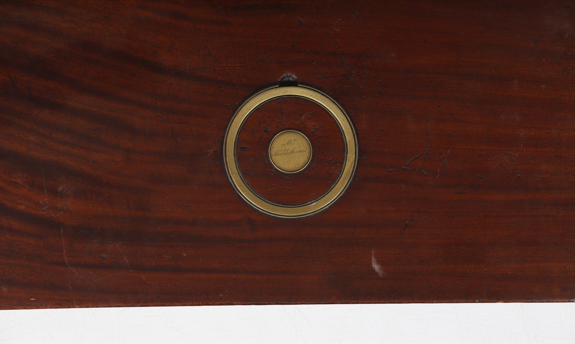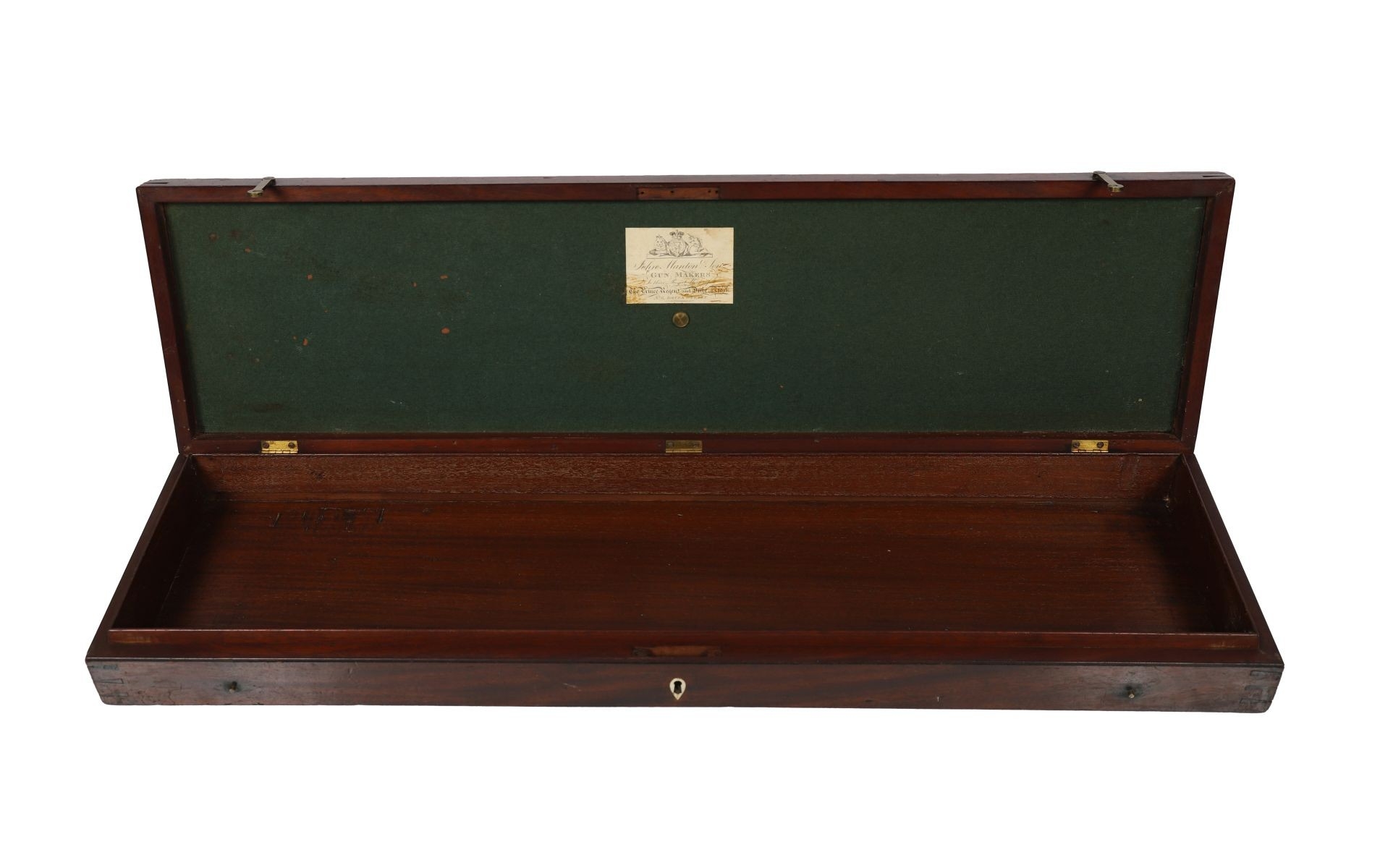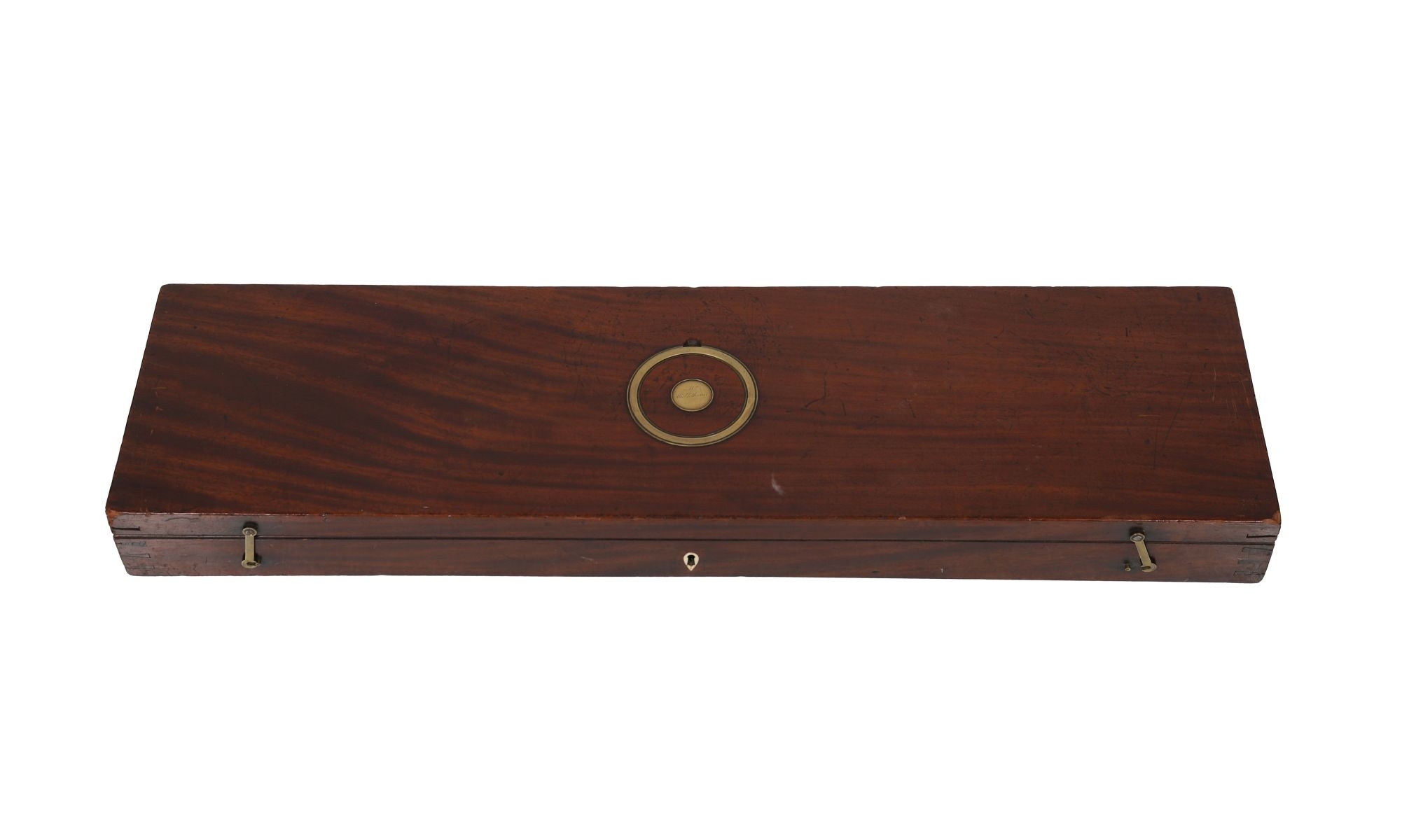 A Georgian mahogany gun box, the hinged top with brass inlay and circular plaque engraved ?Mrs Micklethwait?, opening to a fitted interior. 8 cm. high; 86 cm. wide; 27 cm. deep FURNITURE Tuesday 25th November 2025 10:31:12