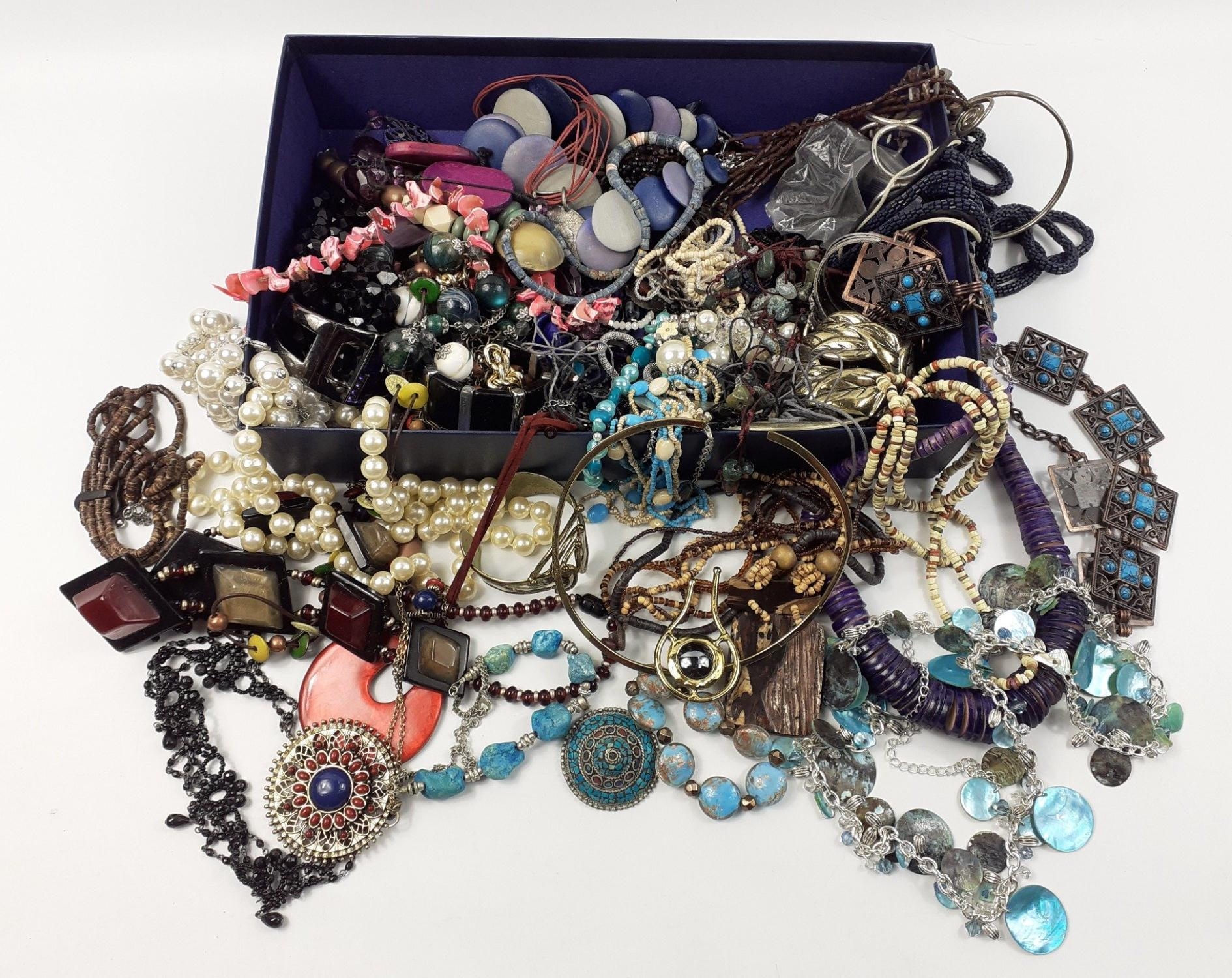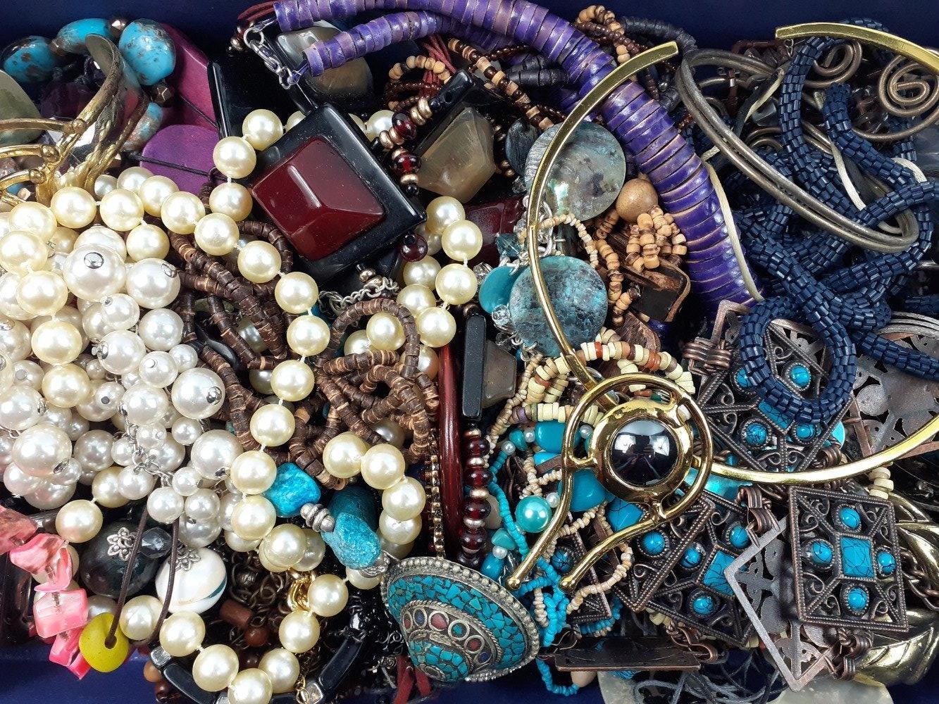 A box of a jumble of costume necklace. Definitely worth a rummage.