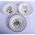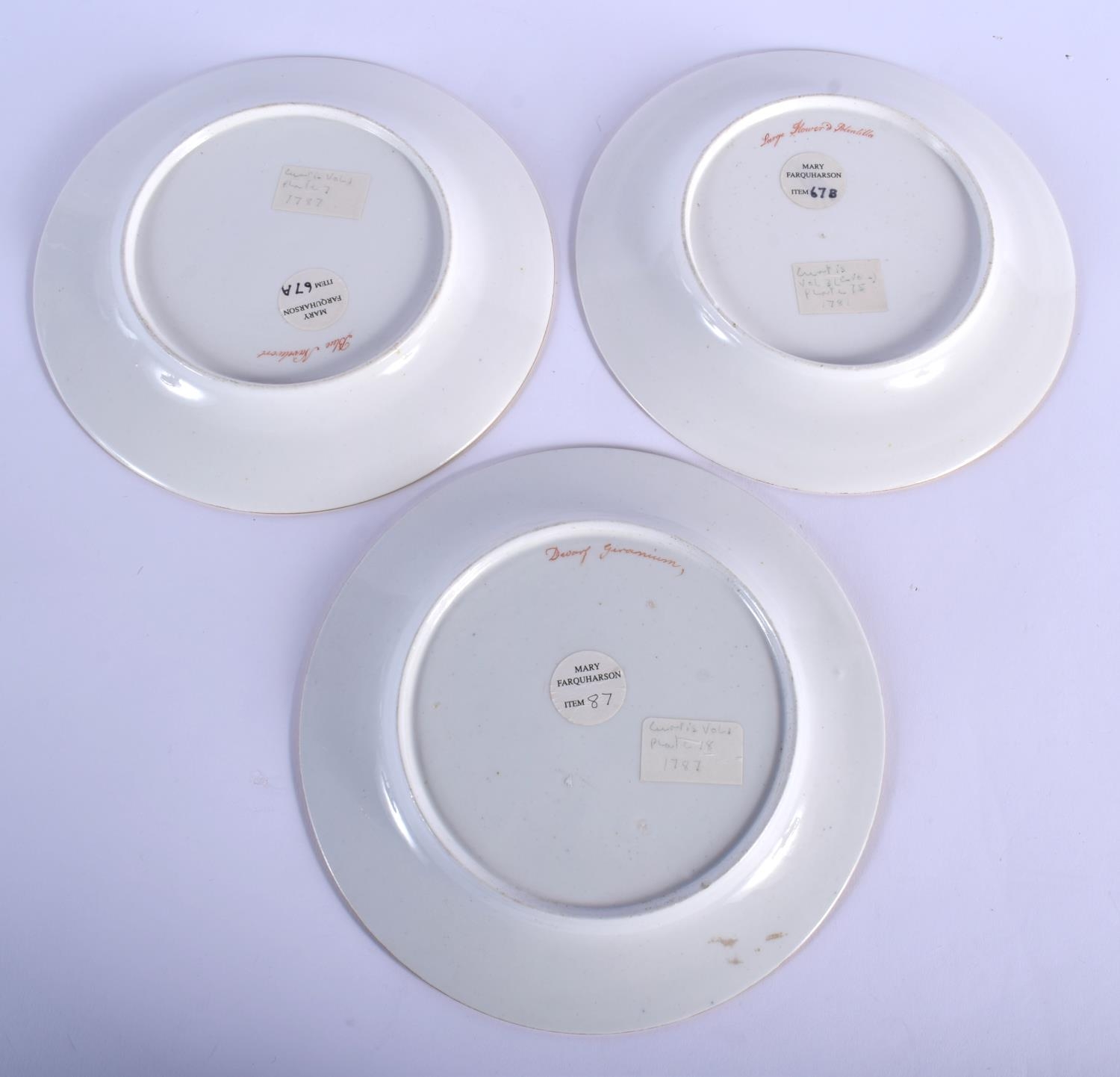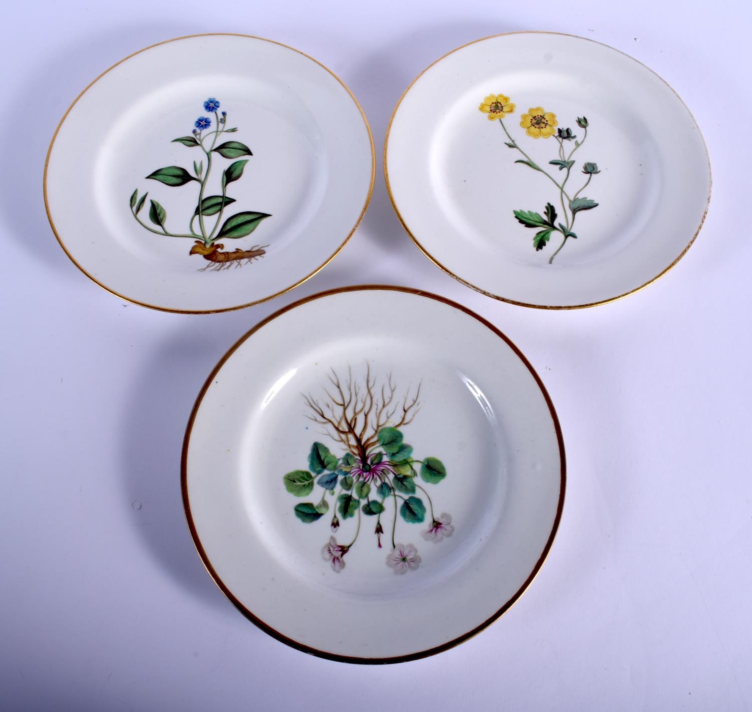 ENGLISH PORCELAIN, PROBABLY SPODE, BOTANICAL PLATES PAINTED WITH BOTANICAL SPECIMEN FLOWERS, WITHIN GOLD RIMS, TITLED ON THE BACK IN RED 'DWARF GERANIUM, BLUE NAVELWORT AND LARGE FLOWERED POTENTILLA. PROVENANCE MARY FARQUHARSON COLLECTION. 22cm diameter (3)