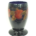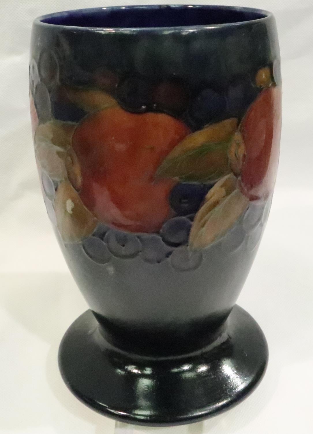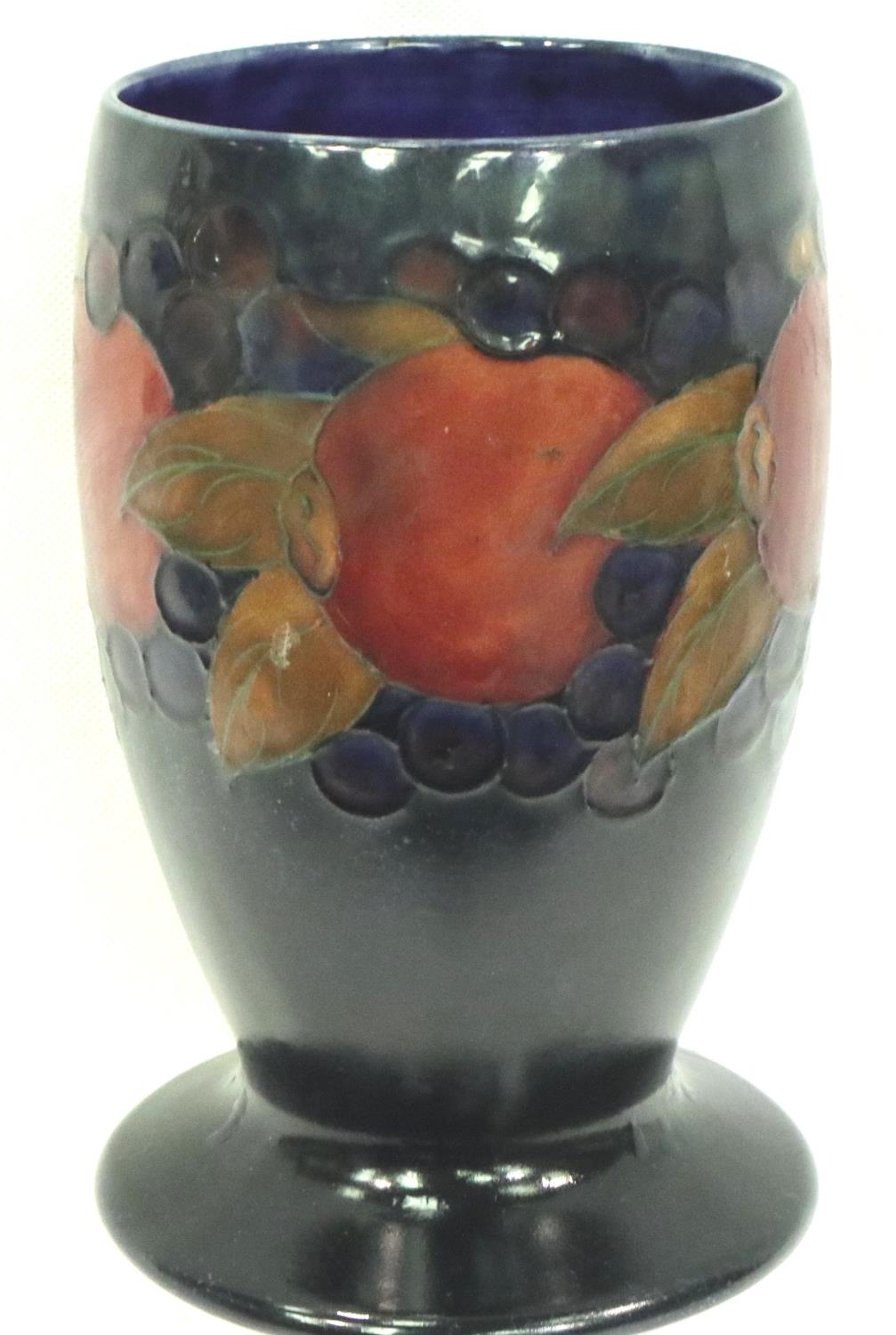 Large Moorcroft blue ground vase in the Pomegranate pattern, H: 19 cm. Condition report: No chips or cracks, rings badly possible repair to base. P&P Group 2 (£18+VAT for the first lot and £3+VAT for subsequent lots)