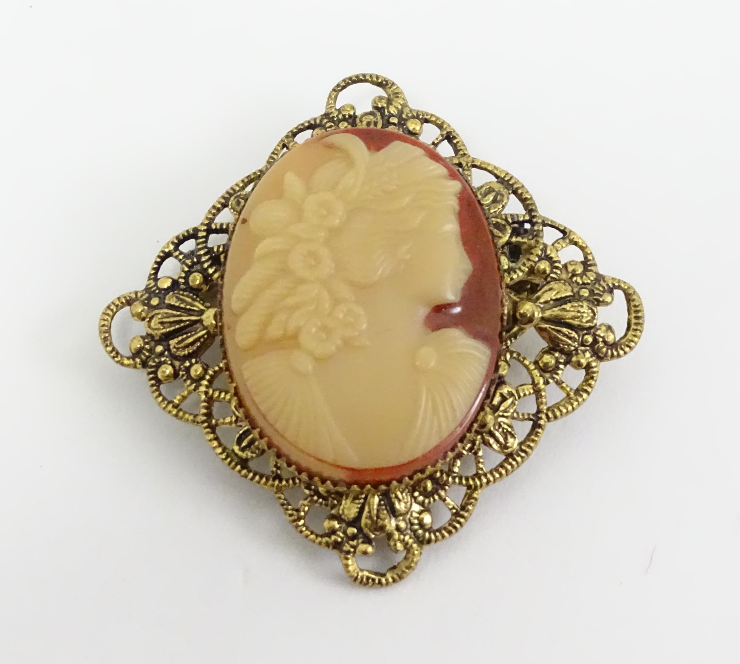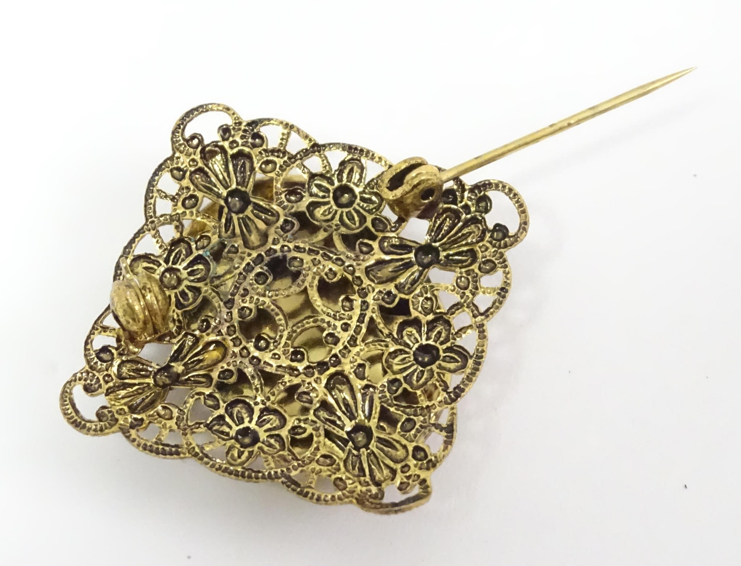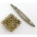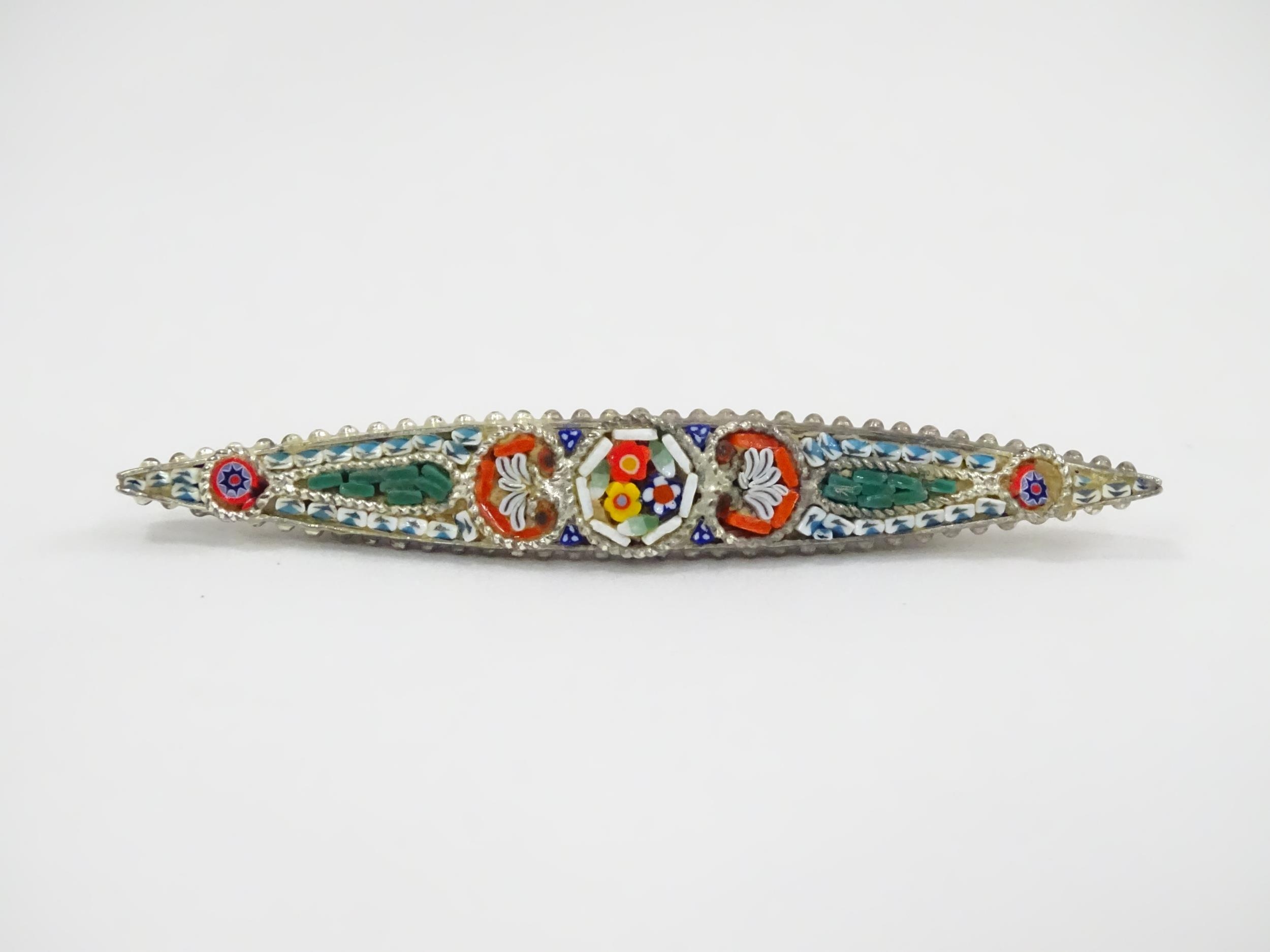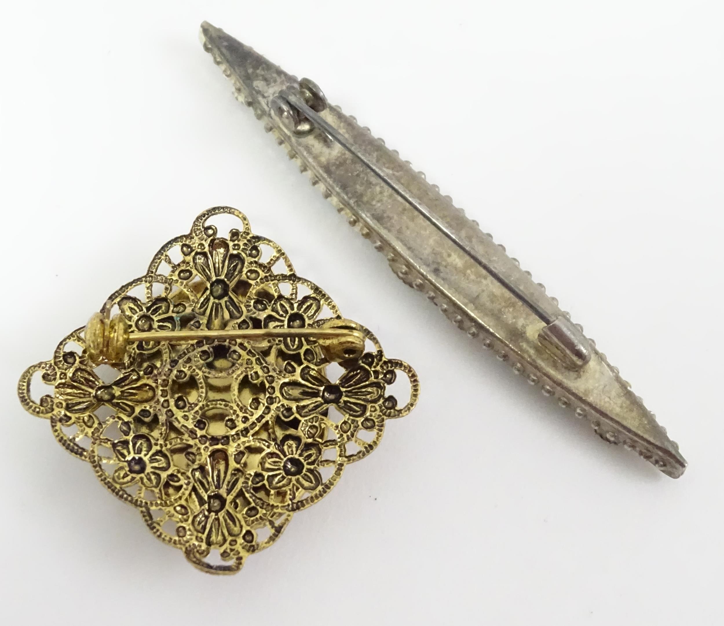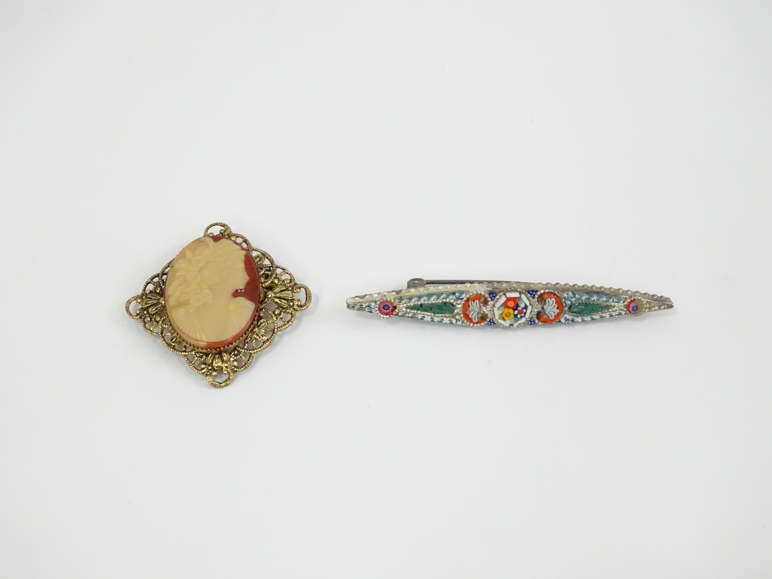 Two brooches, one with micromosaic detail, the other decorated with cameo style. Largest approx. 2 1/2" wide. (2)