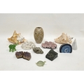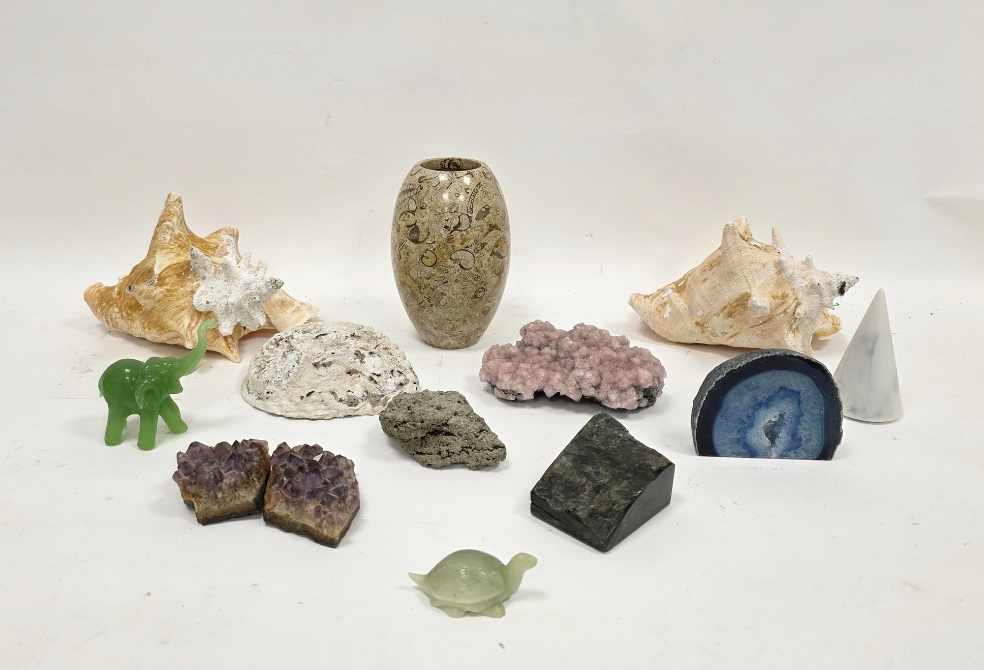 Fossilised limestone vase, 18cm high together with two Queen conch shells and another shell, two amethyst geodes, pyrite specimen, jade specimen, carved elephant and tortoise and other items