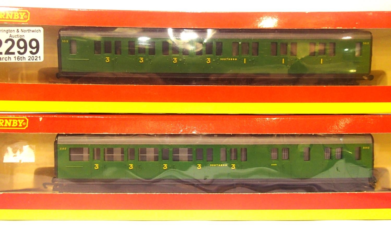 Two Hornby SR malachite green coaches R4008C Brake Third, R4009D Composite. P&P Group 1 (£14+VAT for the first lot and £1+VAT for subsequent lots)