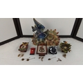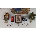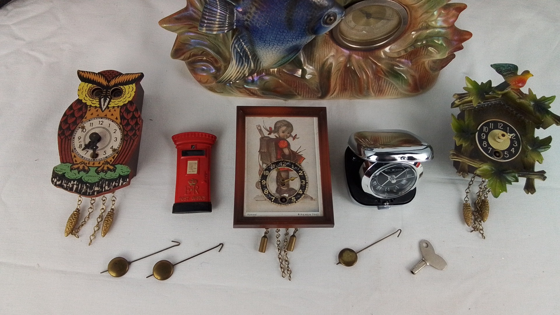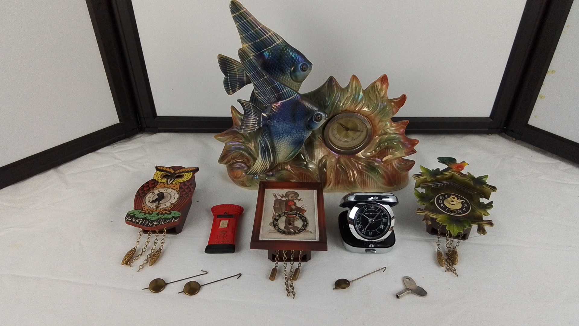 Group of five assorted timepieces, comprising a figural fish mantel clock, three novelty cuckoo-style wall clocks with pinecone weights, and a small folding travel alarm clock, with loose pendulum parts and winding key.