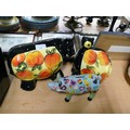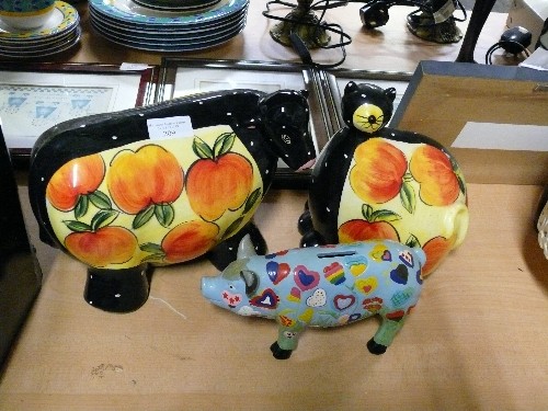 LARGE CERAMIC COW AND PIG ORNAMENT WITH FRUIT DETAIL PLUS A COLOURFUL PIG MONEY BOX