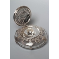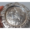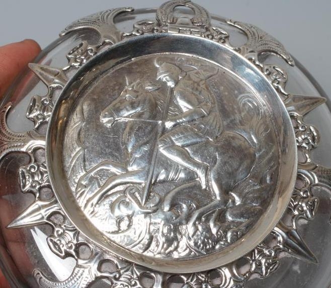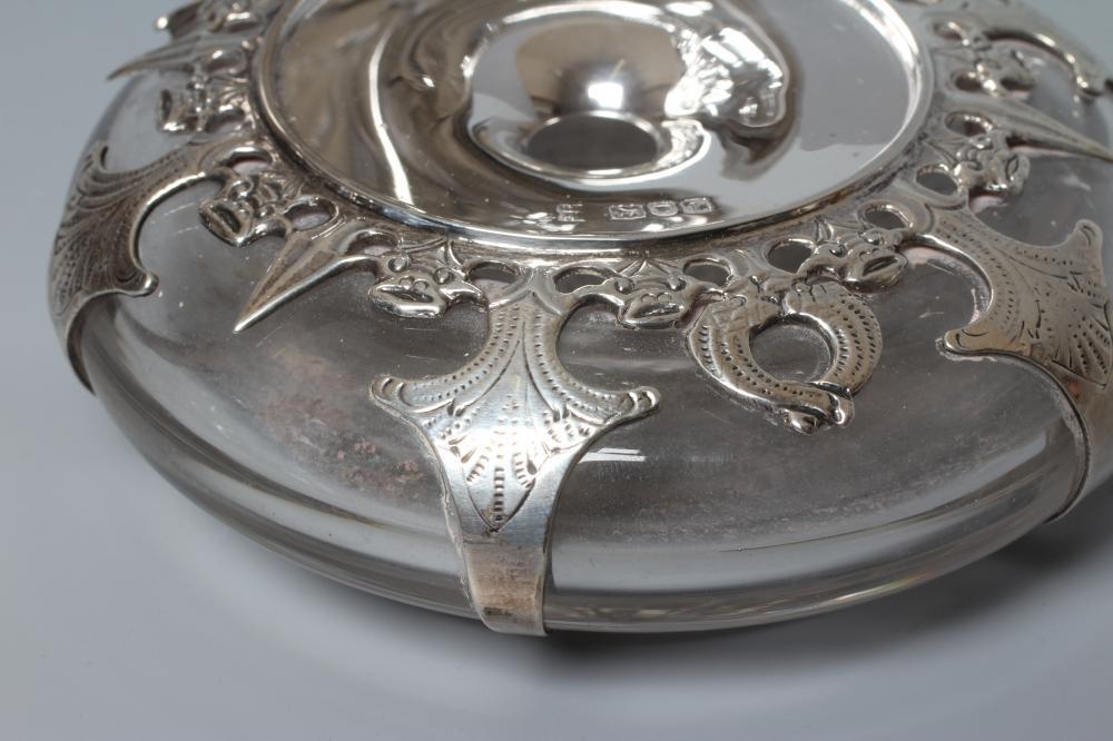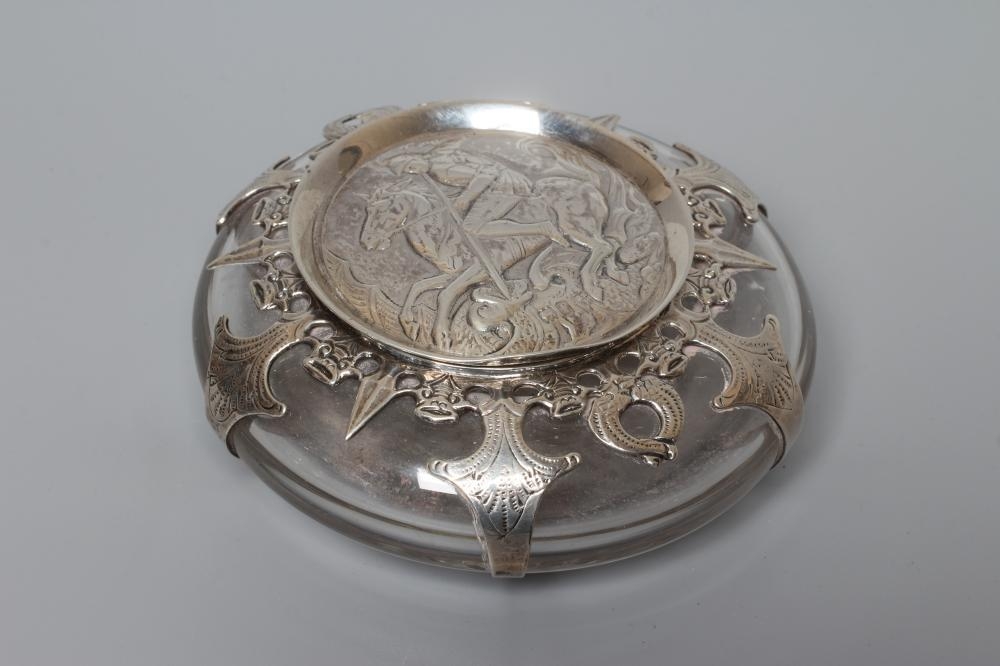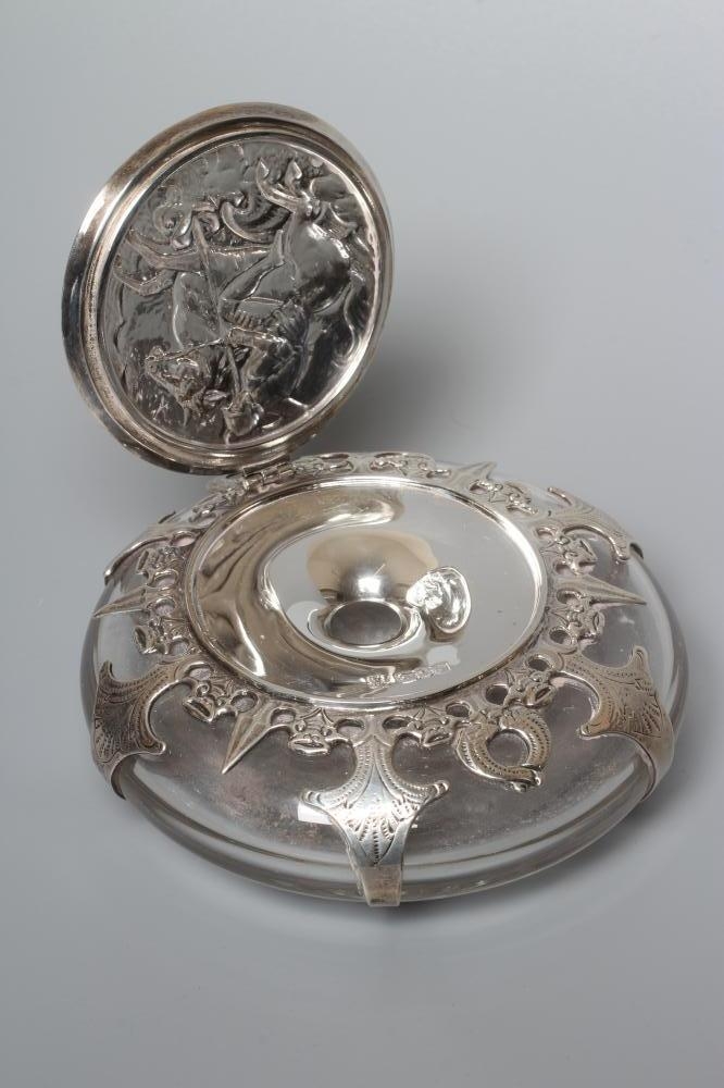 A LATE VICTORIAN SILVER MOUNTED INKWELL by Charles Stuart Harris, London 1901, the squat clear glass well with mythical mask and arrow head mount, the hinged cover chased with St George and the Dragon, well 5" diameter (Illustrated)