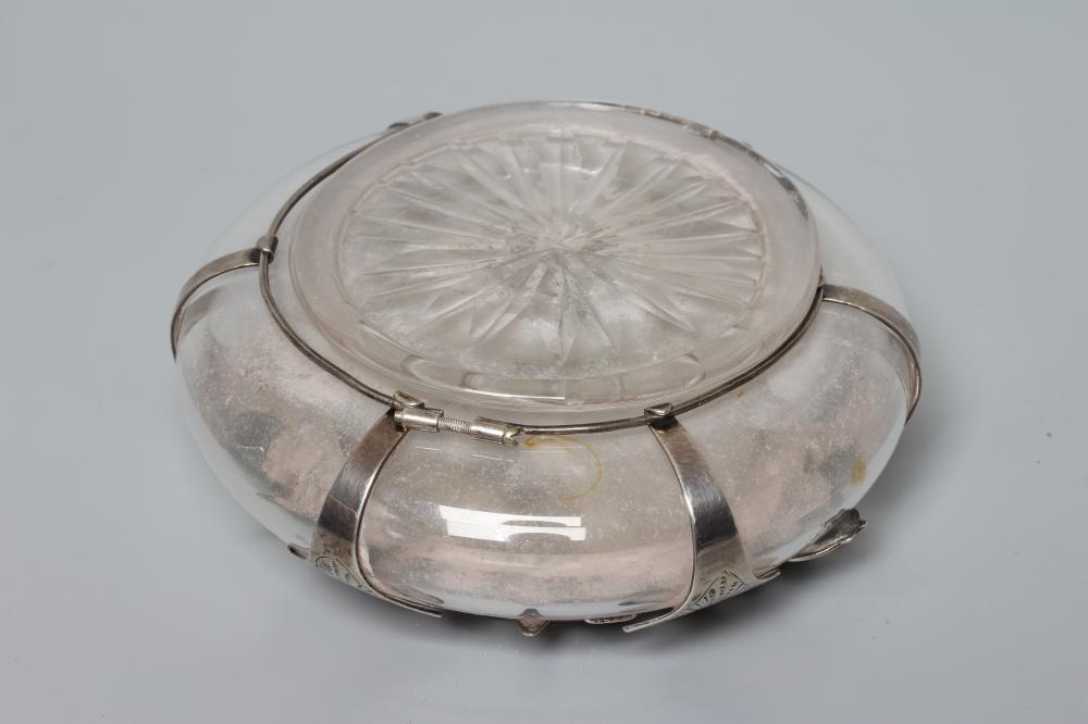 Cover 3" diameter, mount is fixed to base with a wire around footrim. Star cut base. No damage to glass. Hinge a little loose and upturned rim a little bent just under hallmarks near dragons head.