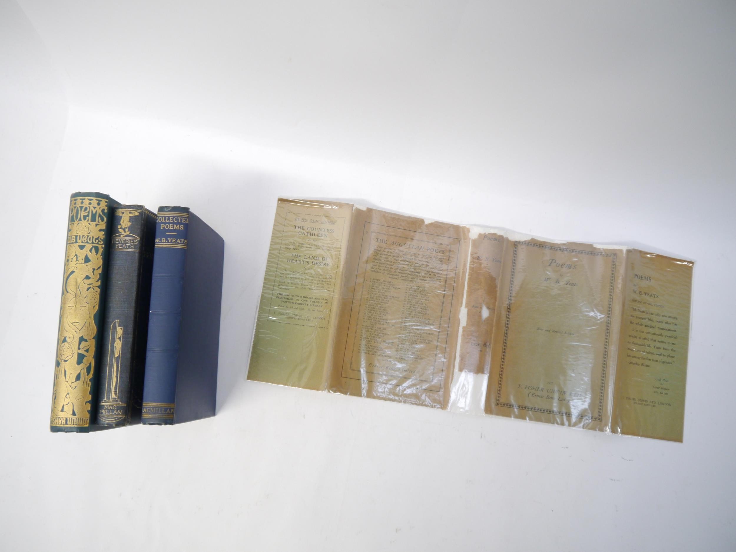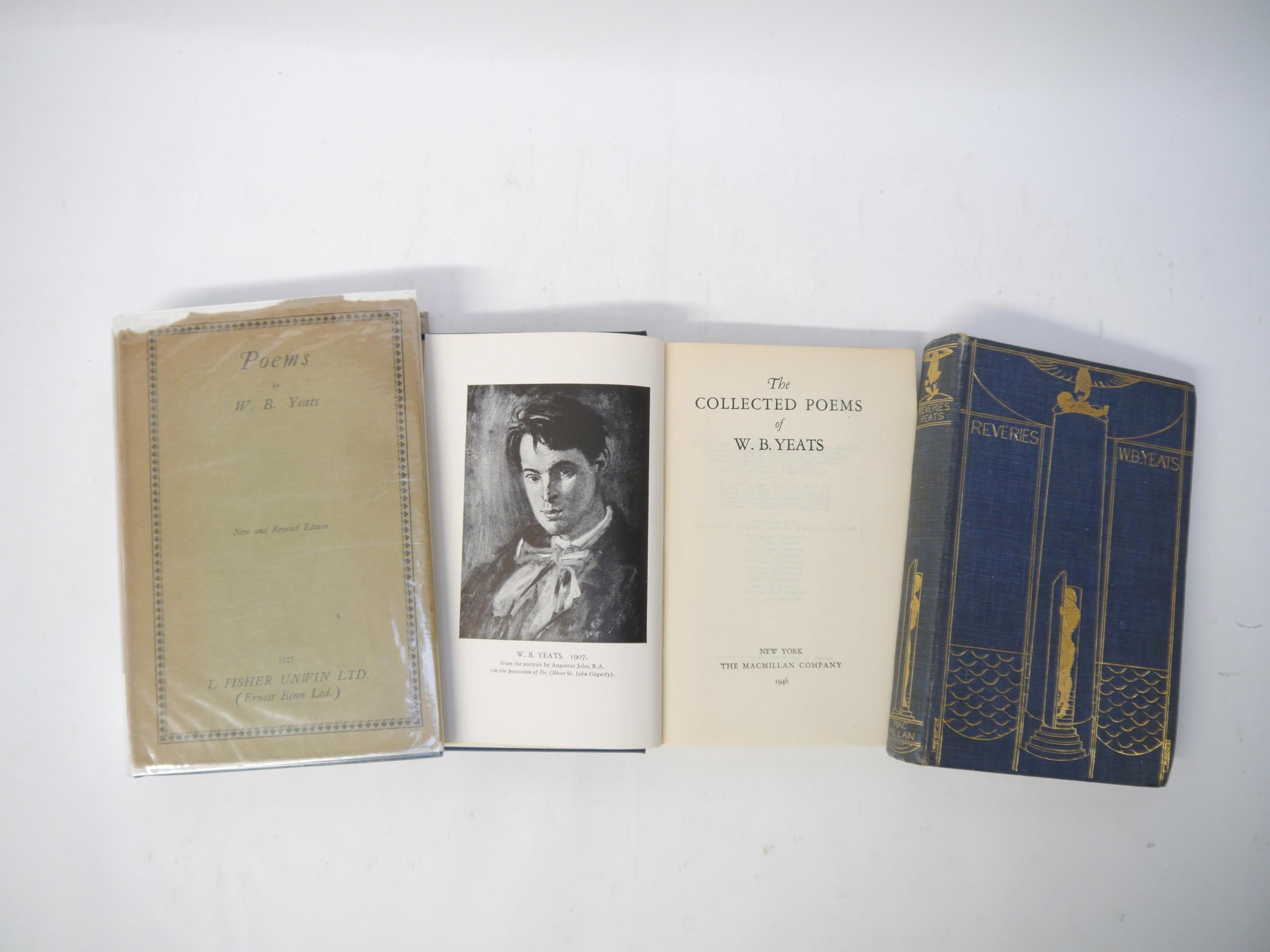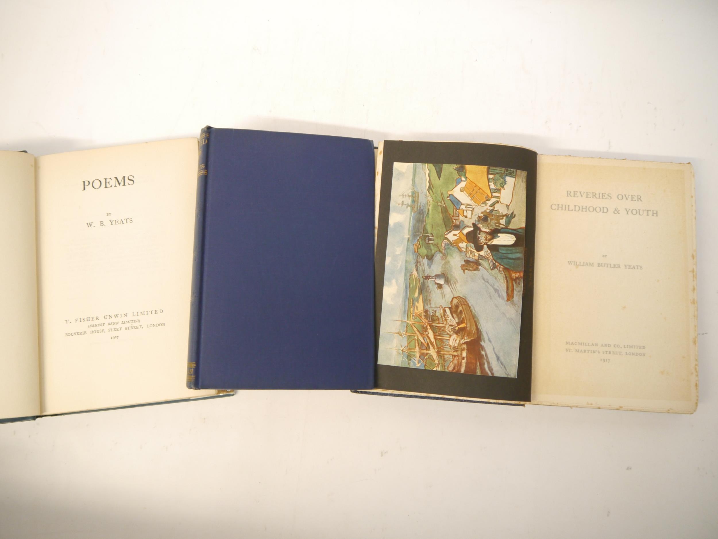 W.B. Yeats, 3 titles: 'Reveries Over Childhood and Youth', London, Macmillan, 1917, reprint (2nd printing), Jack B. Yeats "Memory Harbour" mounted colour frontispiece, plus 2 portrait plates of John Butler Yeats and Mrs Yeats as called for, original pictorial cloth gilt by Thomas Sturge Moore, 'Poems', L, T. Fisher Unwin, 1927, new and revised edition, original cloth with gilt decorated spine, dust wrapper, plus 1 other William Butler Yeats (3)